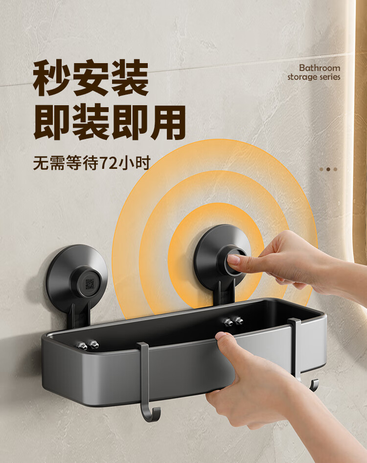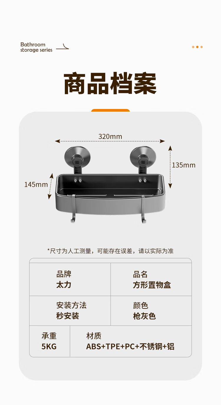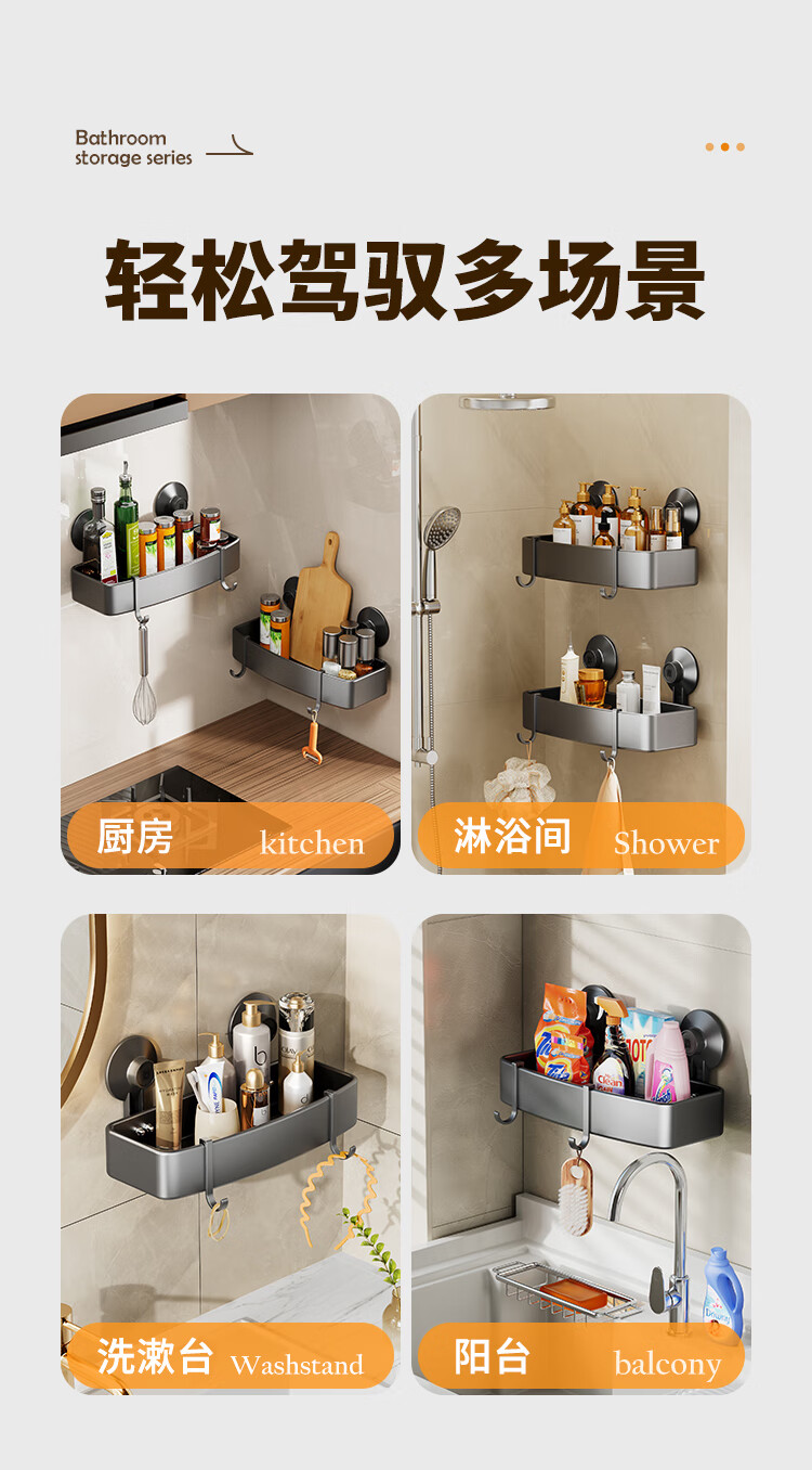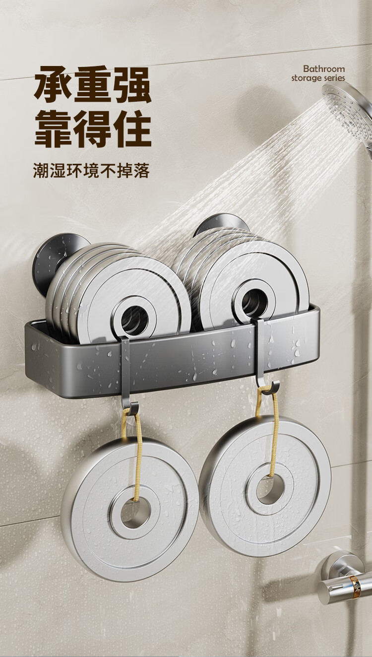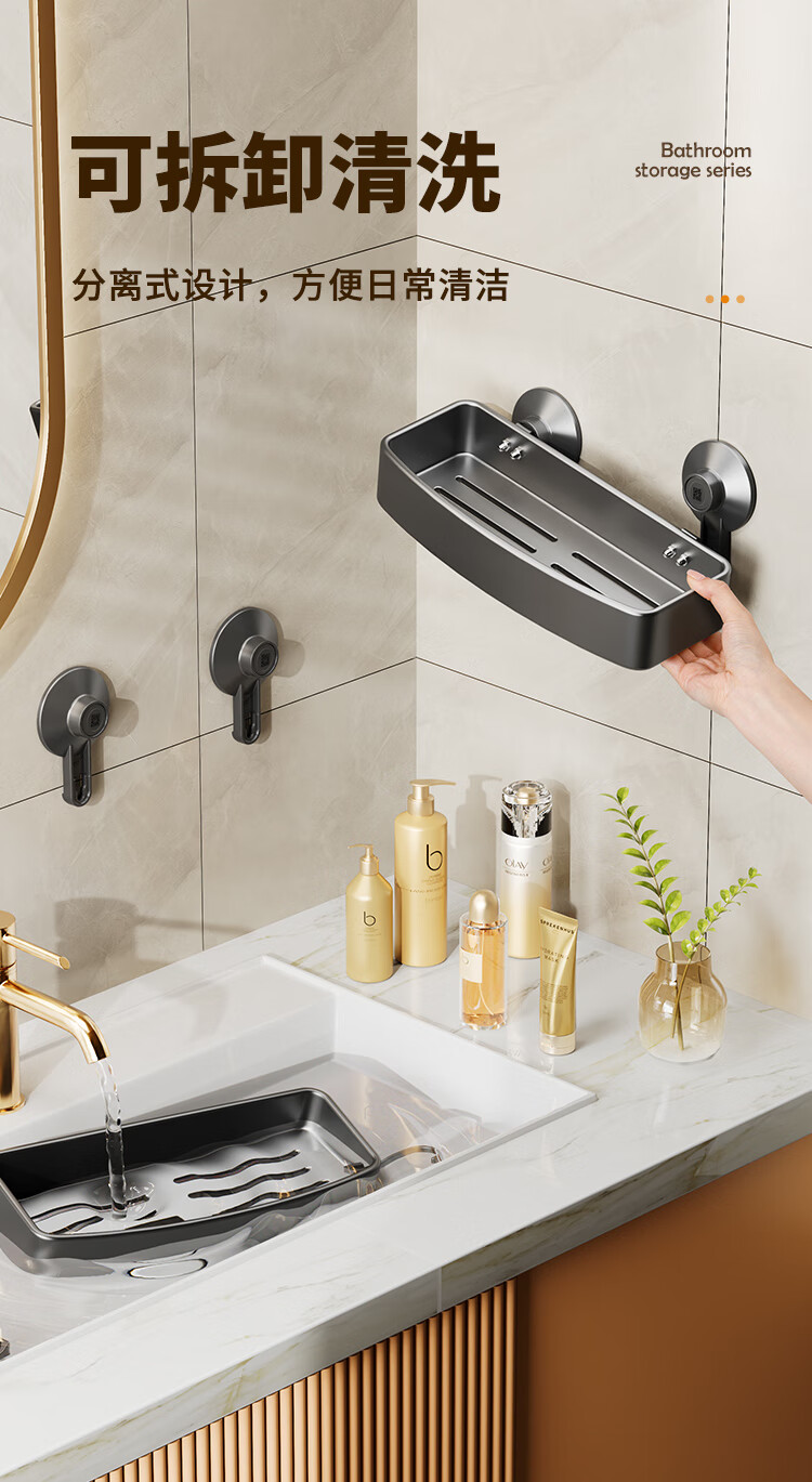 太力吸盘挂式卫生间置物架免打孔浴室墙上厕所马桶洗漱台厨房壁挂架 方形置物架【枪灰色1个装】
