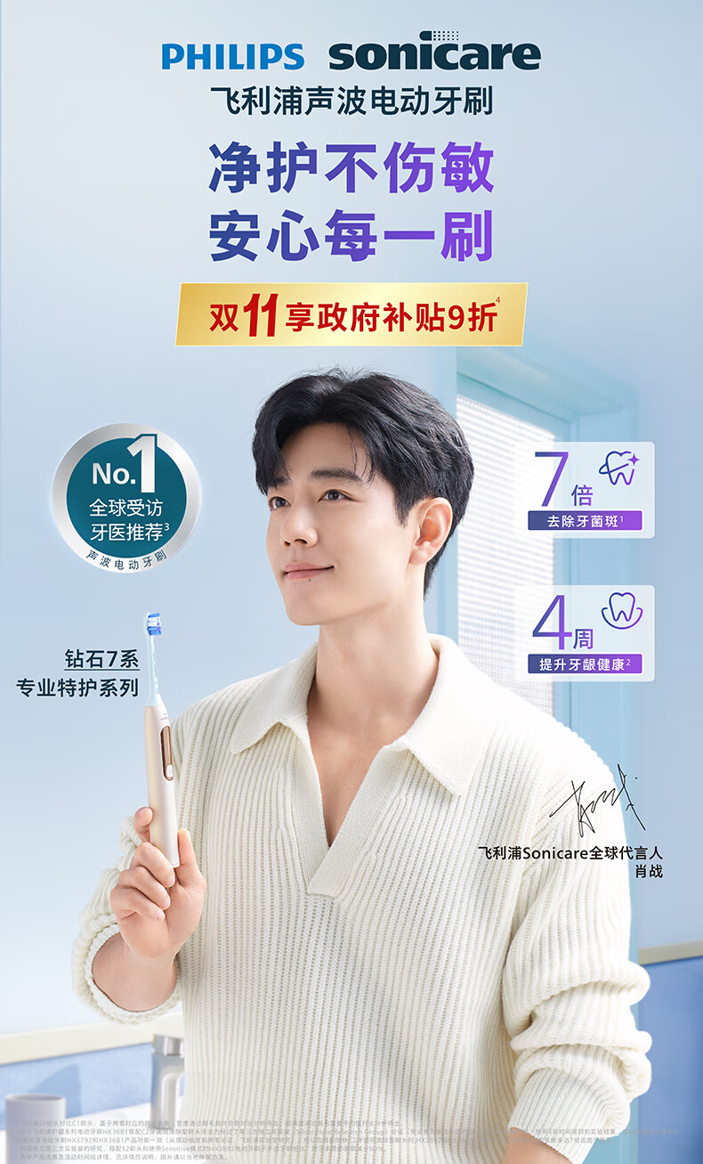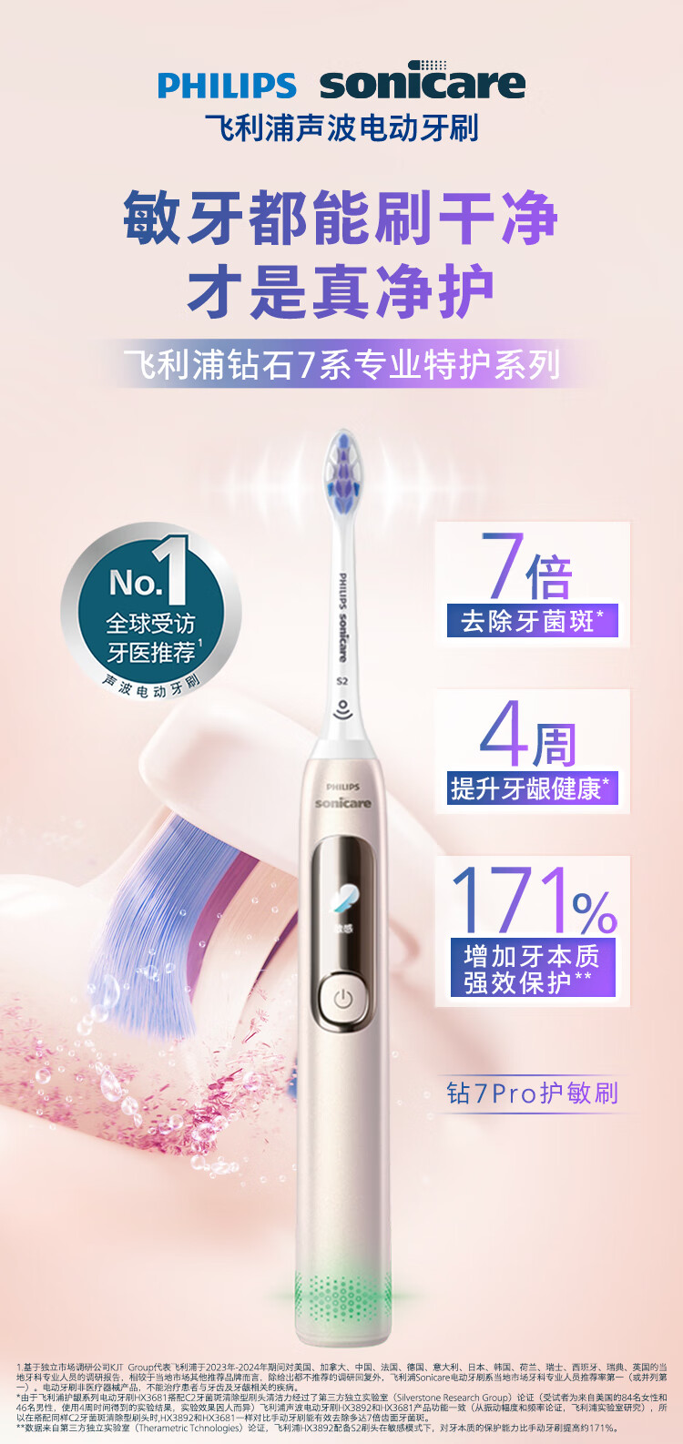 飞利浦(PHILIPS)【肖战同款】电动牙刷钻石7系Pro 护敏刷棉花糖刷头 情侣款送男生/女友 生日礼物 曙光金 国家补贴