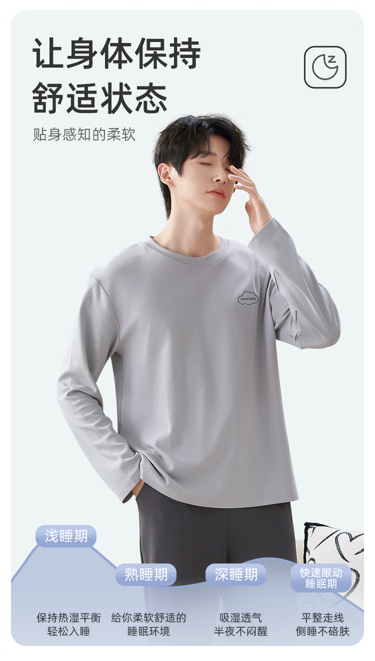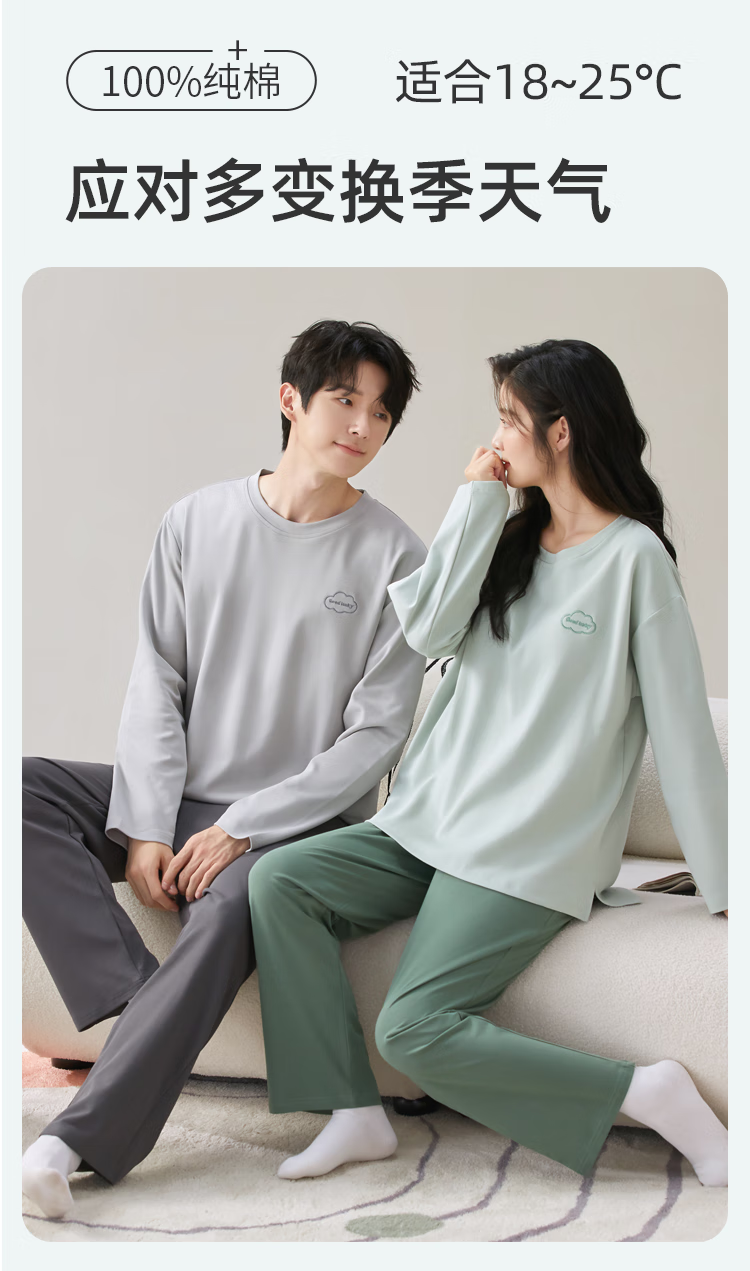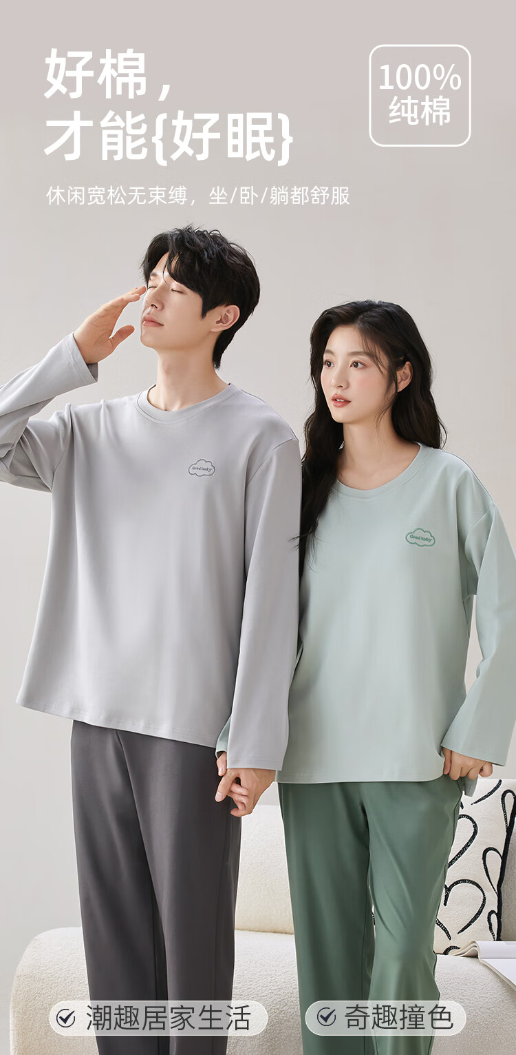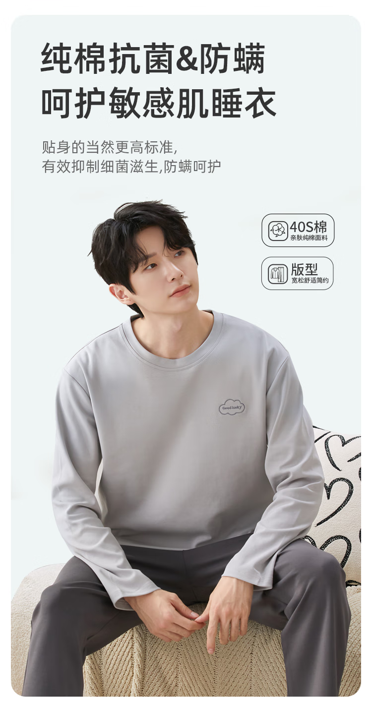 猫人情侣睡衣男纯棉抑菌防螨简约撞色风家居服云雾灰XL
