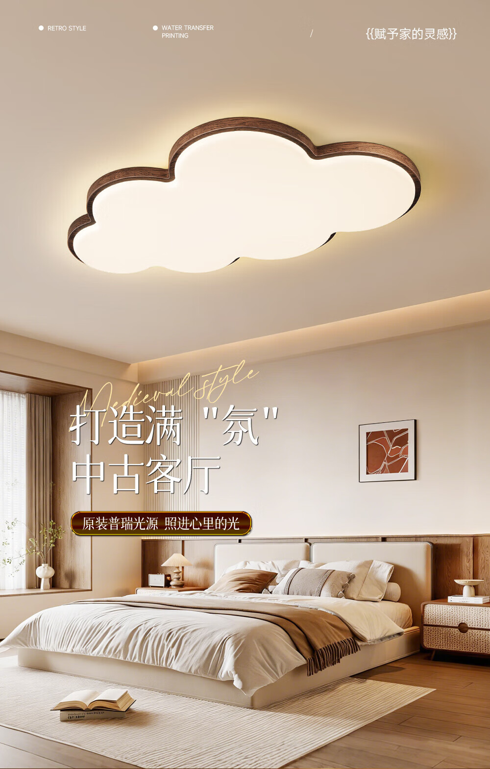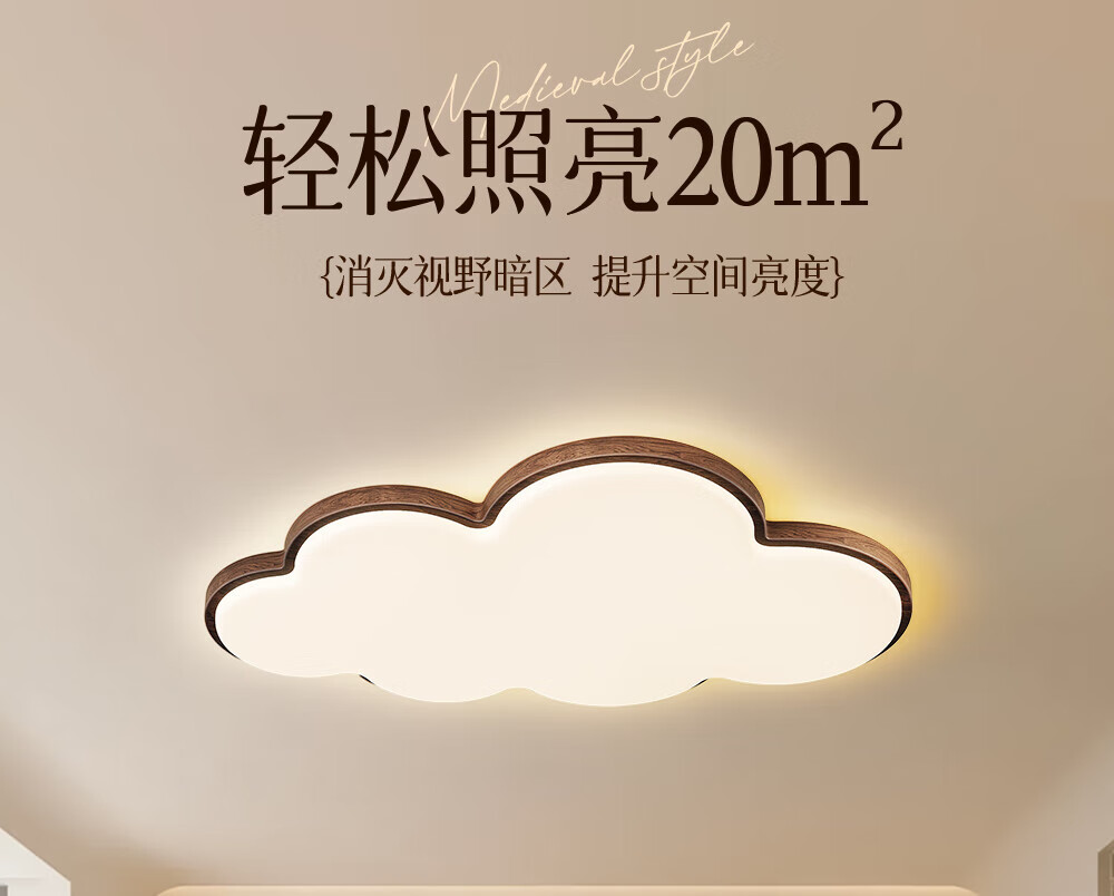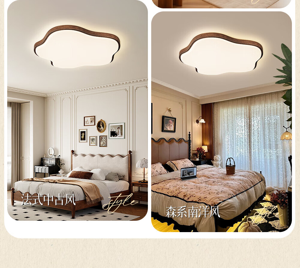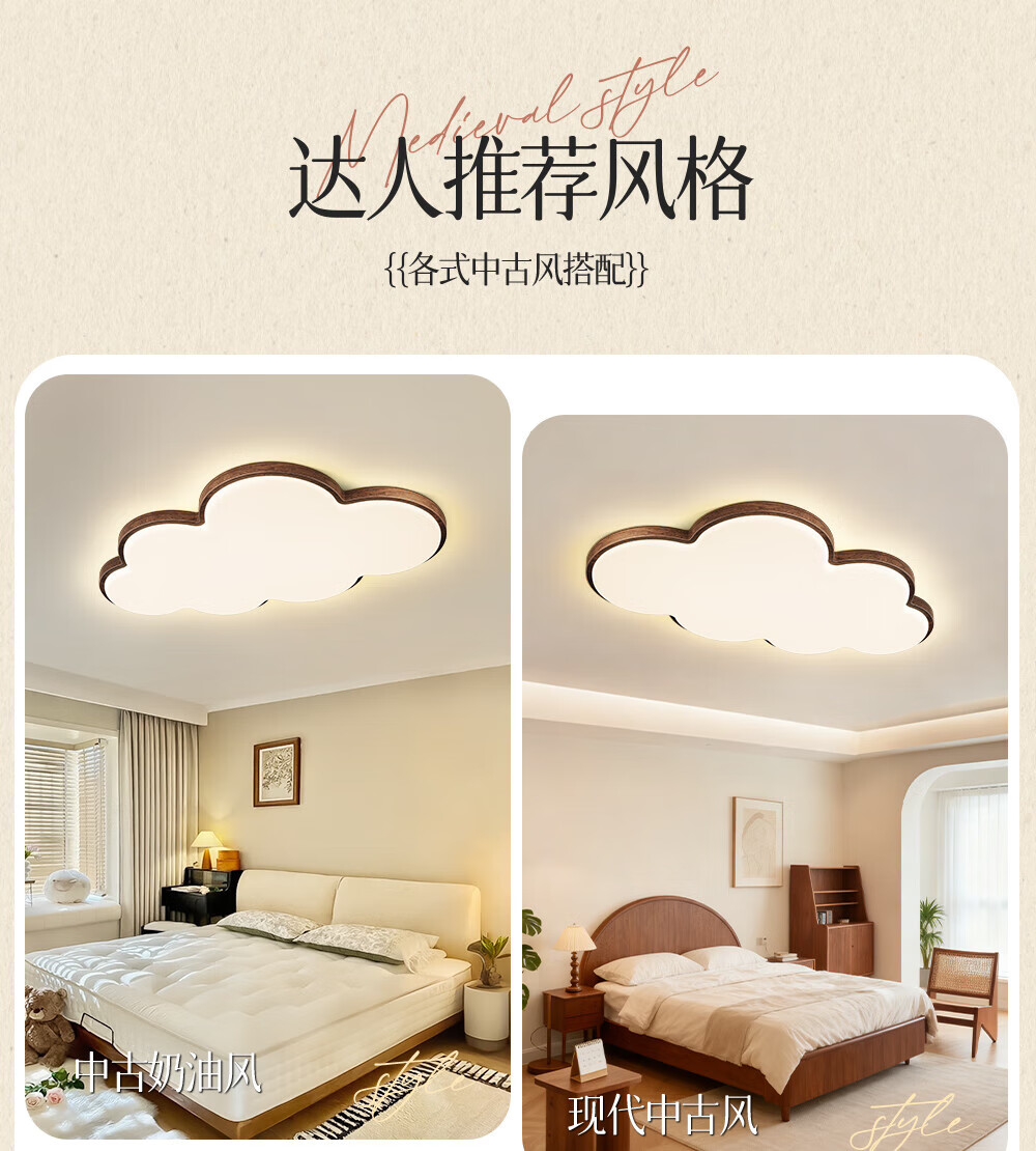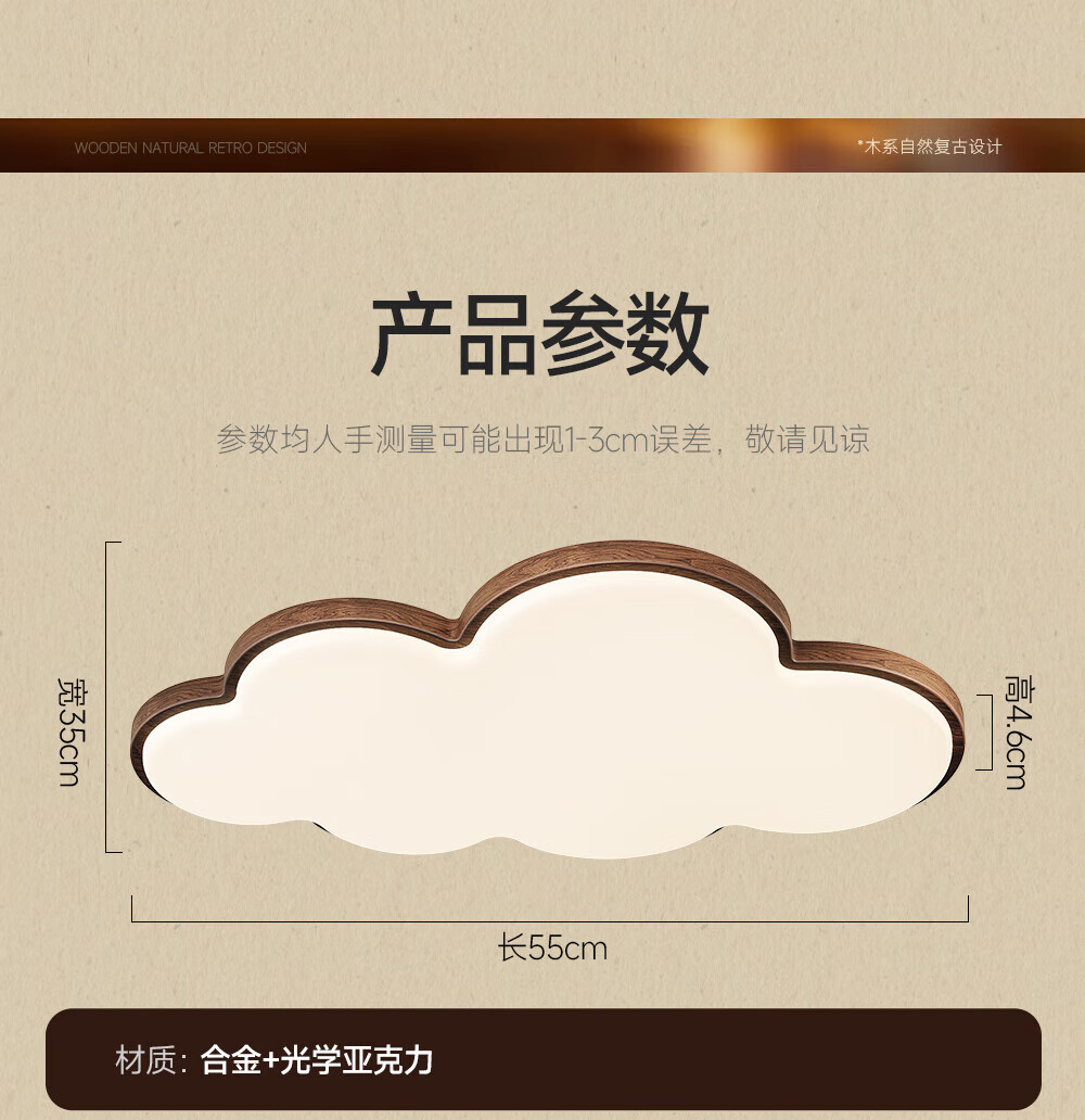 惠普普瑞护眼led中古风卧室吸顶灯复古胡桃木色云朵灯儿童房中山灯具 包安装-复古云朵-55CM三色