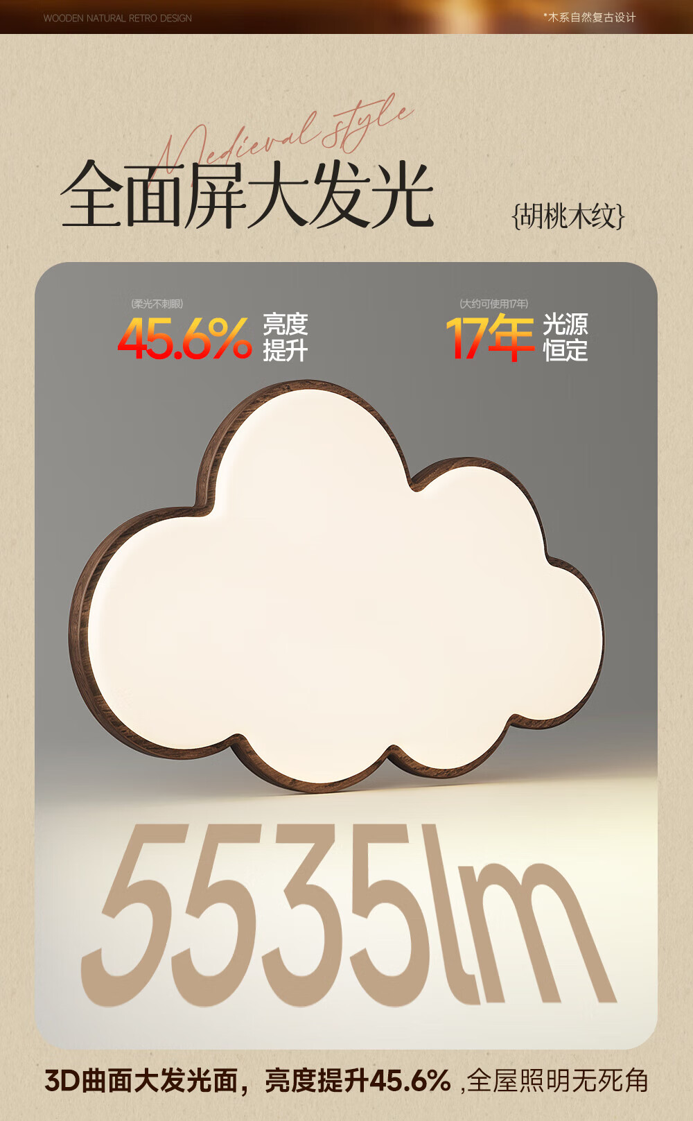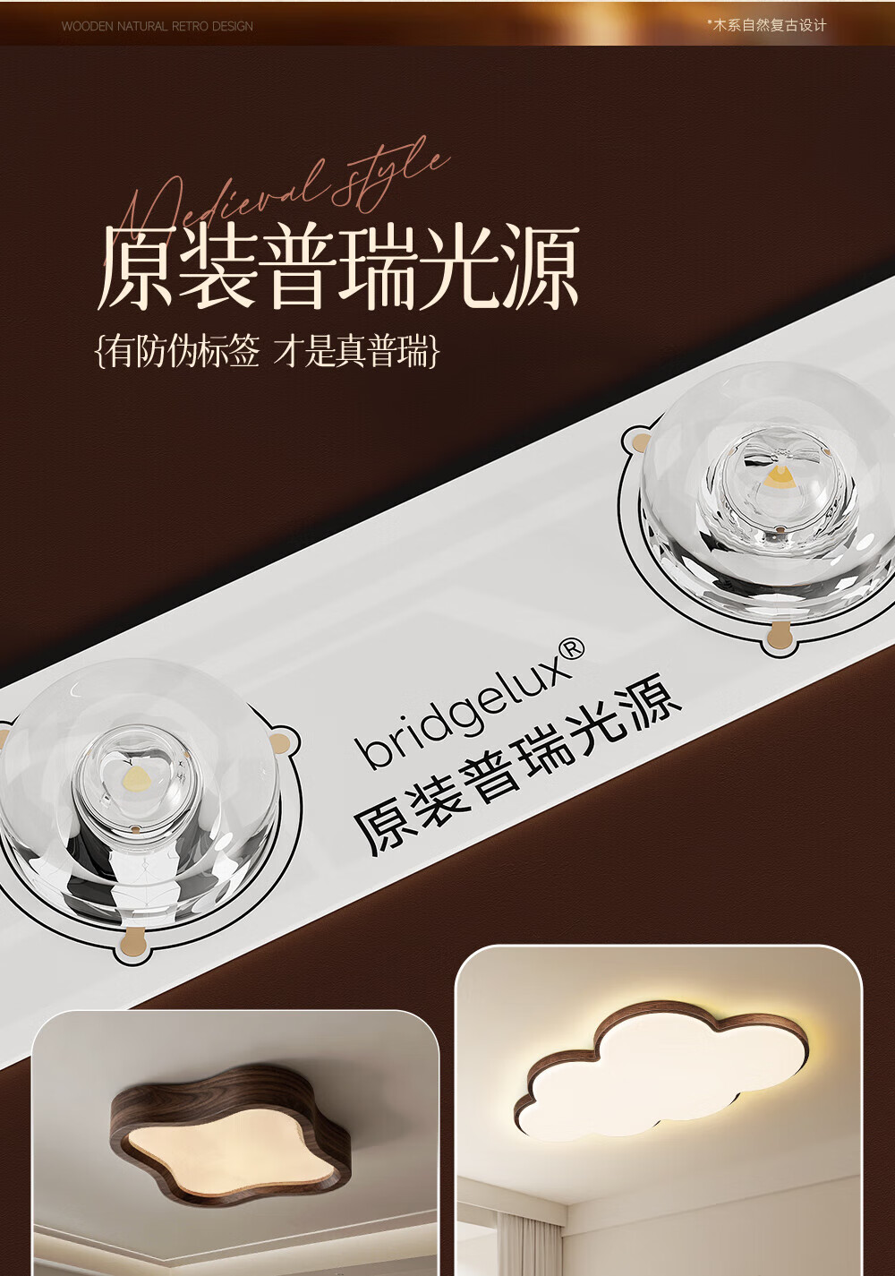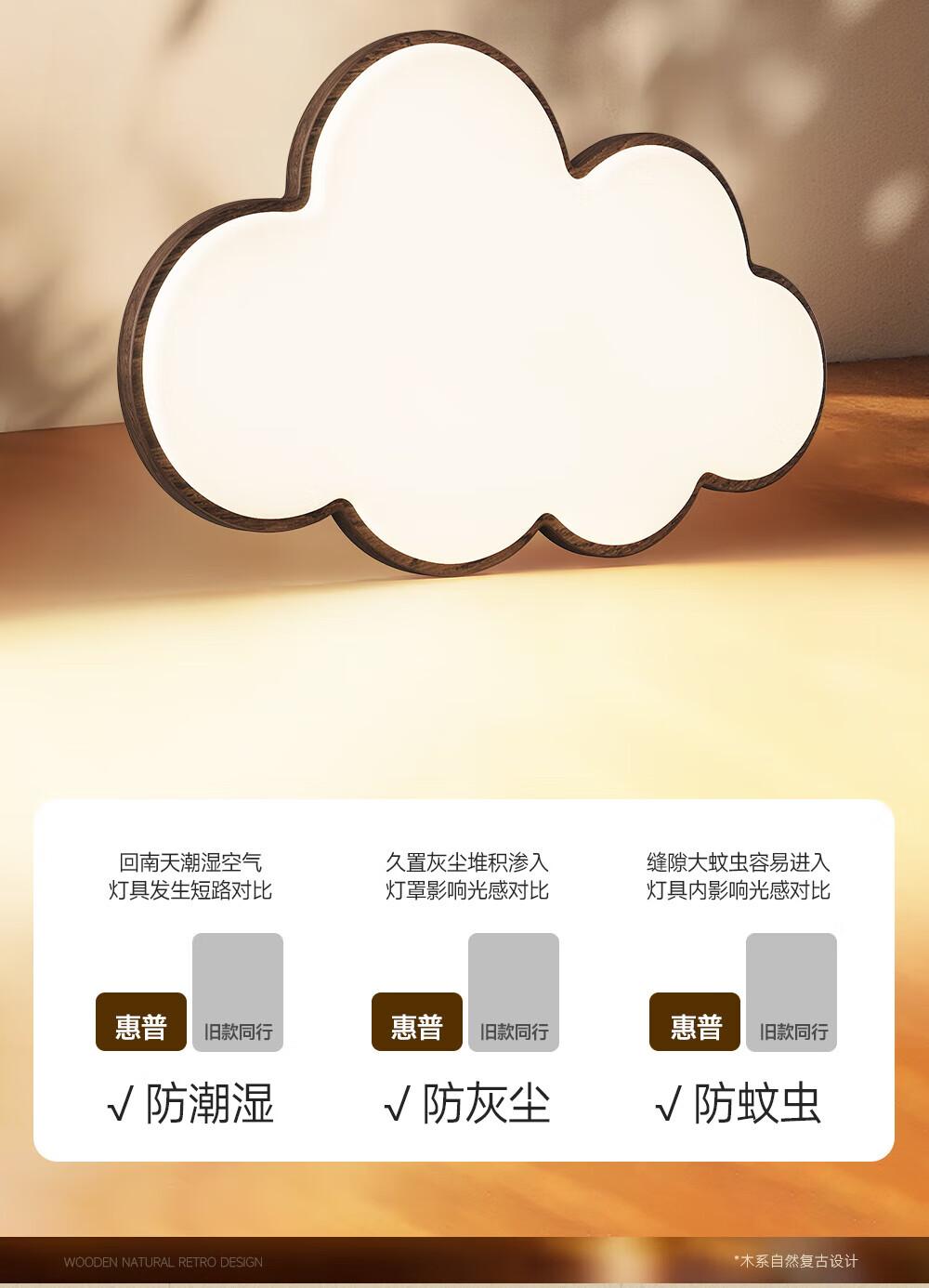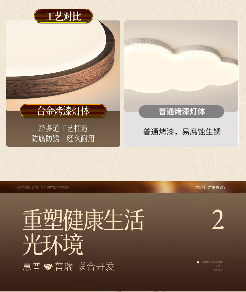 惠普普瑞护眼led中古风卧室吸顶灯复古胡桃木色云朵灯儿童房中山灯具 包安装-复古云朵-55CM三色