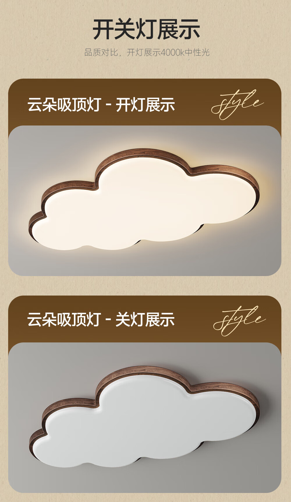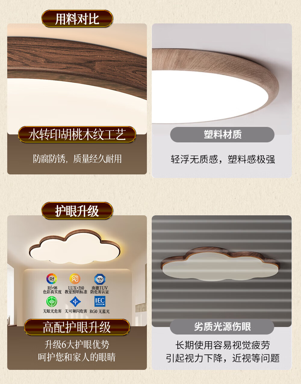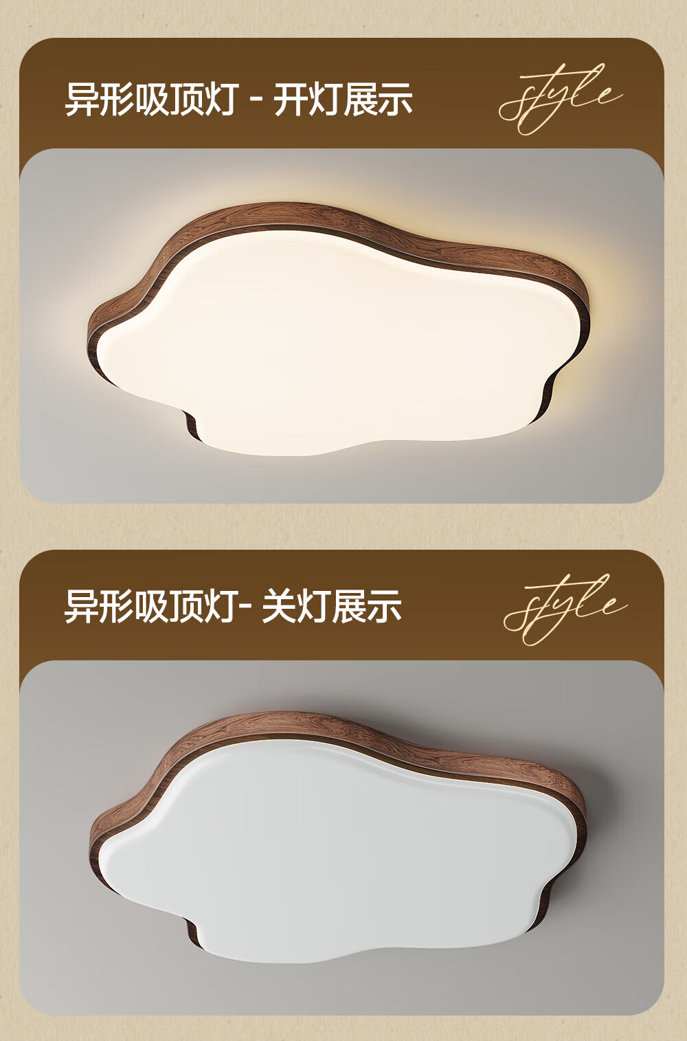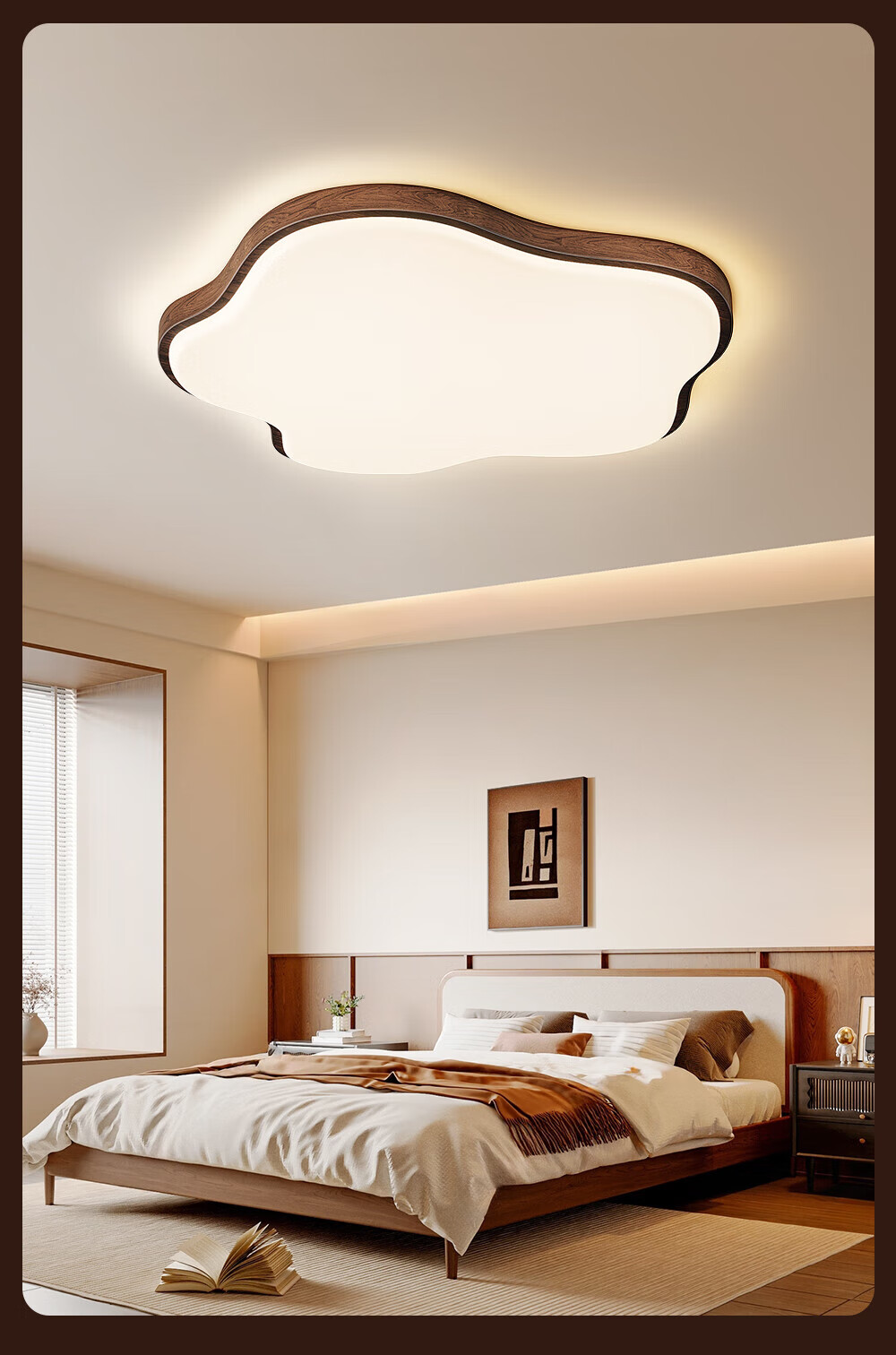 惠普普瑞护眼led中古风卧室吸顶灯复古胡桃木色云朵灯儿童房中山灯具 包安装-复古云朵-55CM三色