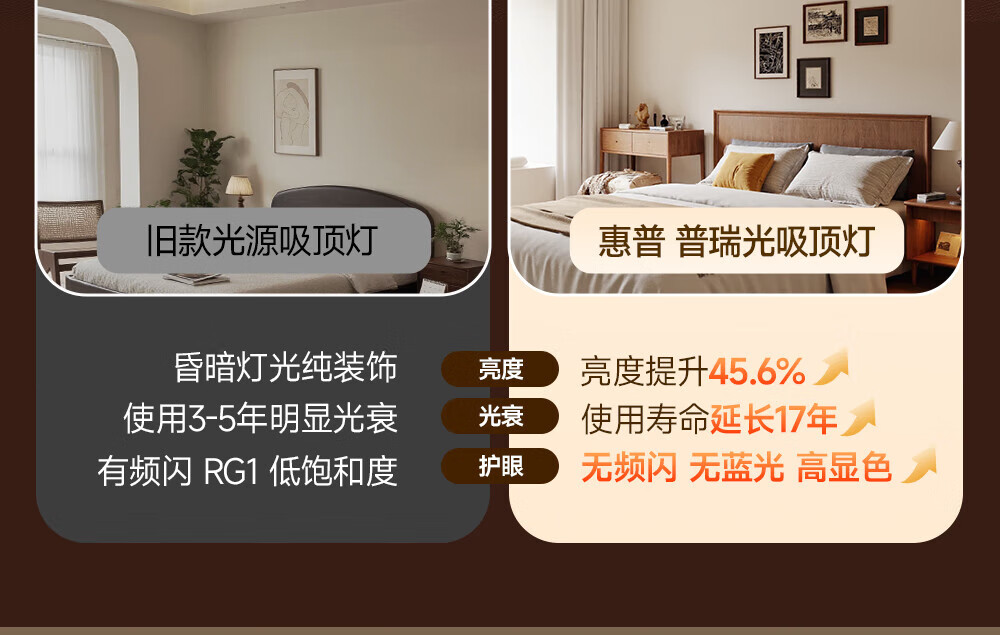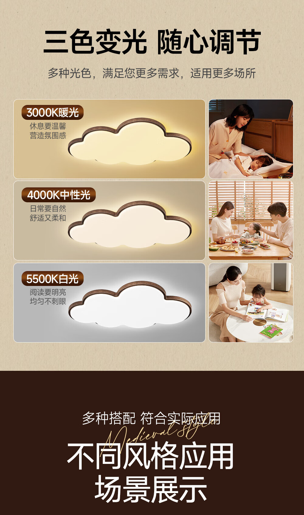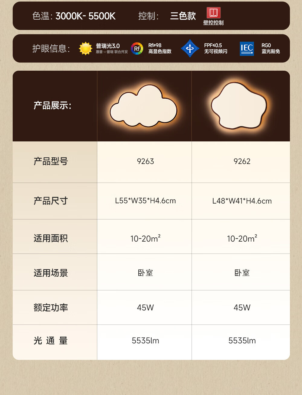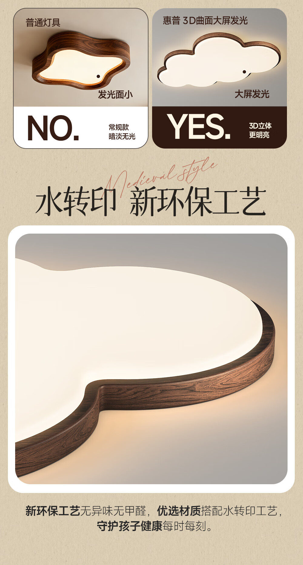 惠普普瑞护眼led中古风卧室吸顶灯复古胡桃木色云朵灯儿童房中山灯具 包安装-复古云朵-55CM三色