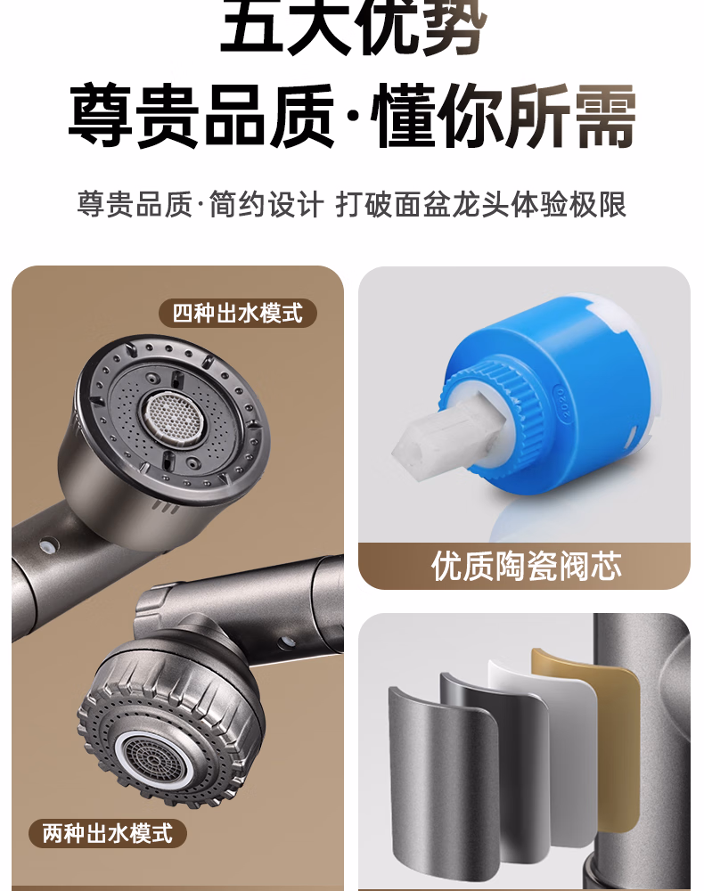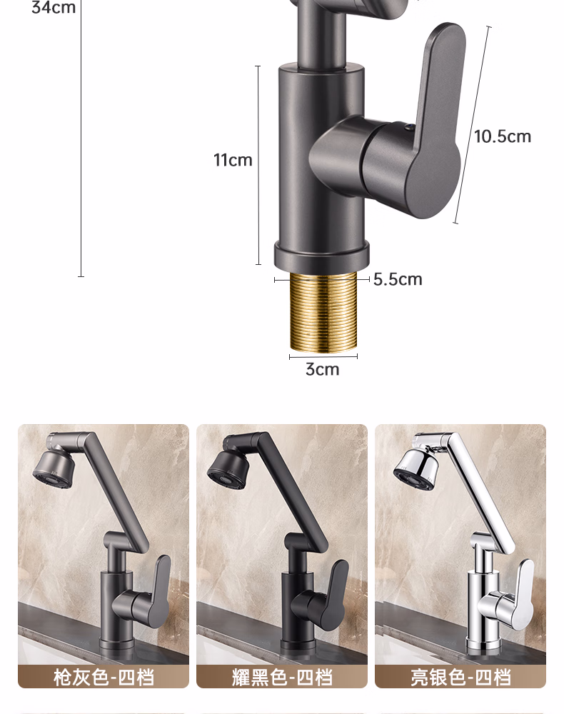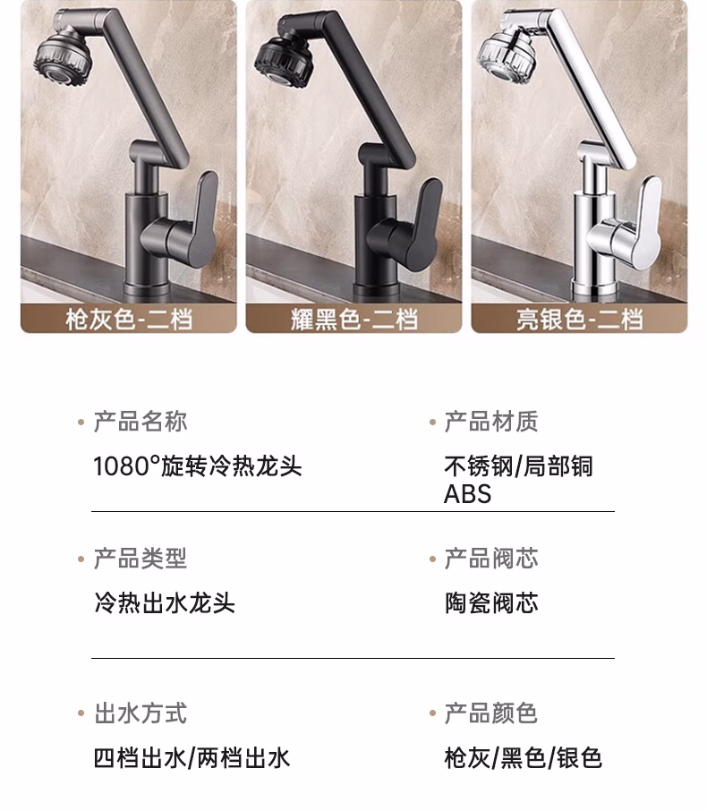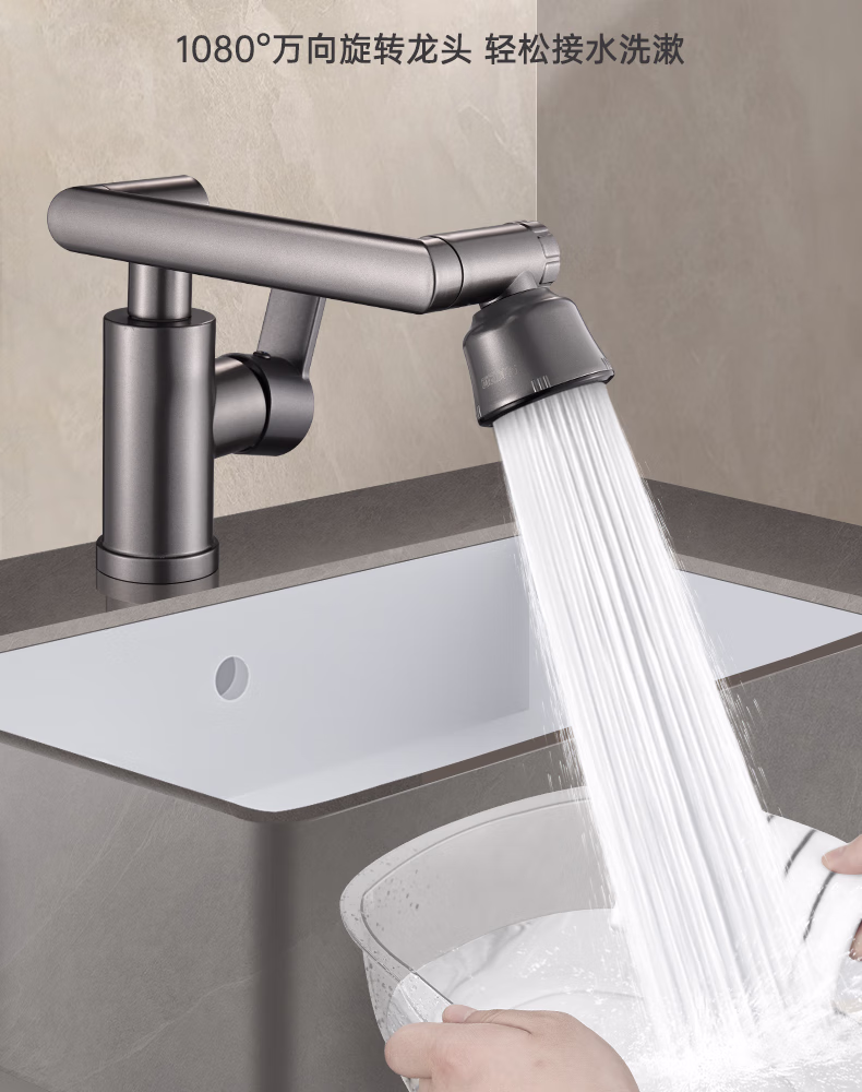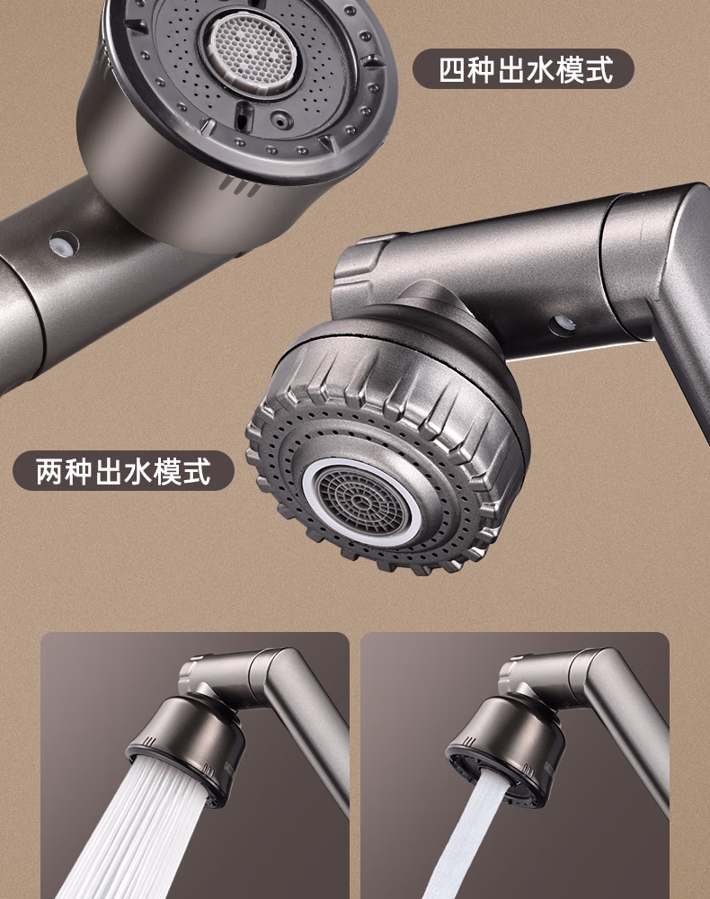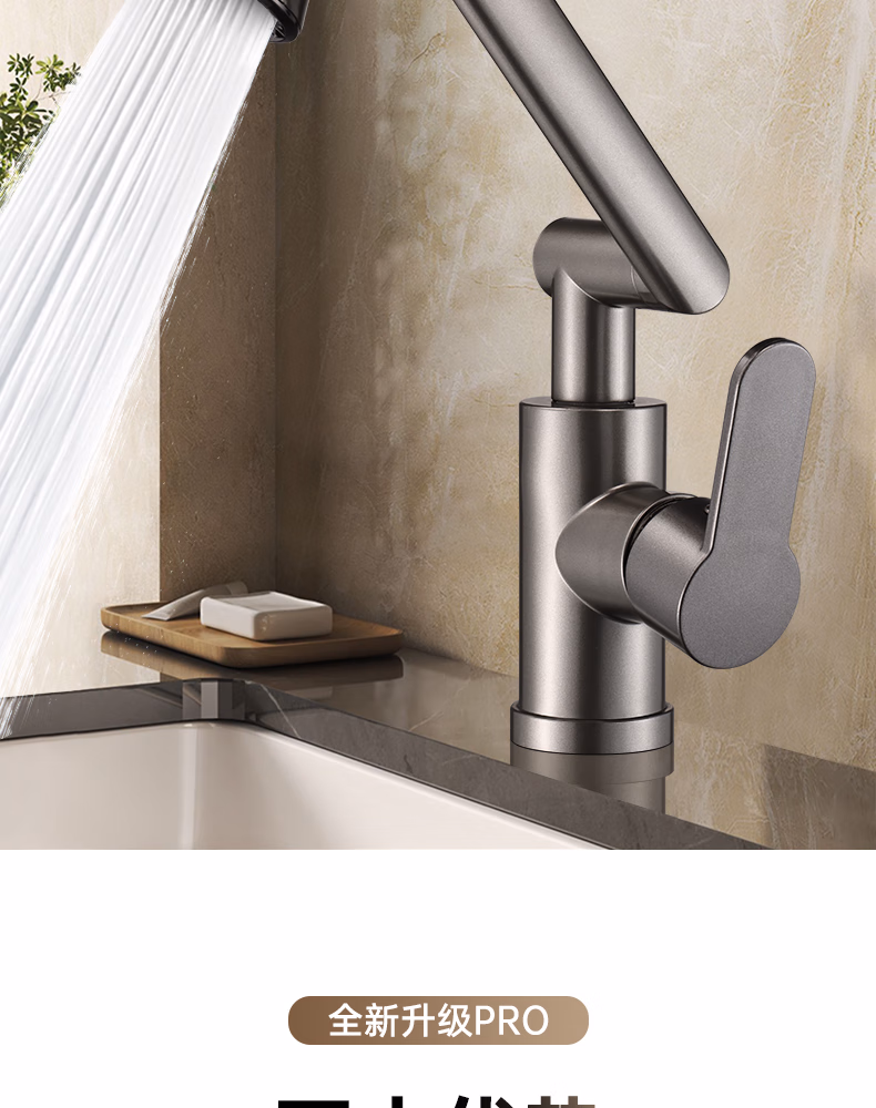 壹品印象全新铜制四档厨房冷热水龙头洗手盆洗脸池卫生间机械臂浴室招财猫 升级款铜制加厚【枪灰】冷热水龙头+80cm水管