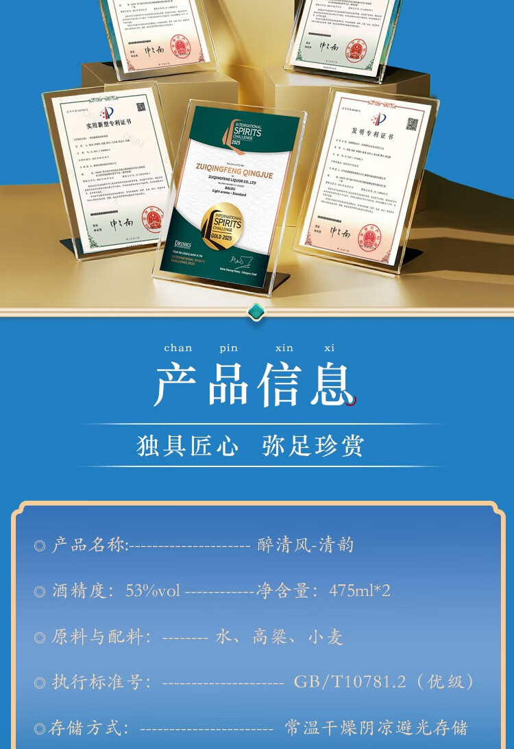 醉清风清花韵纯粮酿造清香型53度475ml双支x3盒礼盒装整箱宴请送人婚宴