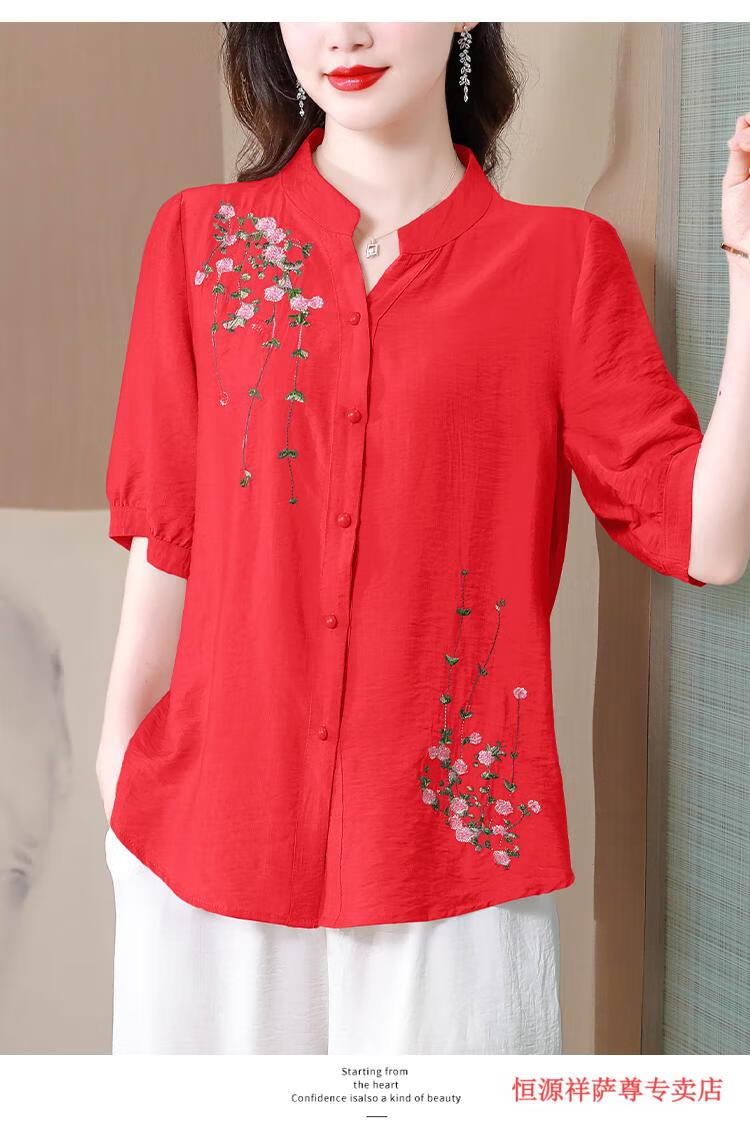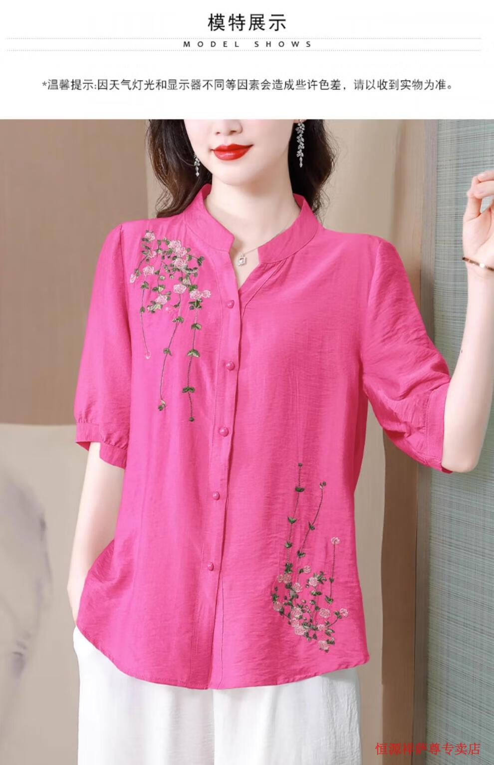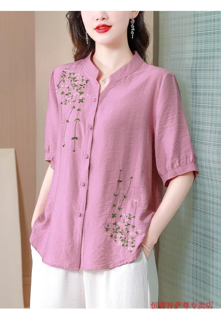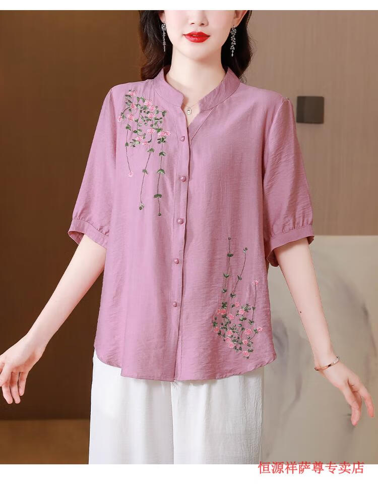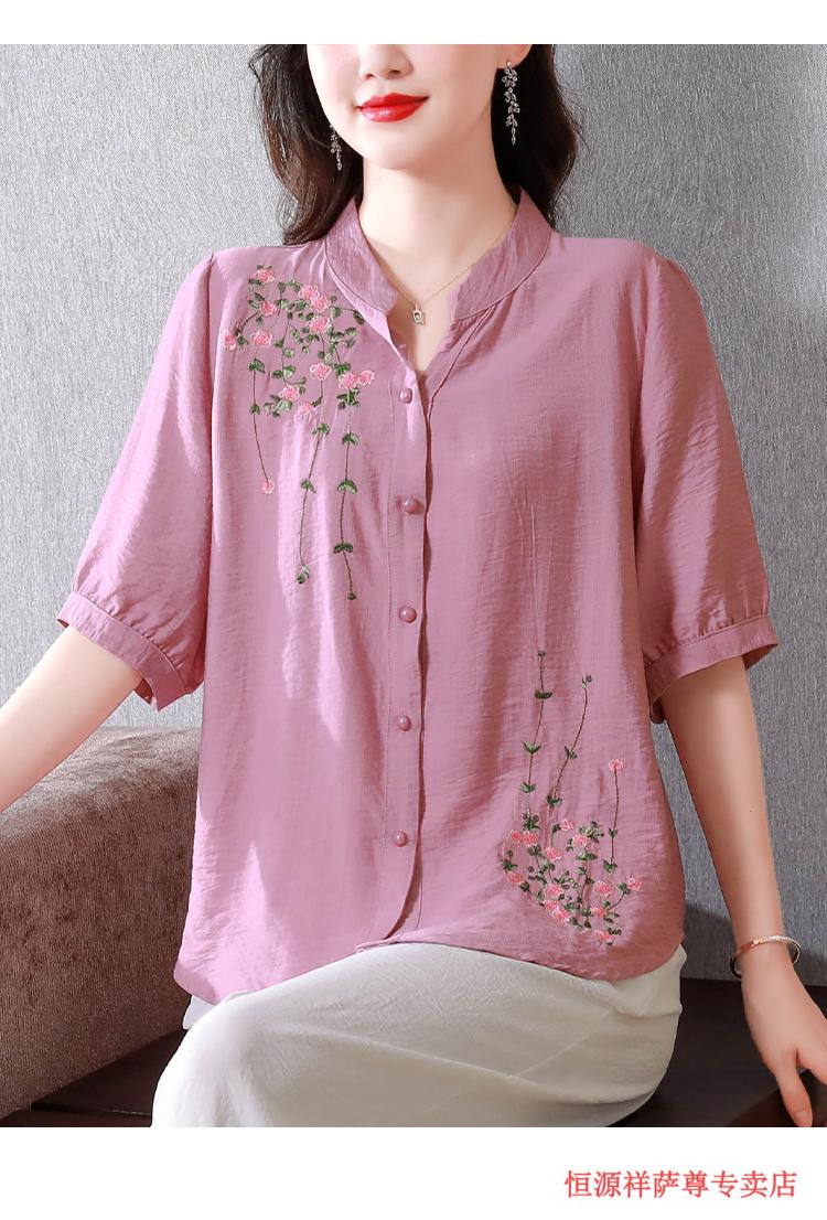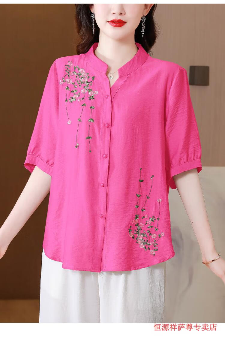恒源祥棉麻上衣女士夏季新款中国风刺绣衬衫妈M妈装立领宽松遮肚亚麻小 粉色 M 建议105斤以下