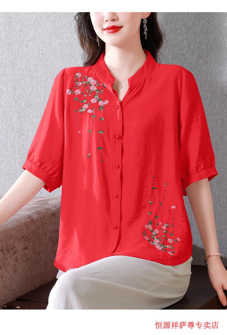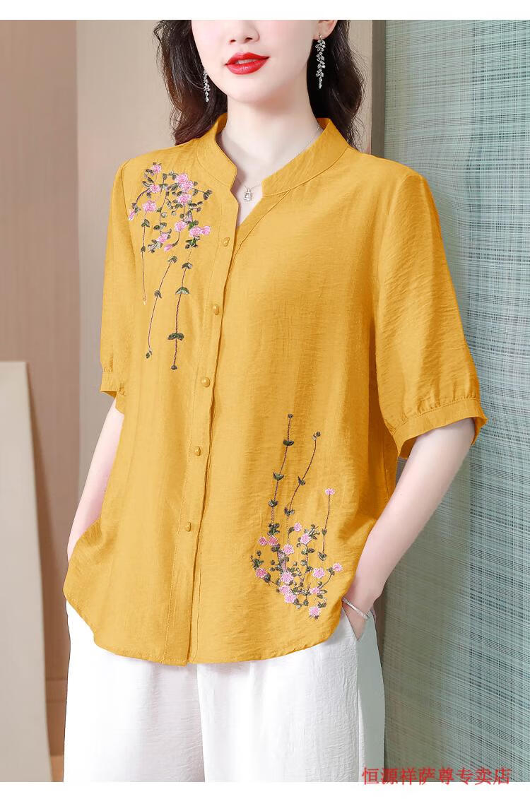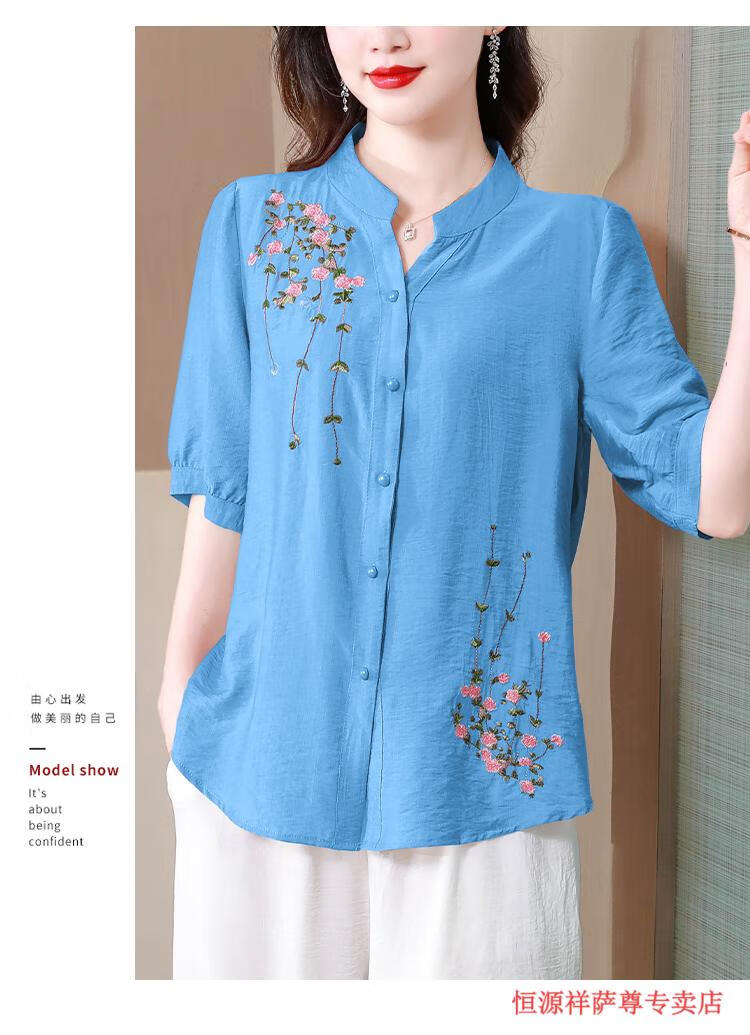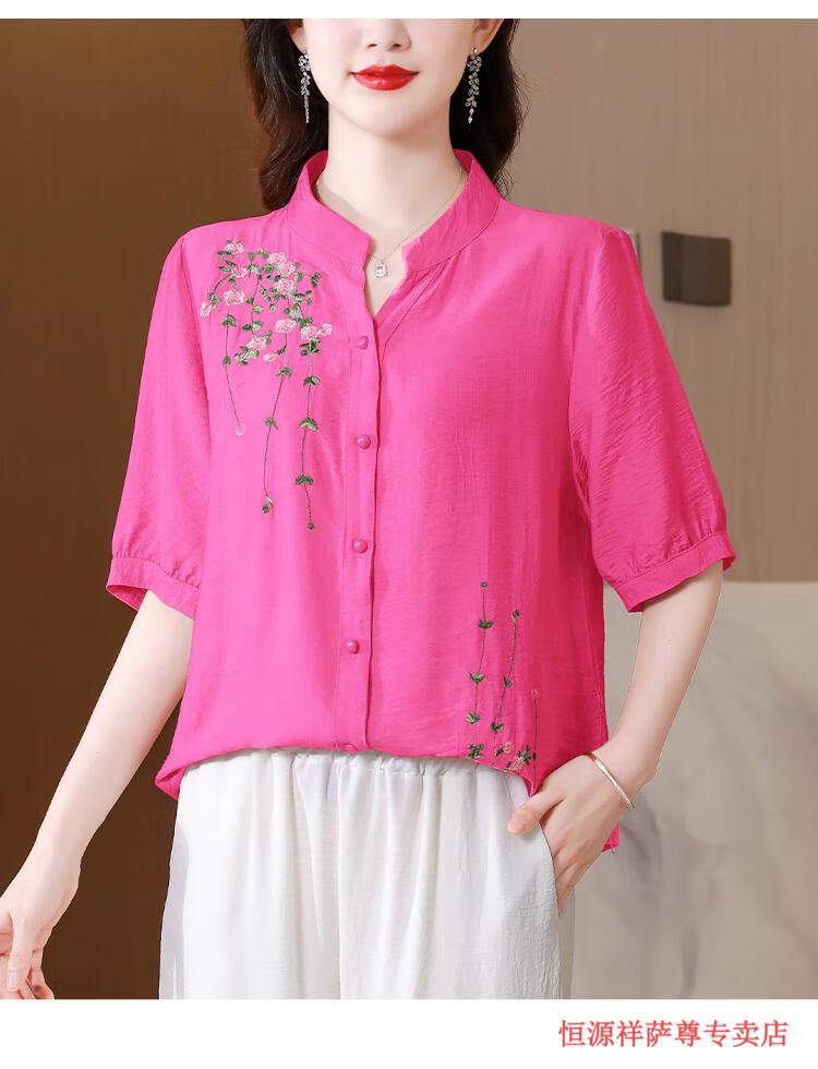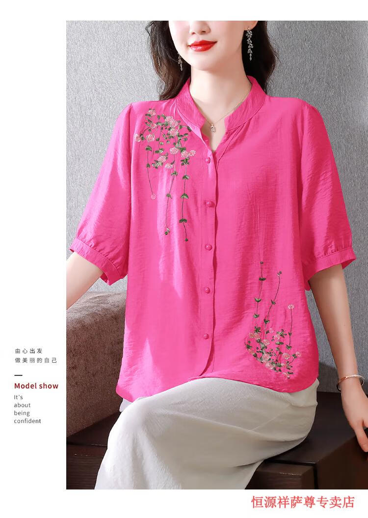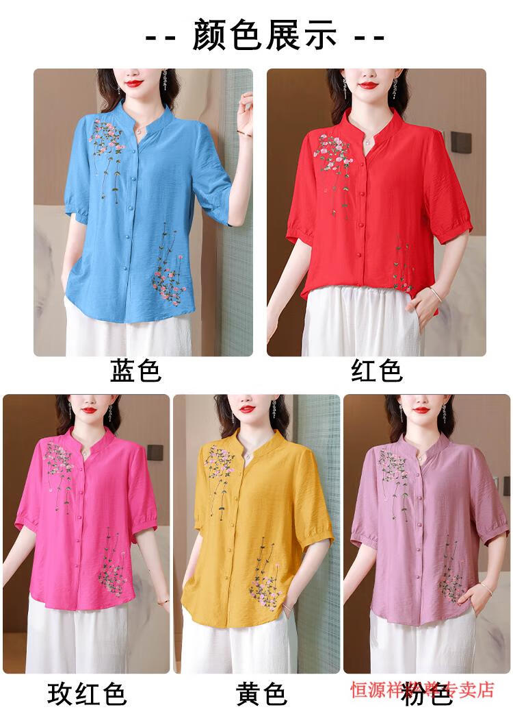 恒源祥棉麻上衣女士夏季新款中国风刺绣衬衫妈M妈装立领宽松遮肚亚麻小 粉色 M 建议105斤以下