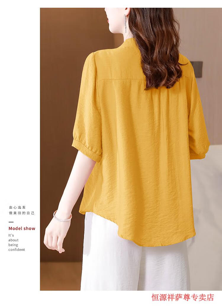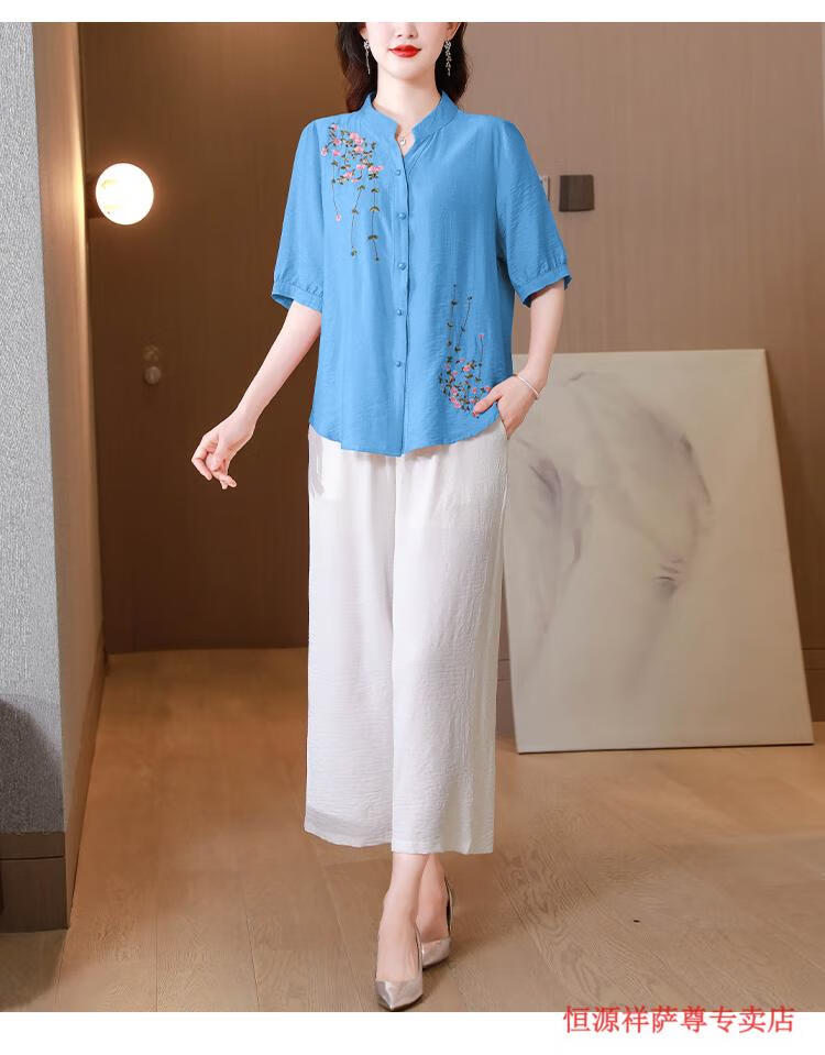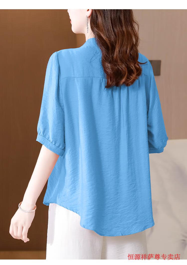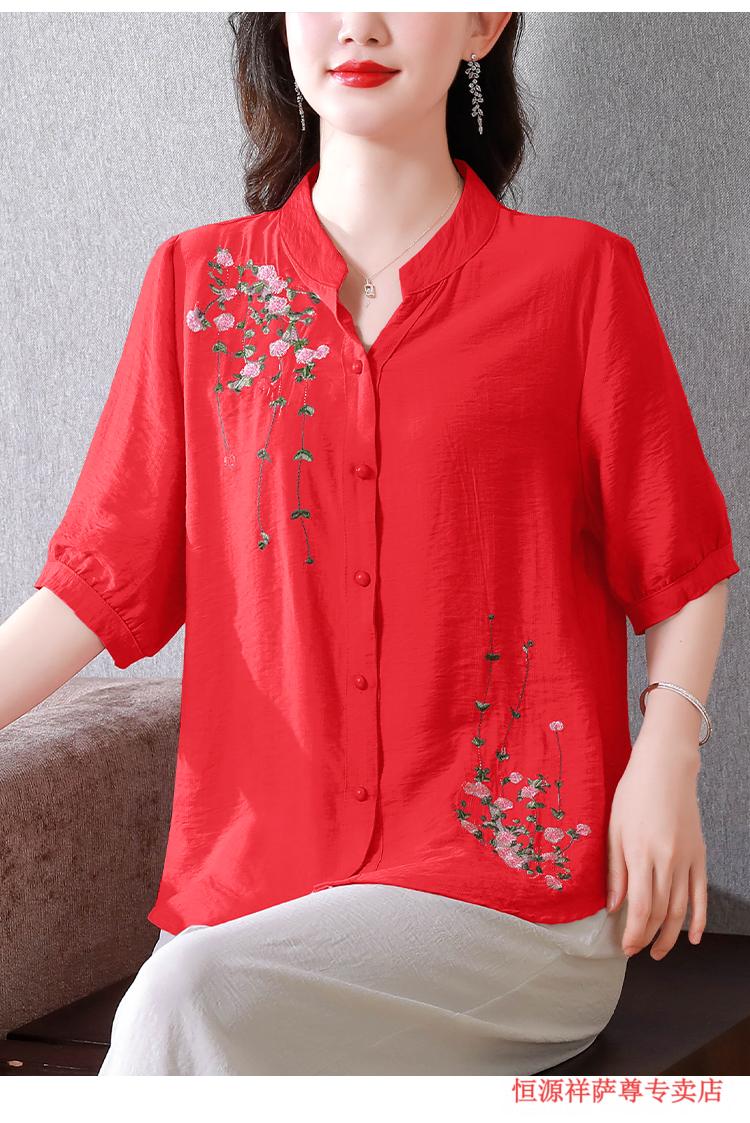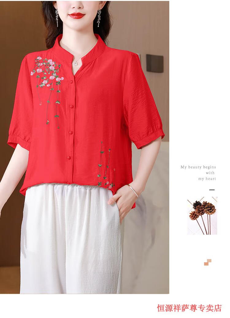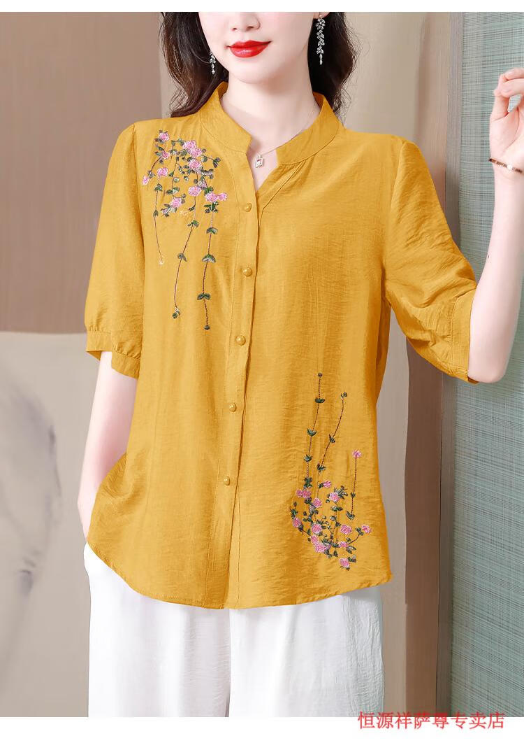 恒源祥棉麻上衣女士夏季新款中国风刺绣衬衫妈M妈装立领宽松遮肚亚麻小 粉色 M 建议105斤以下