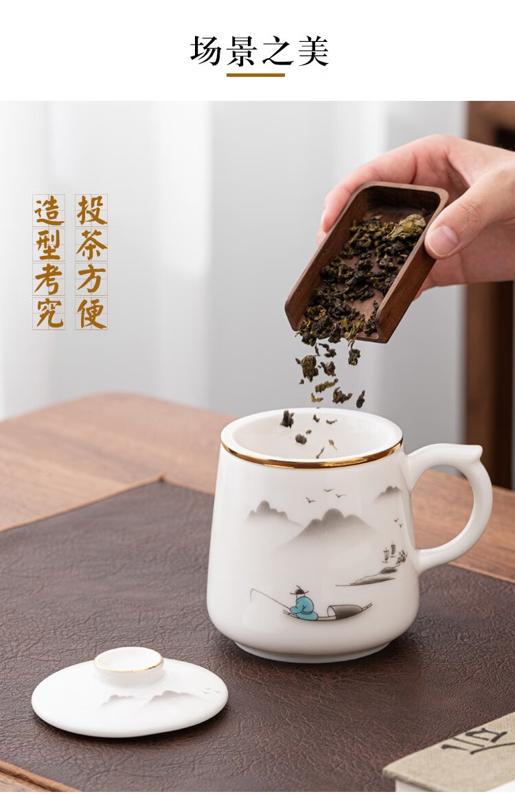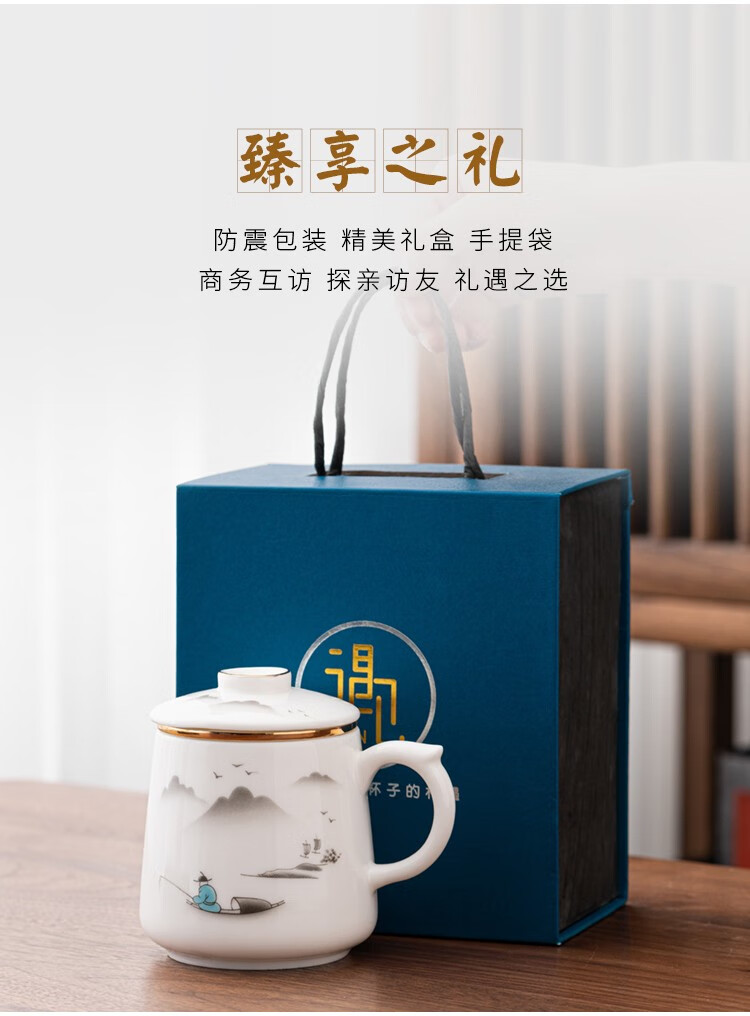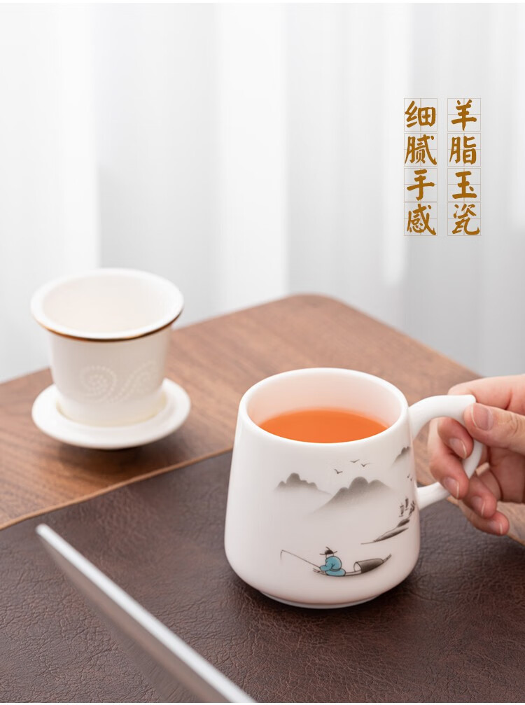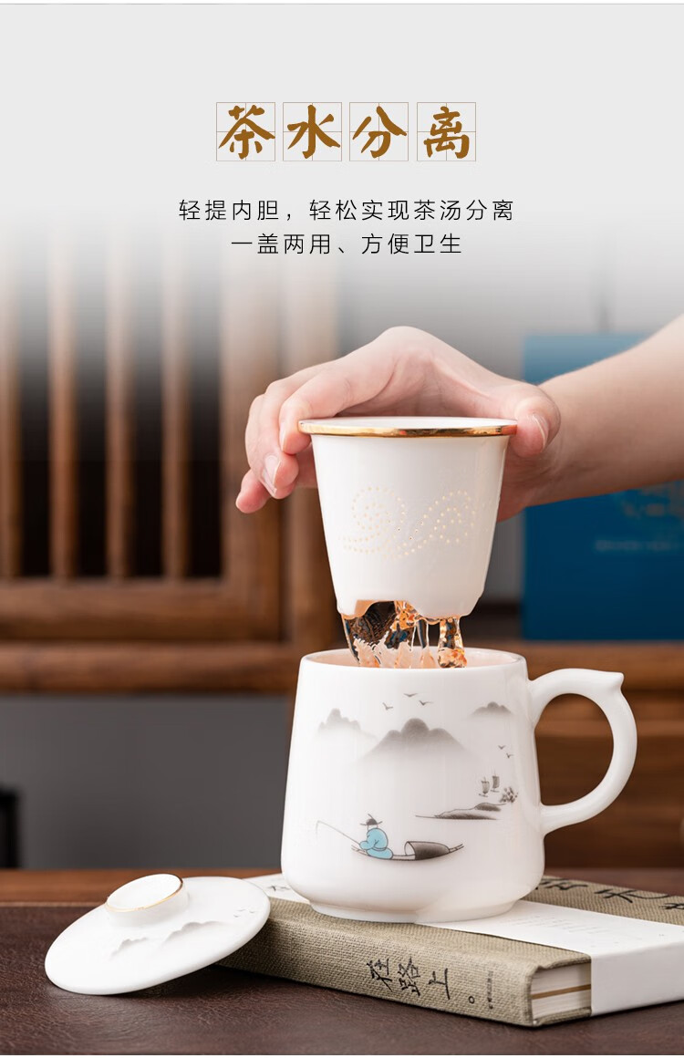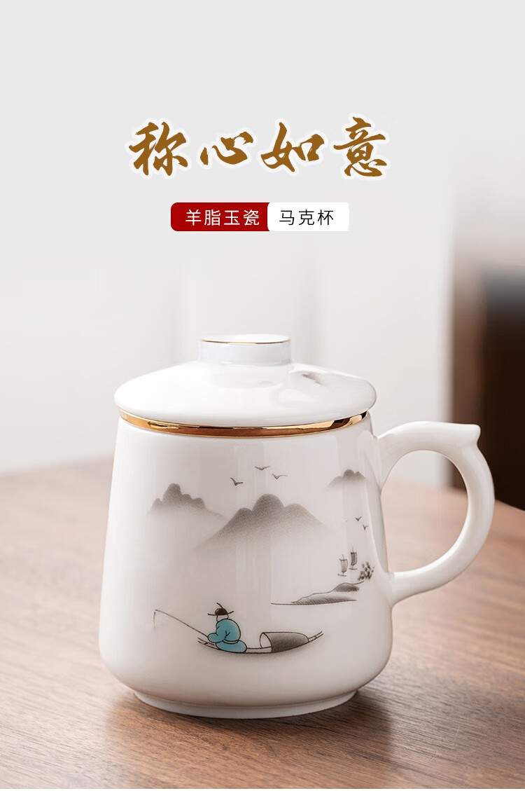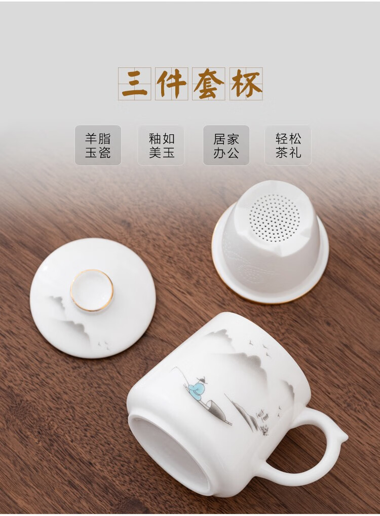 金镶玉茶杯三件套 羊脂玉瓷家用陶瓷白瓷茶水分离马克杯功夫茶具礼盒装 称心如意羊脂玉瓷马克杯升级款