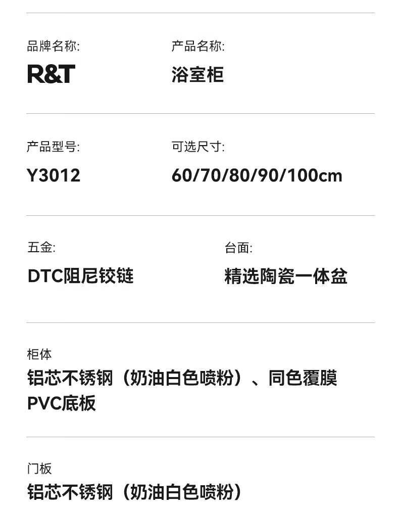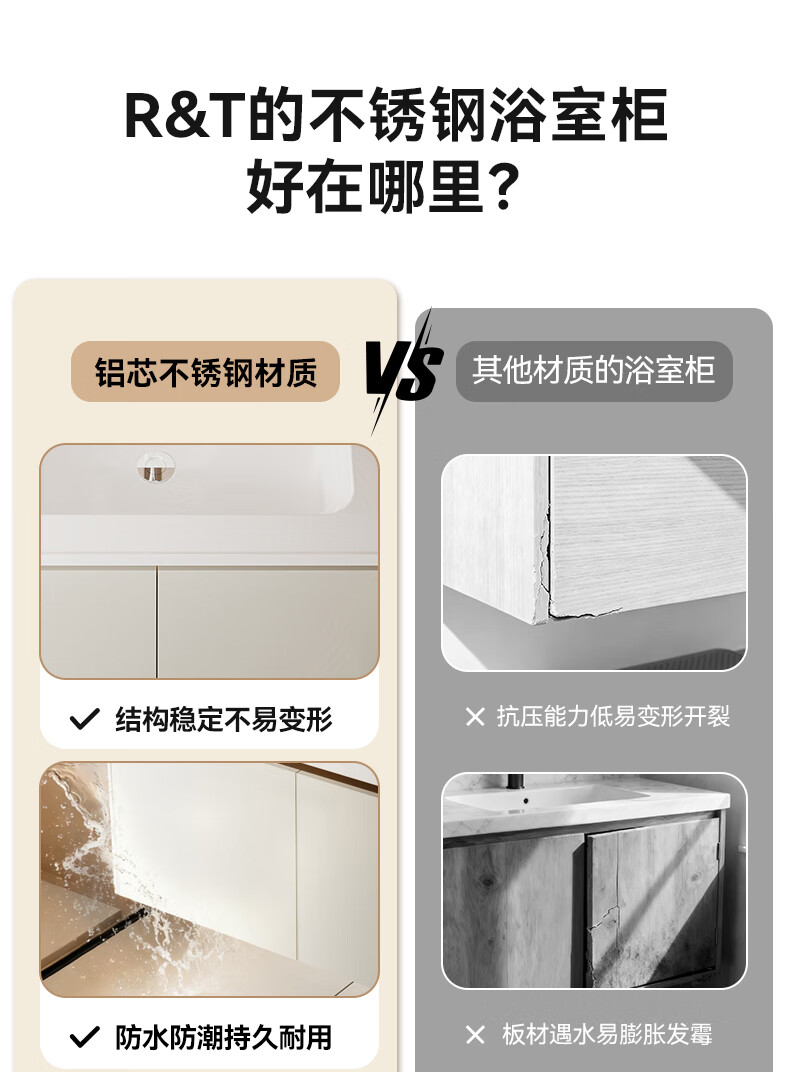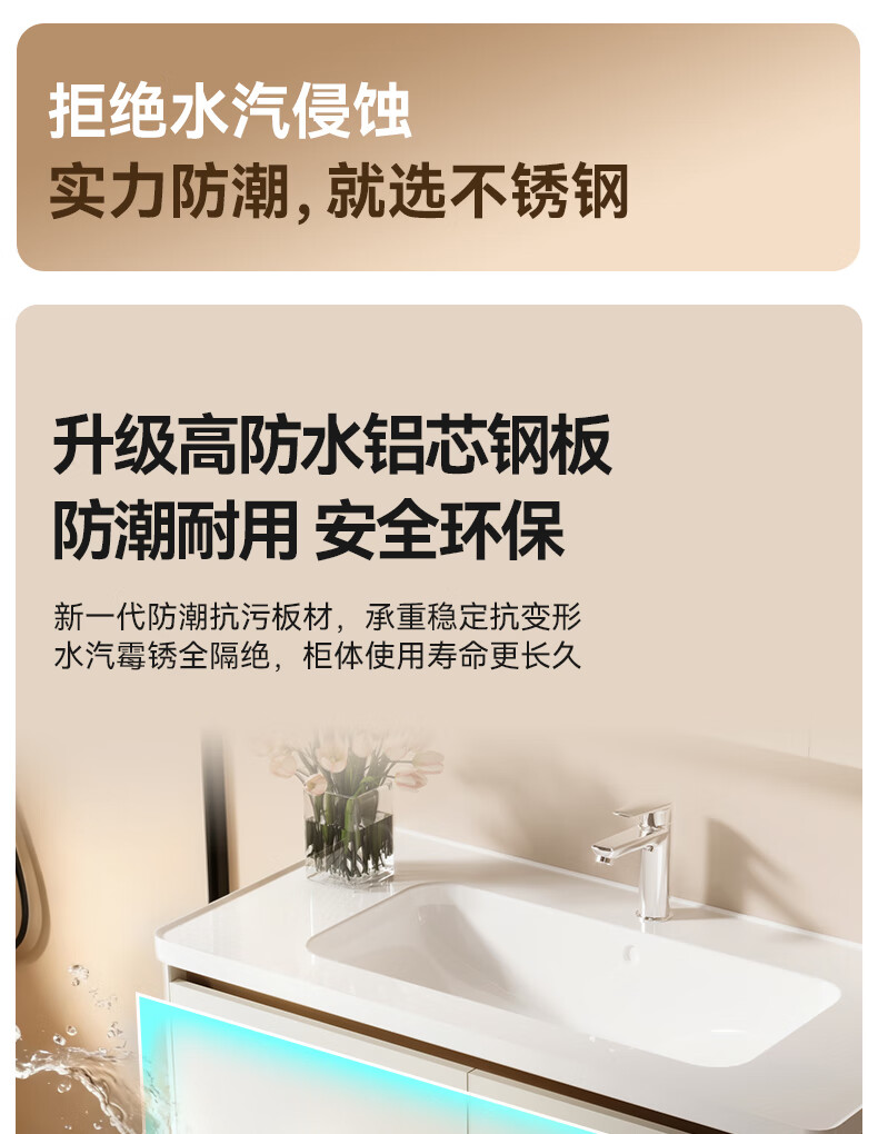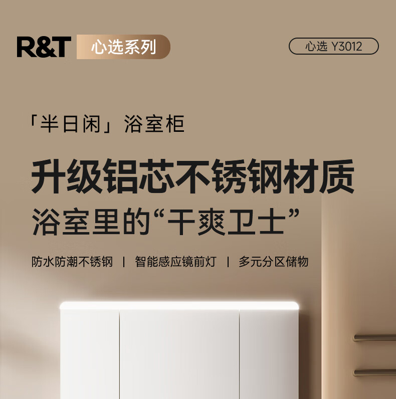 瑞尔特(R&T)2025新款不锈钢浴室柜组合陶瓷一体盆卫生间洗漱台智能美妆镜柜 Y3012-70cm【不锈钢+智能感应镜前灯+多元分区储物】
