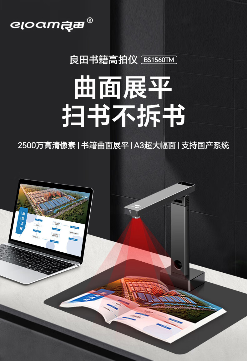 良田(eloam)书籍高拍扫描仪 曲面展平不拆书 2500万高清 办公文件档案高速自动连续扫描仪 A3幅面 BS1560TM