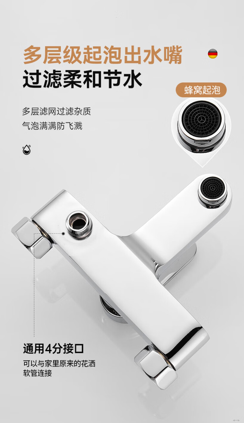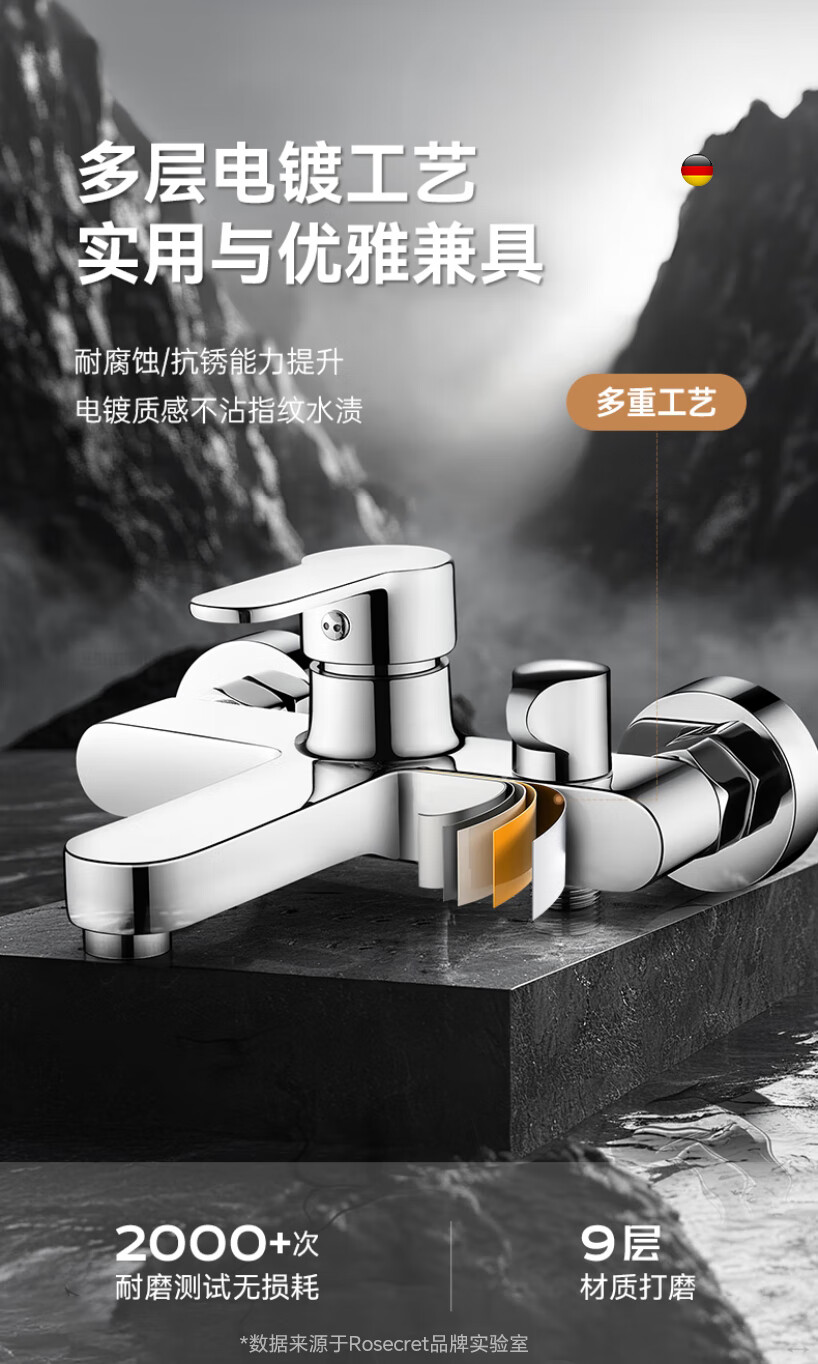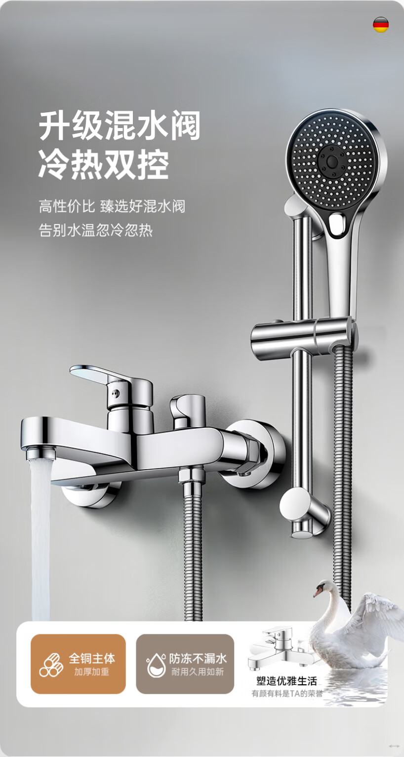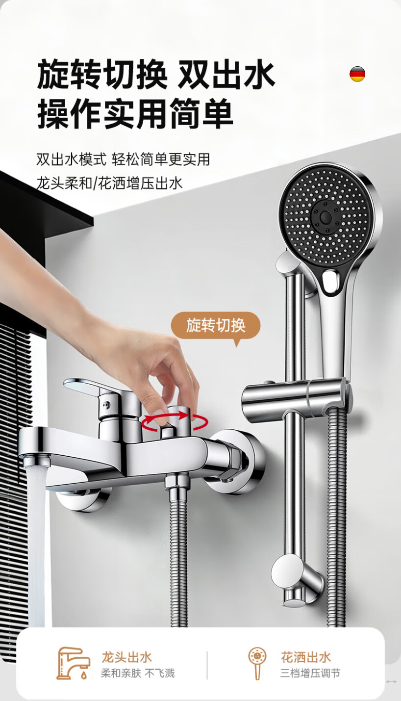 Rosecret【德国】淋浴花洒套装全铜主体浴室卫生间洗澡混水阀增压花洒一套 【旗舰款】3档淋浴混水阀套装-亮银色 配安装件包+自由升降杆