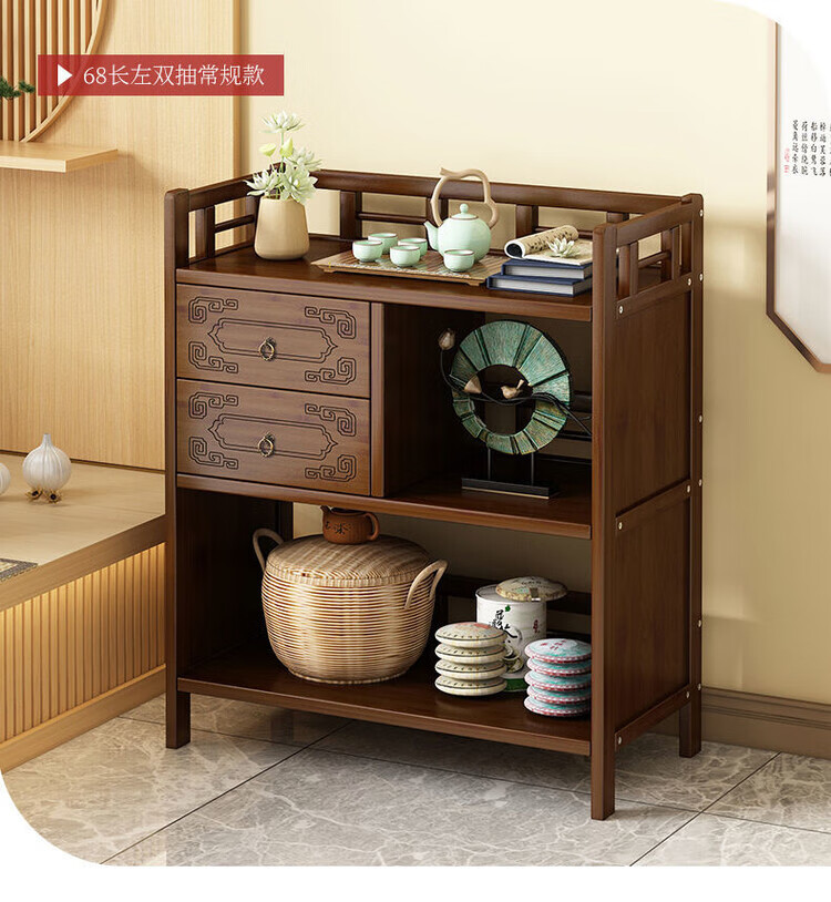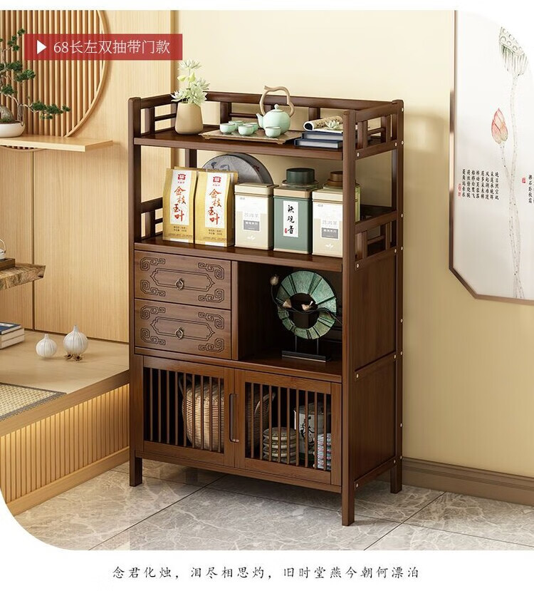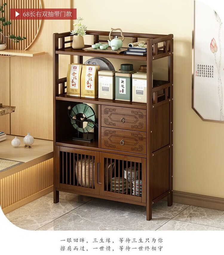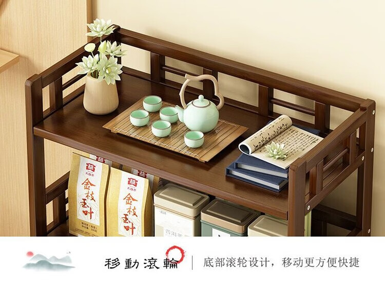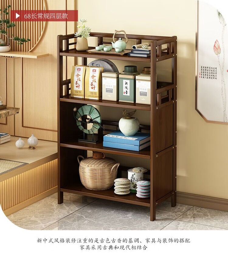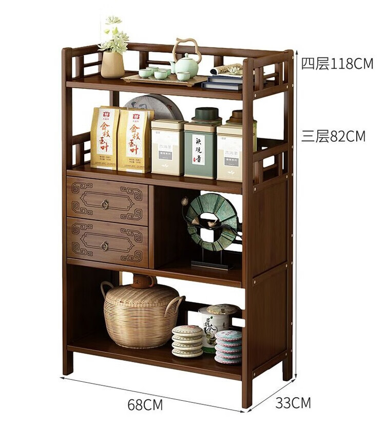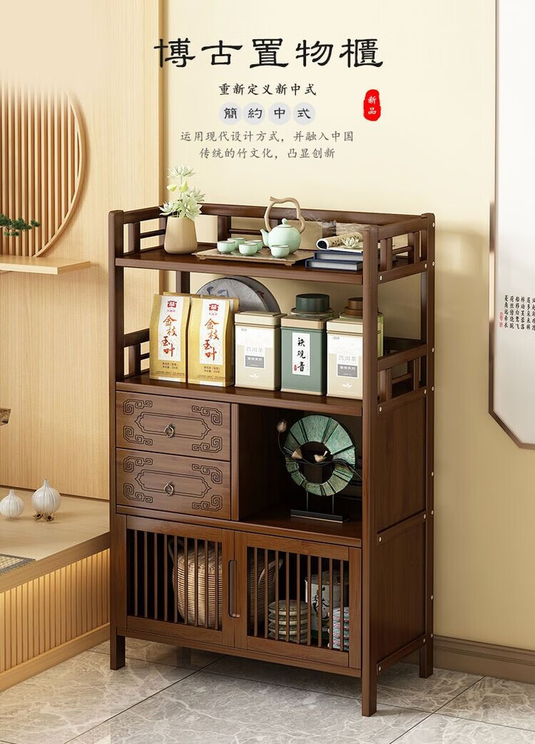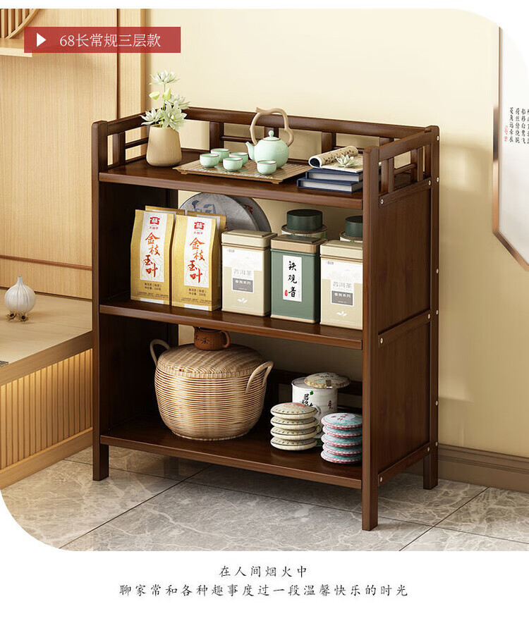 倘然之家博古架新中式茶架茶柜家用茶桌置物架茶叶收纳柜客厅沙发边柜边几 【底部加固】三层68简约款