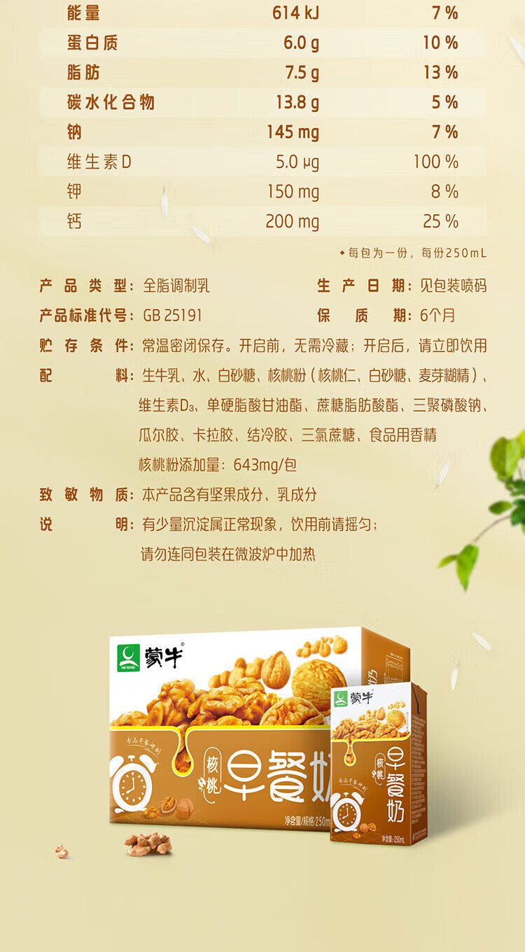 蒙牛早餐奶核桃味牛奶礼盒装 250mL*24盒