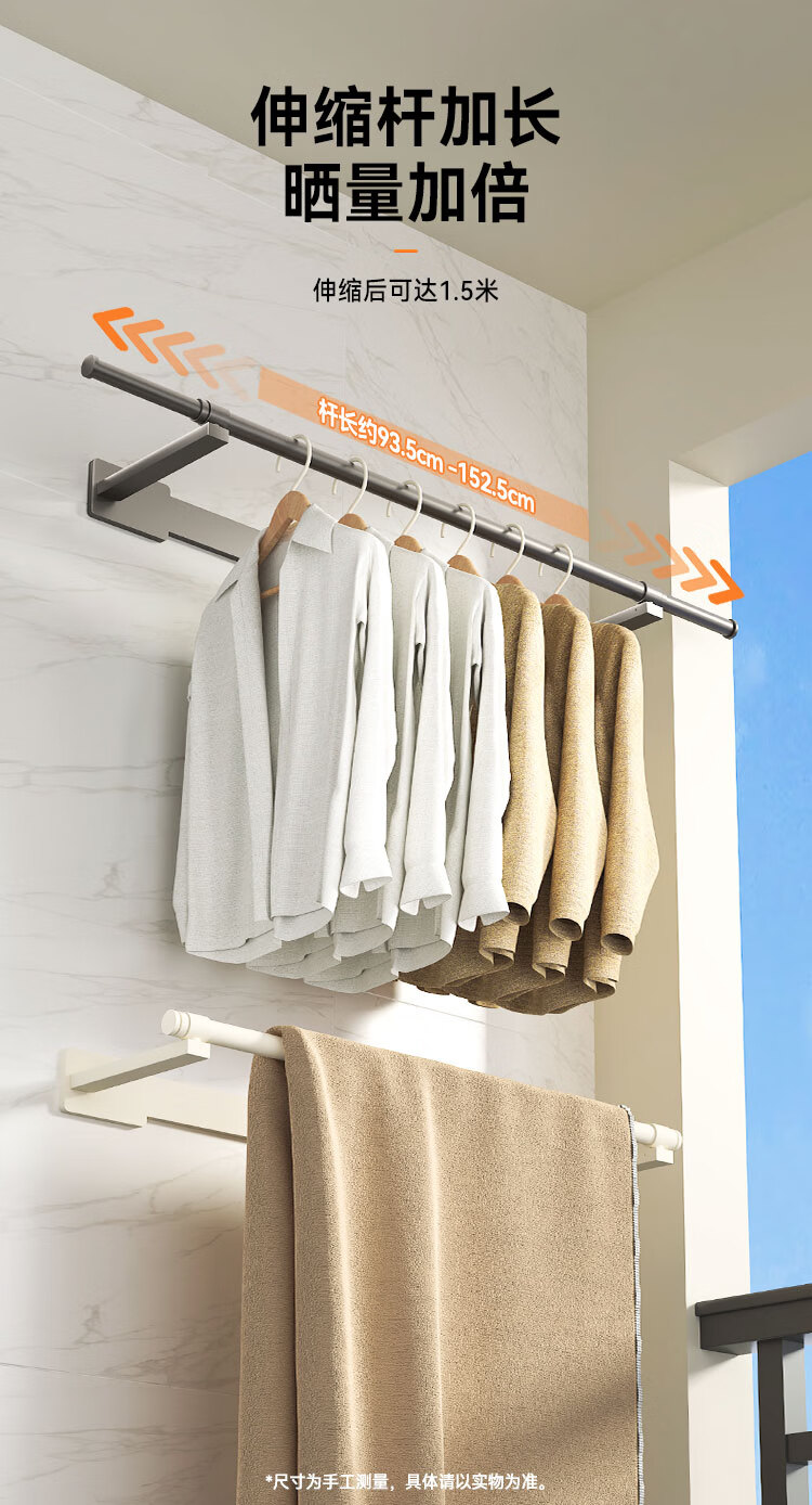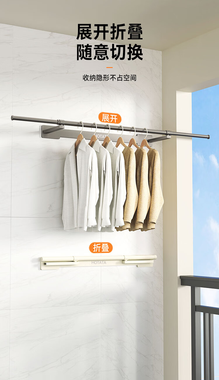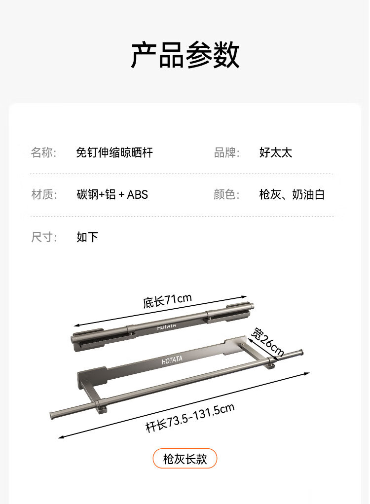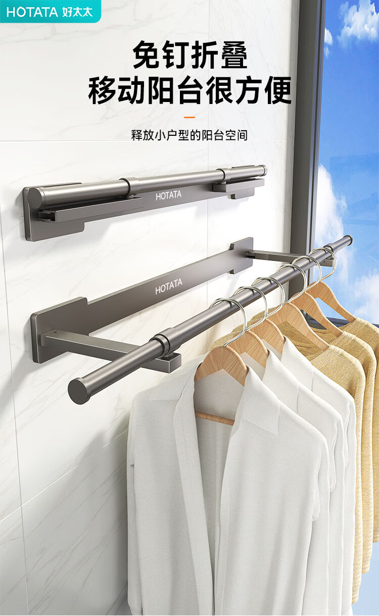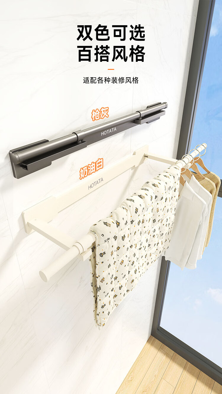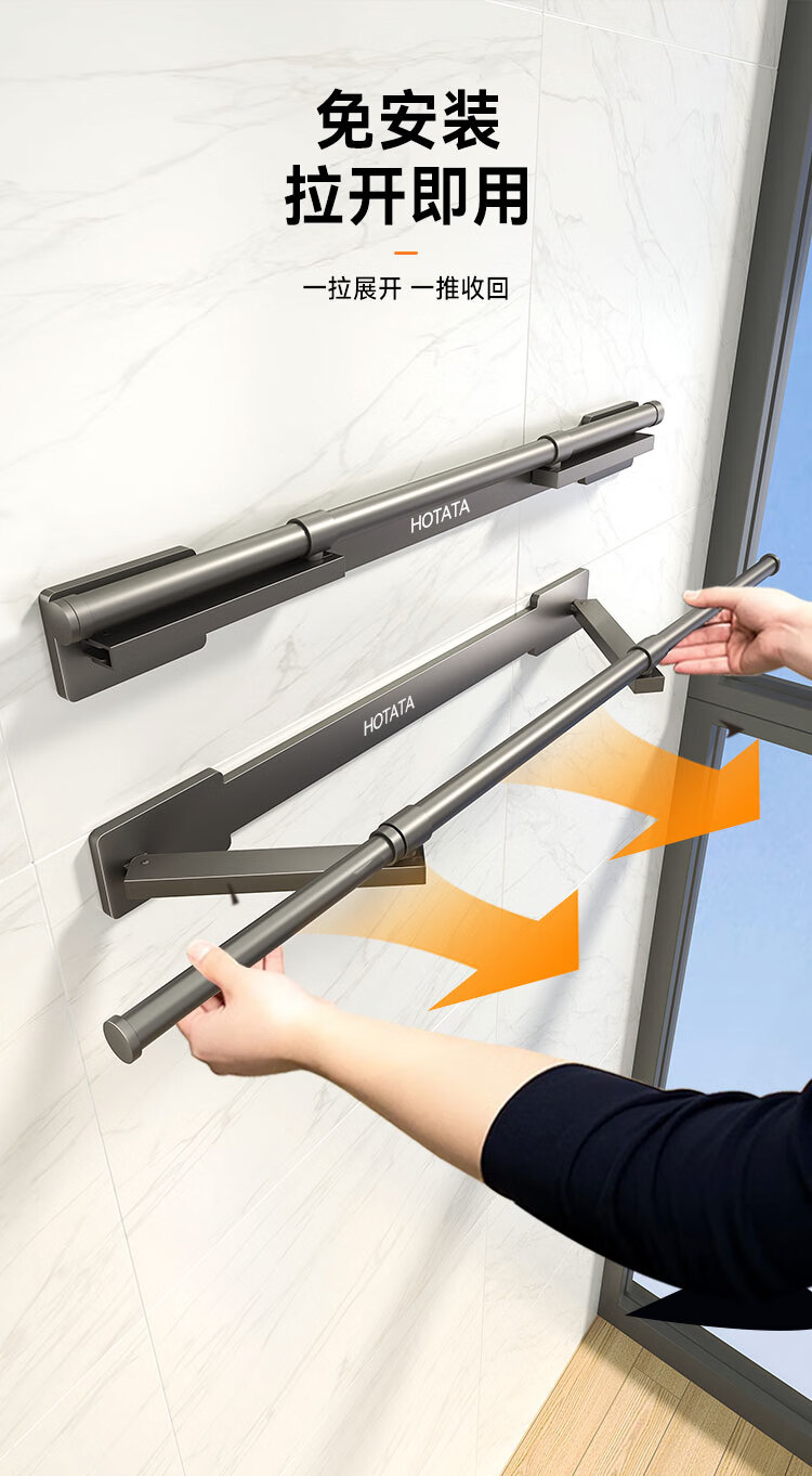 好太太(Hotata)晾衣杆免打孔家用可折叠伸缩晾晒杆衣服被子多功能晾衣架收纳方便 【枪灰-加长款】可伸缩93.5cm-152.5cm