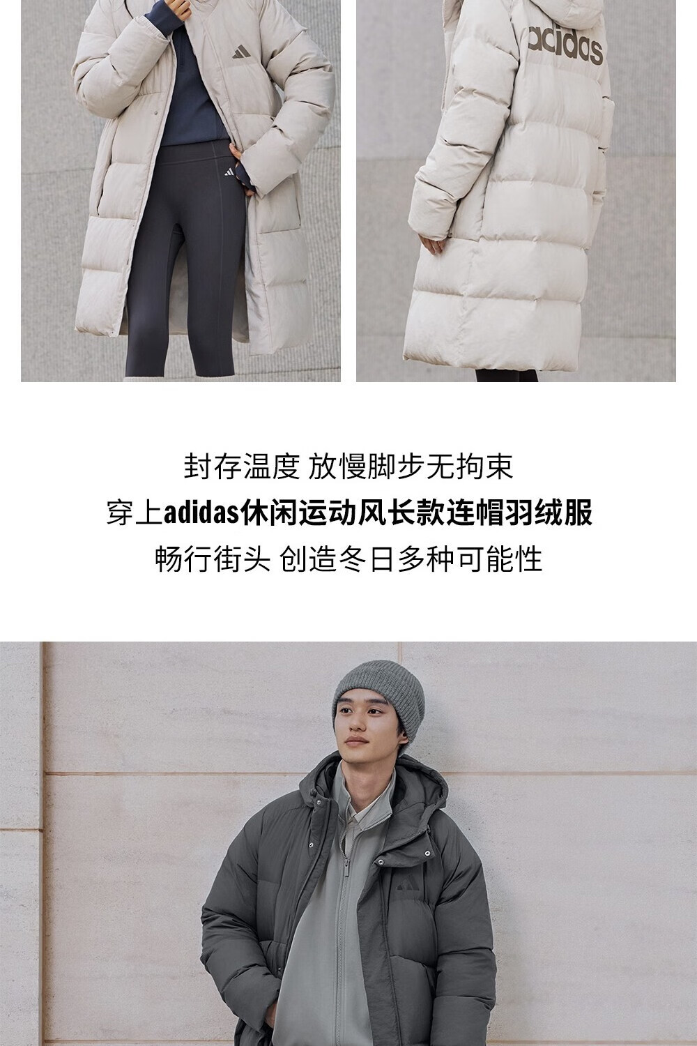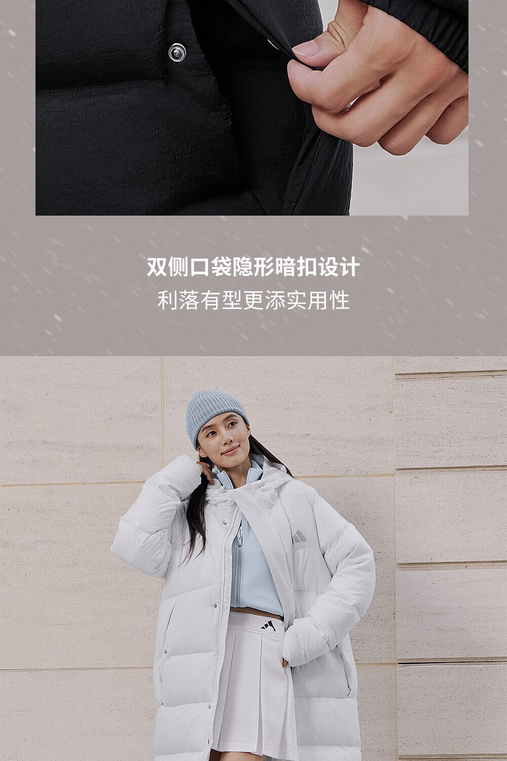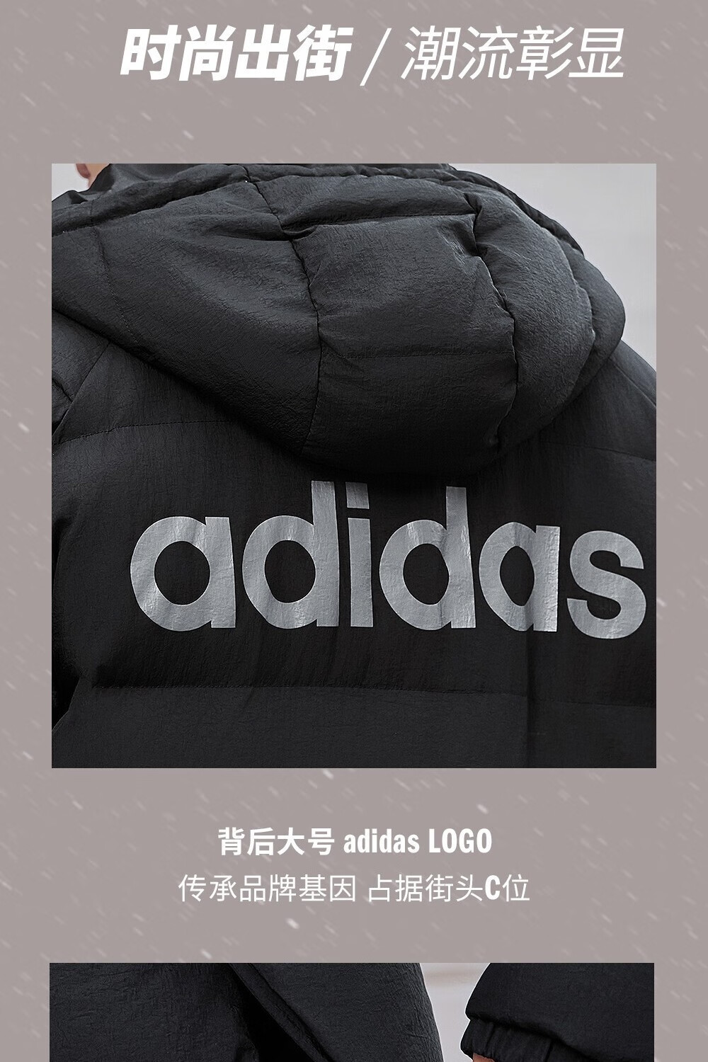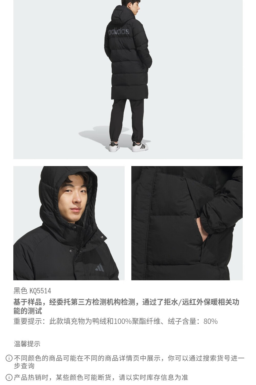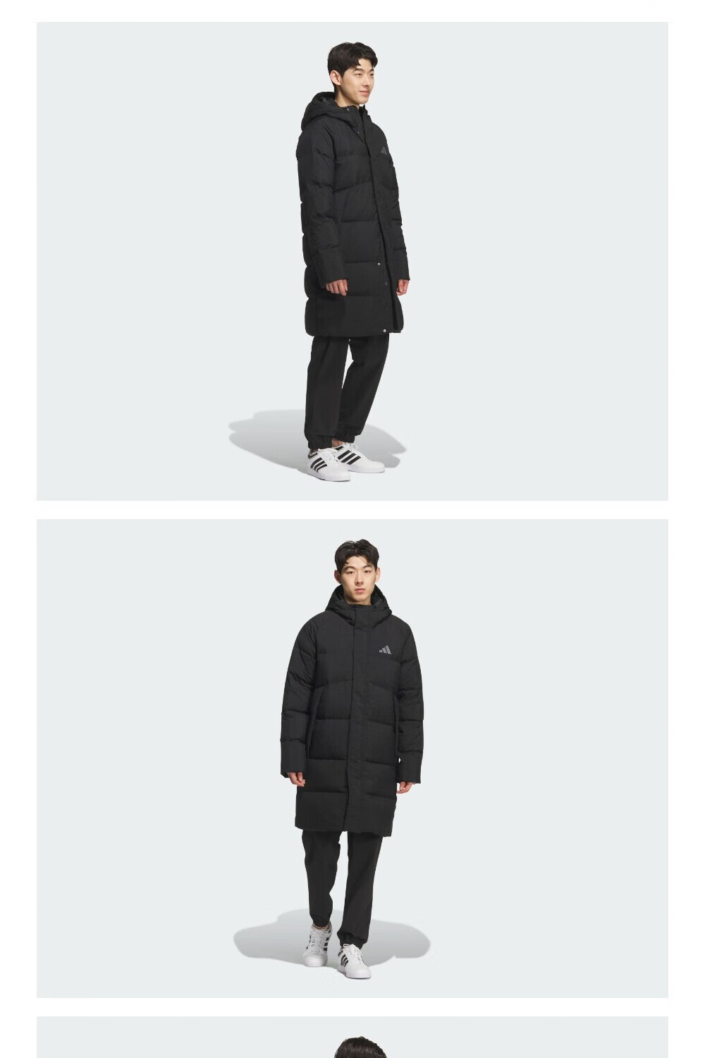 adidas 拒水暖「芯」科技长款保暖鸭绒连帽羽绒服男女阿迪达斯 黑色 M