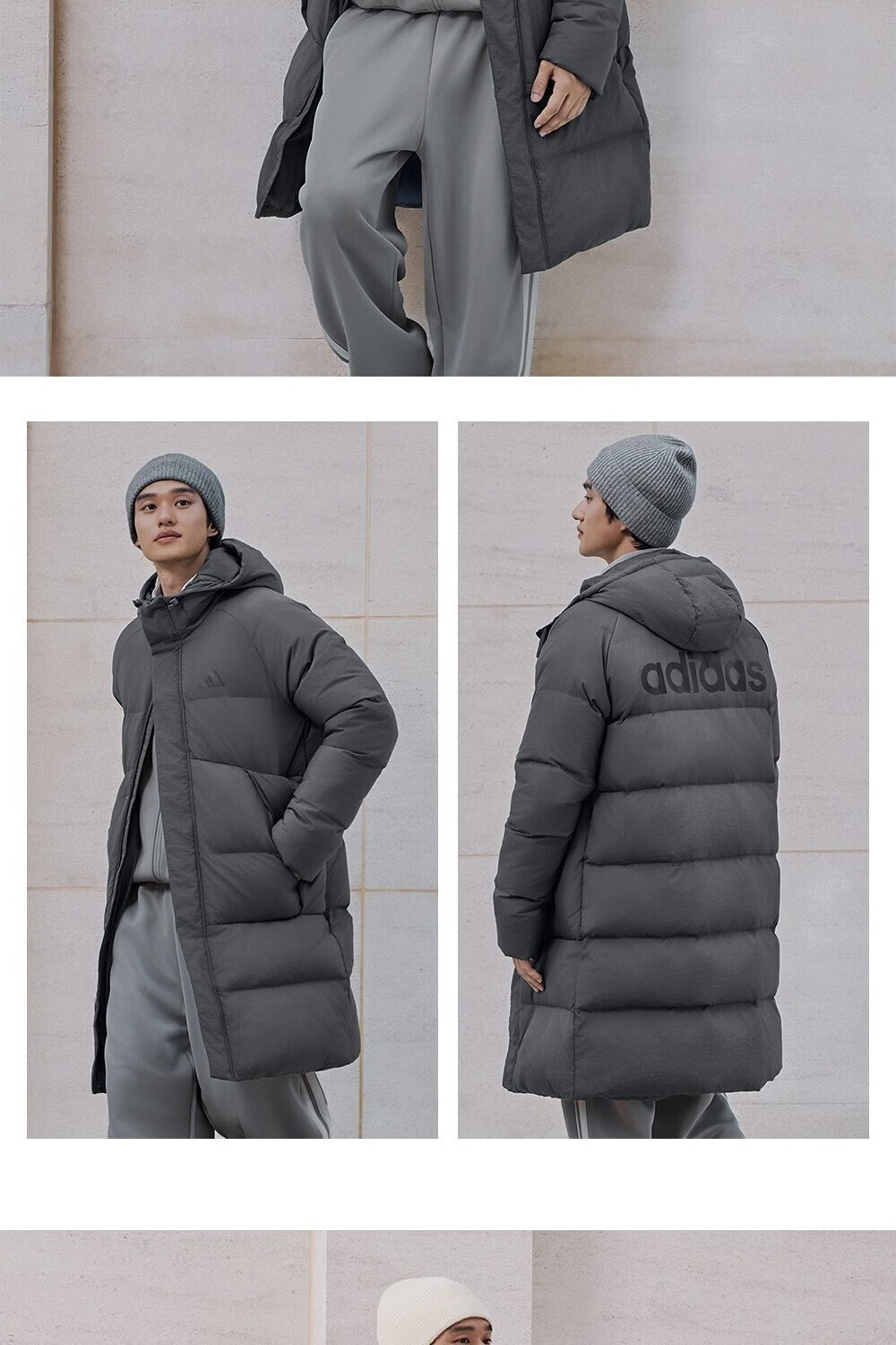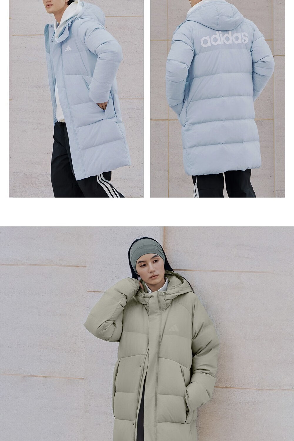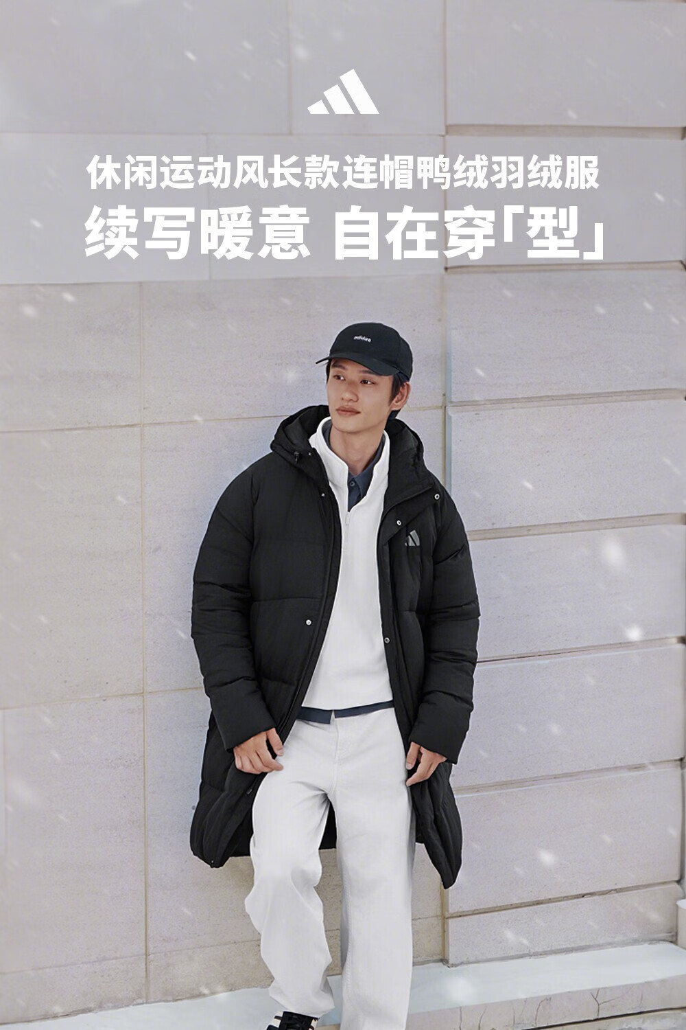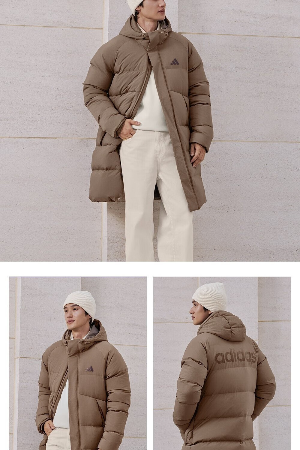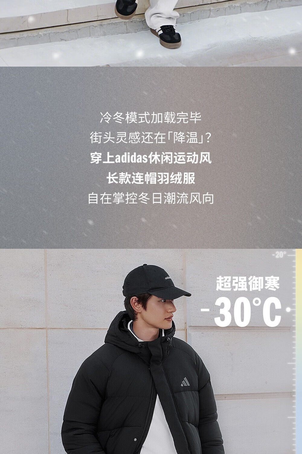 adidas 拒水暖「芯」科技长款保暖鸭绒连帽羽绒服男女阿迪达斯 黑色 M