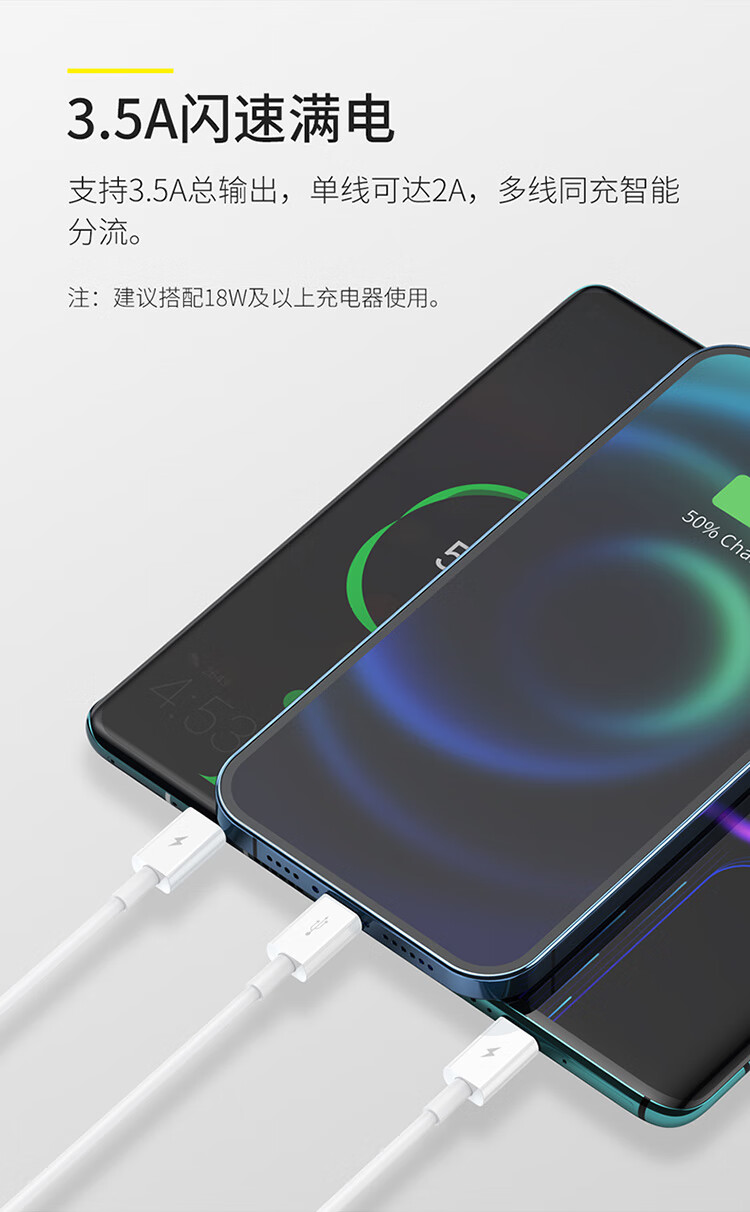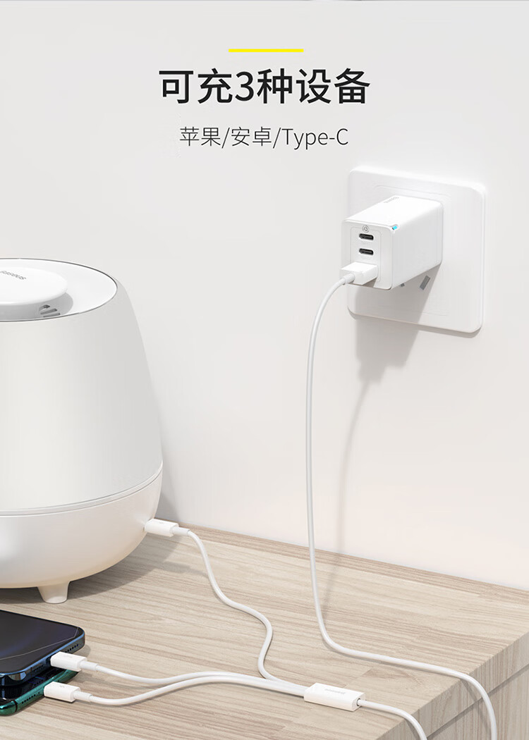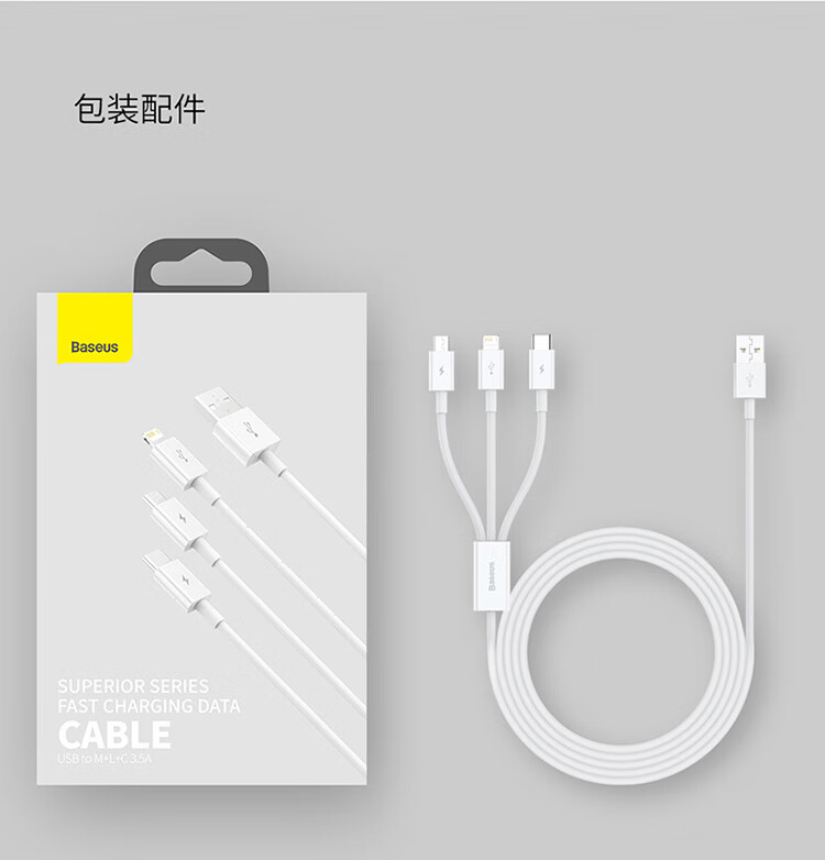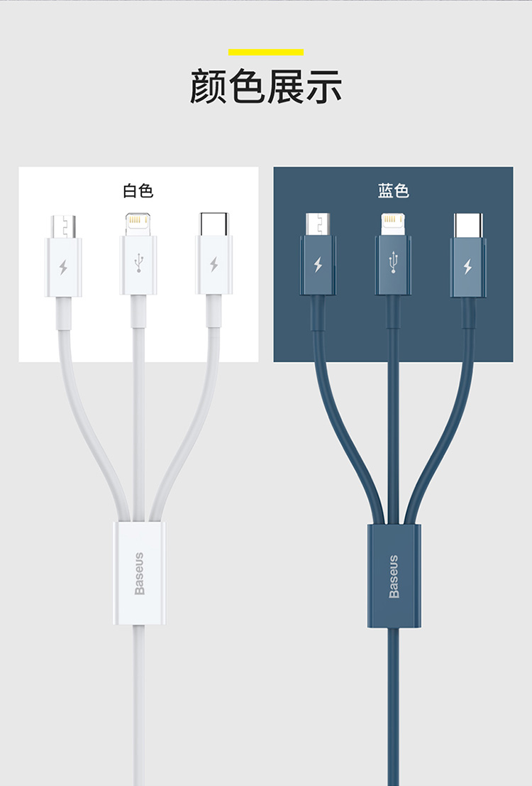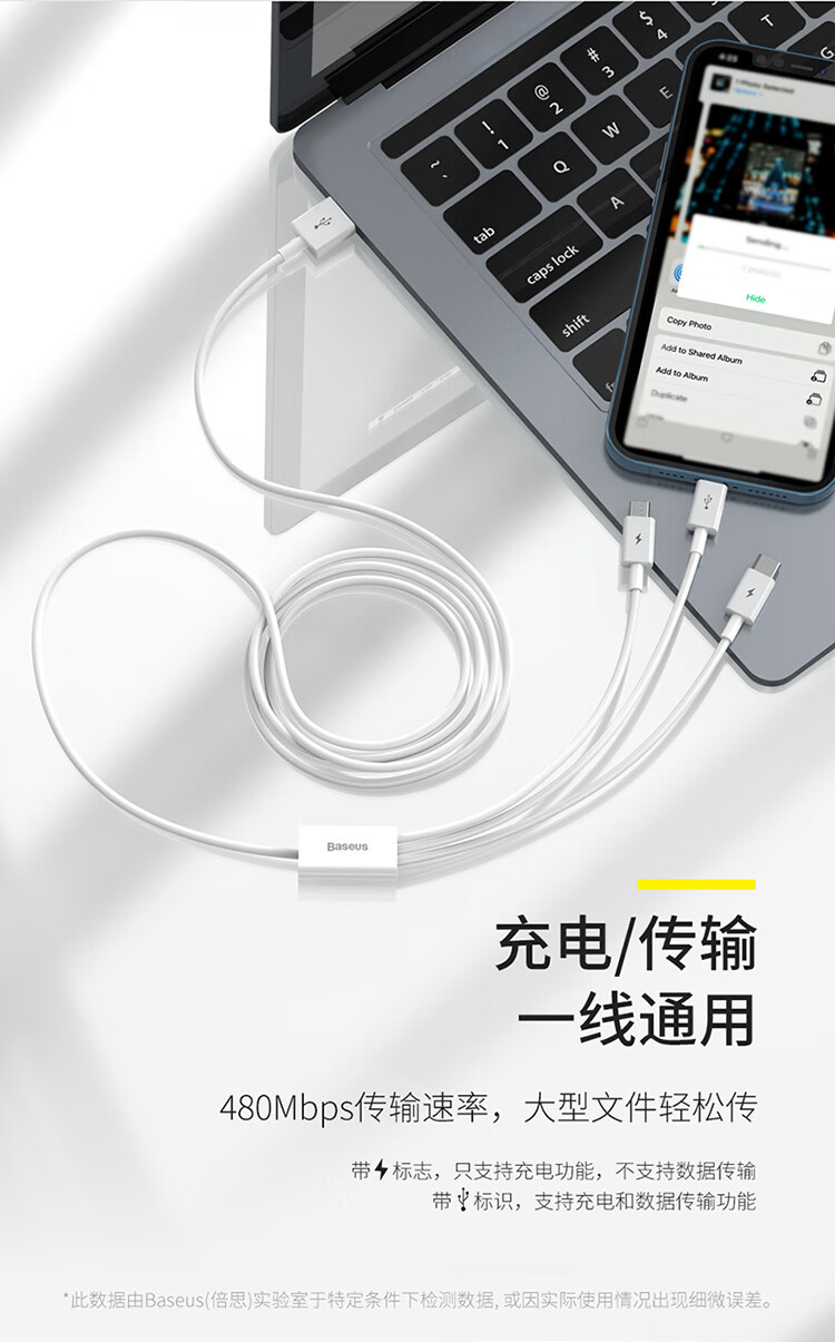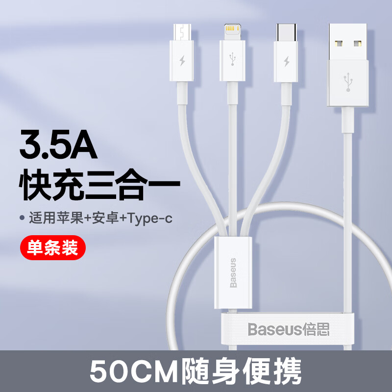 倍思数据线三合一苹果Type-c安卓充电线一拖三头适用小米华为荣耀苹果iphone16/15/14手机车载0.5米白