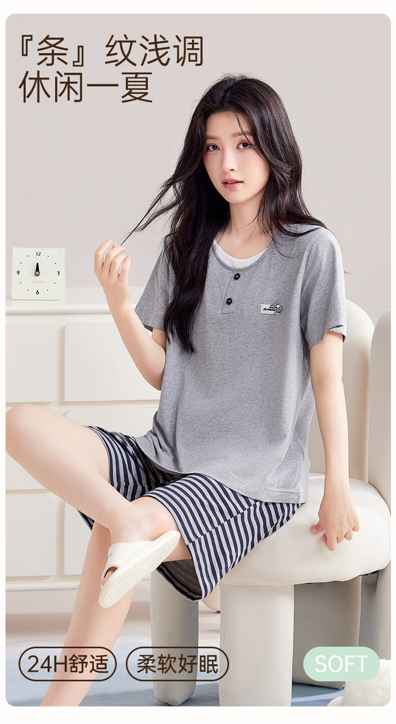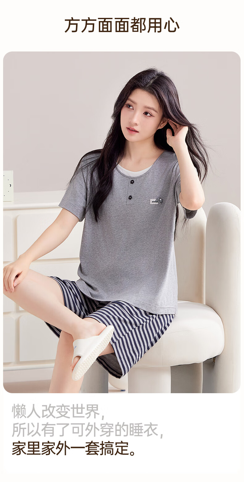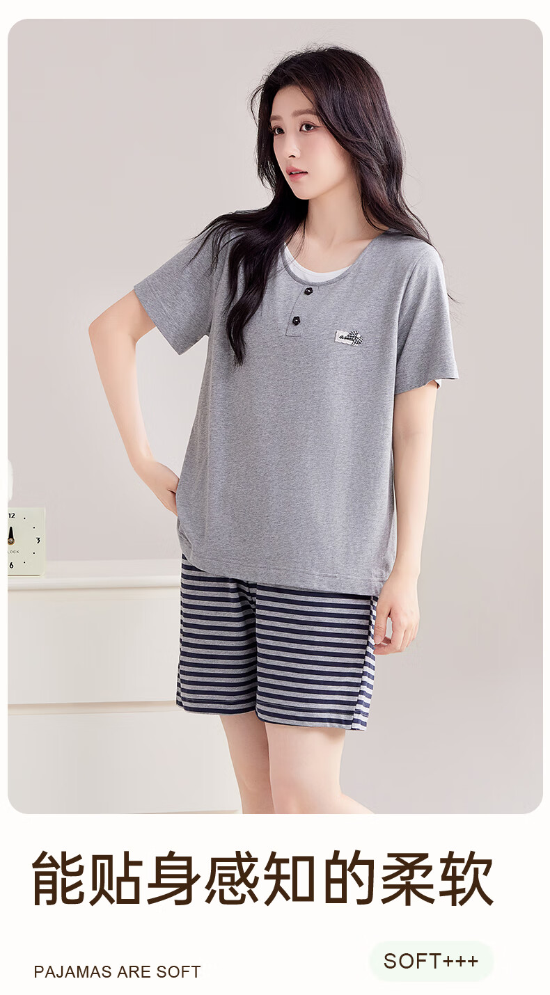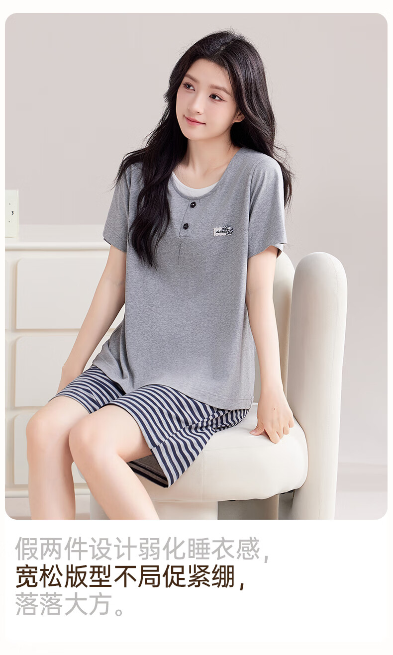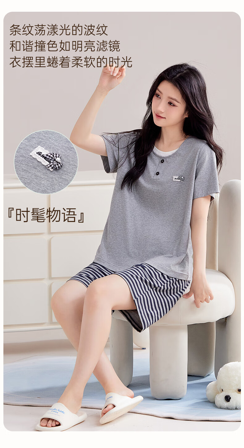 玛伦萨睡衣女夏季2025新款薄款可外穿短袖短裤套装条纹女士家居服 花灰 M