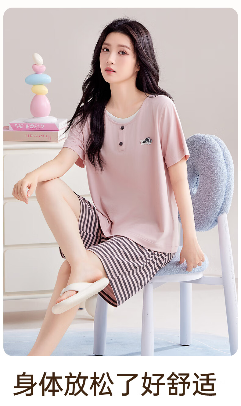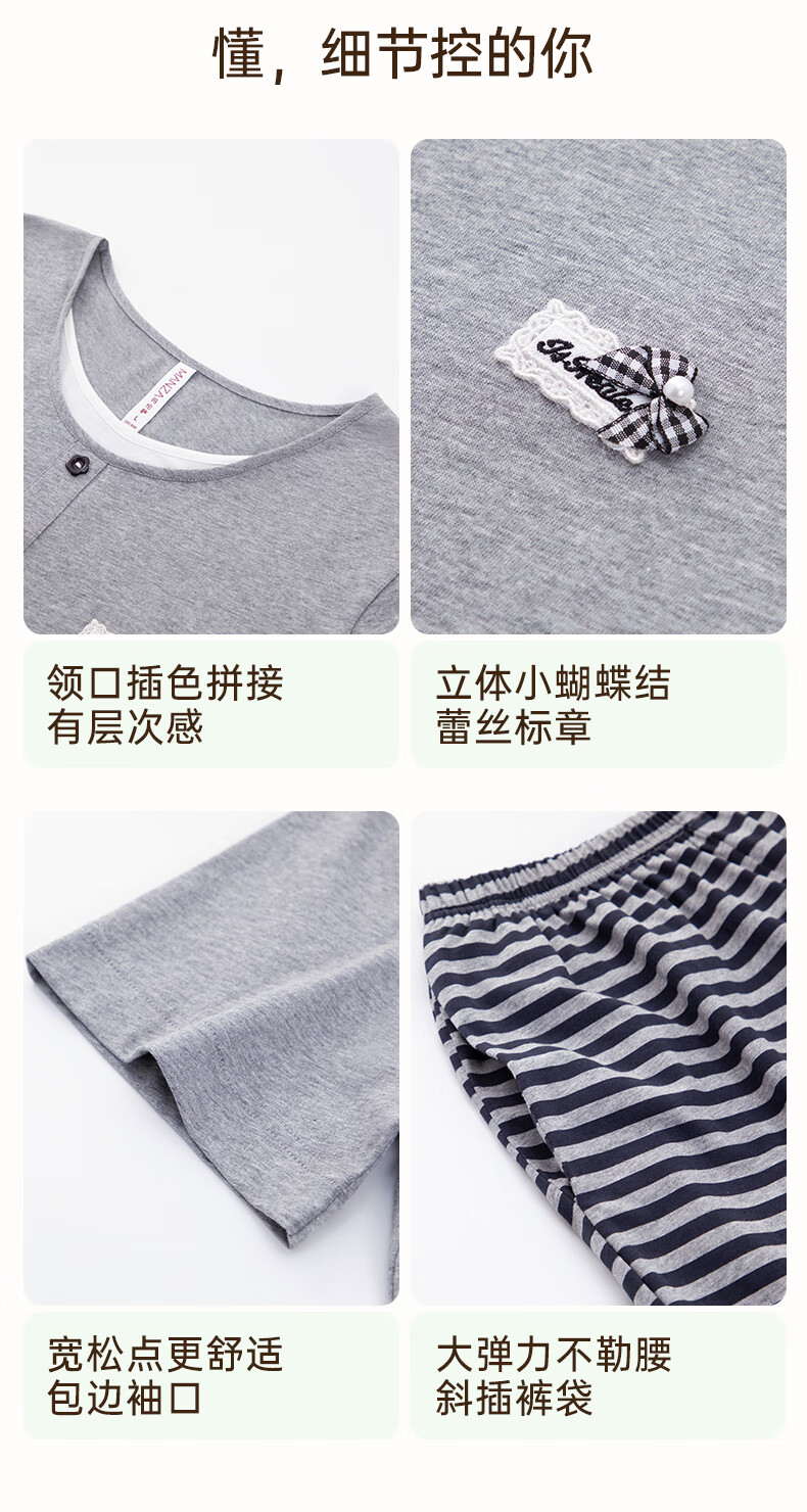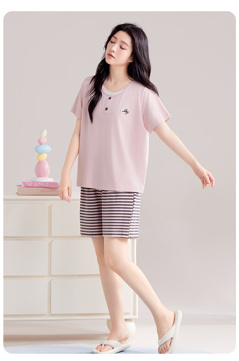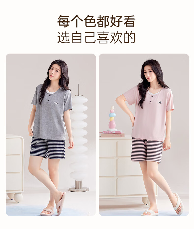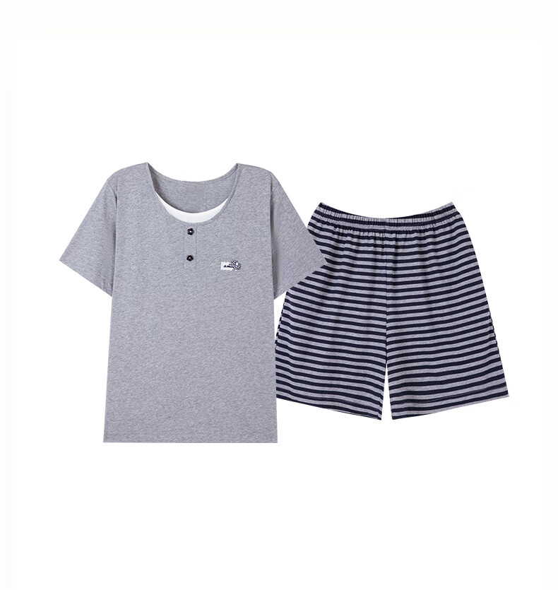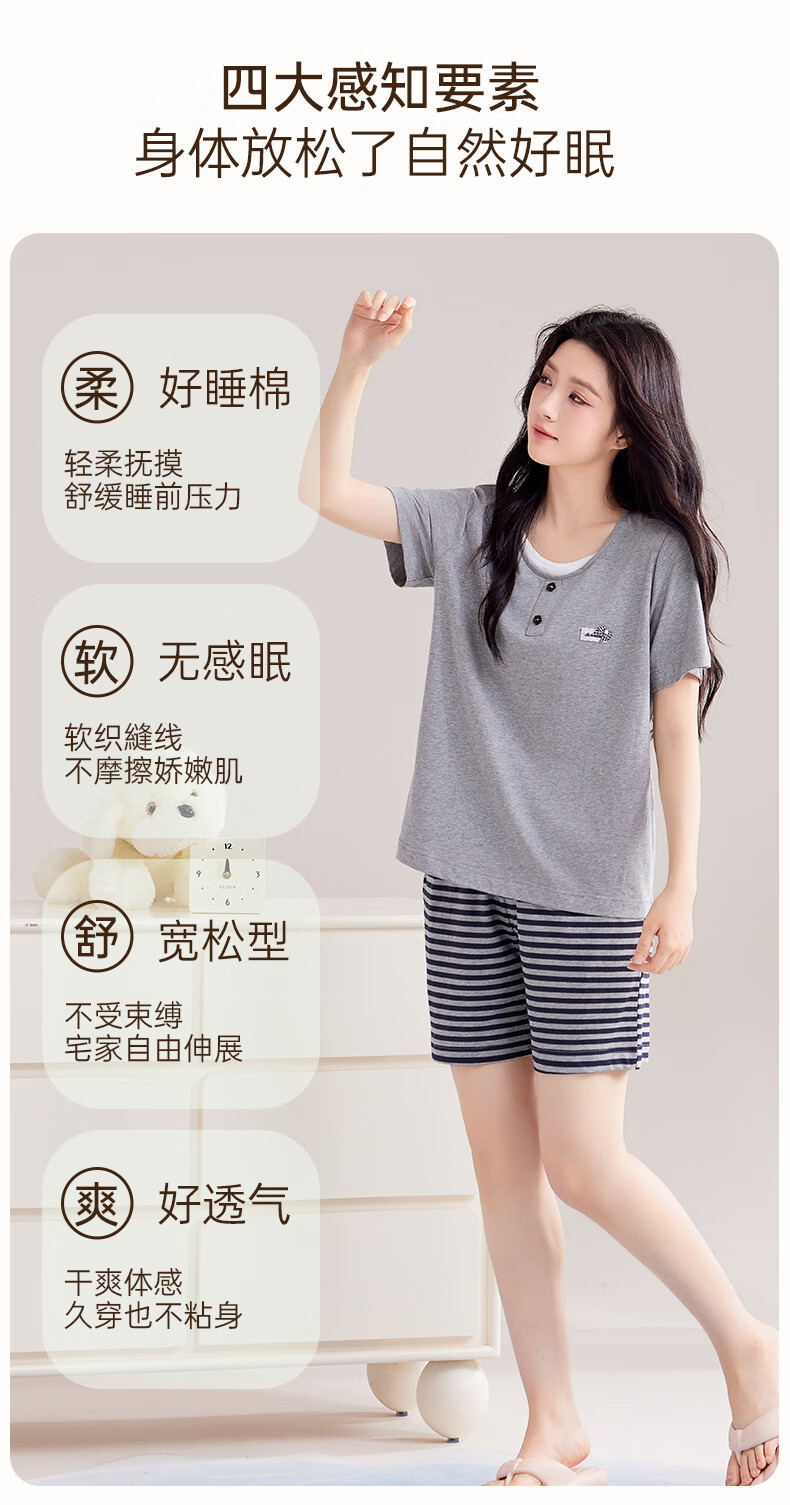 玛伦萨睡衣女夏季2025新款薄款可外穿短袖短裤套装条纹女士家居服 花灰 M