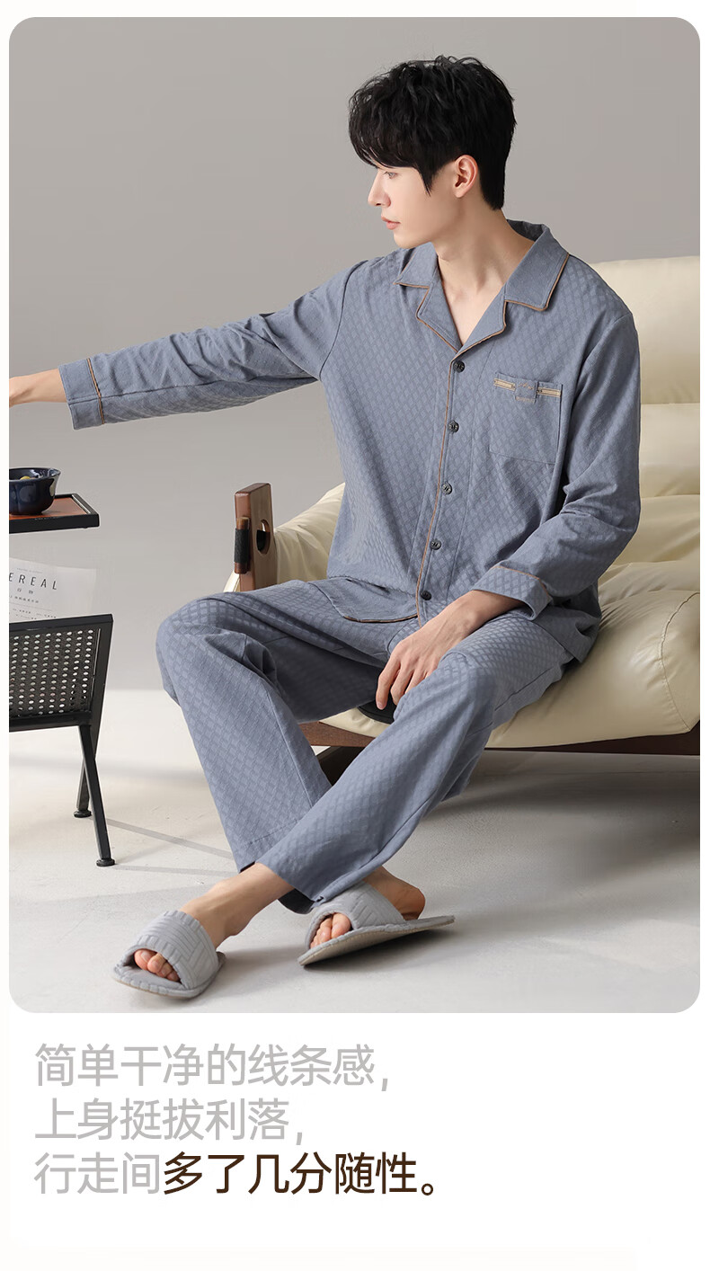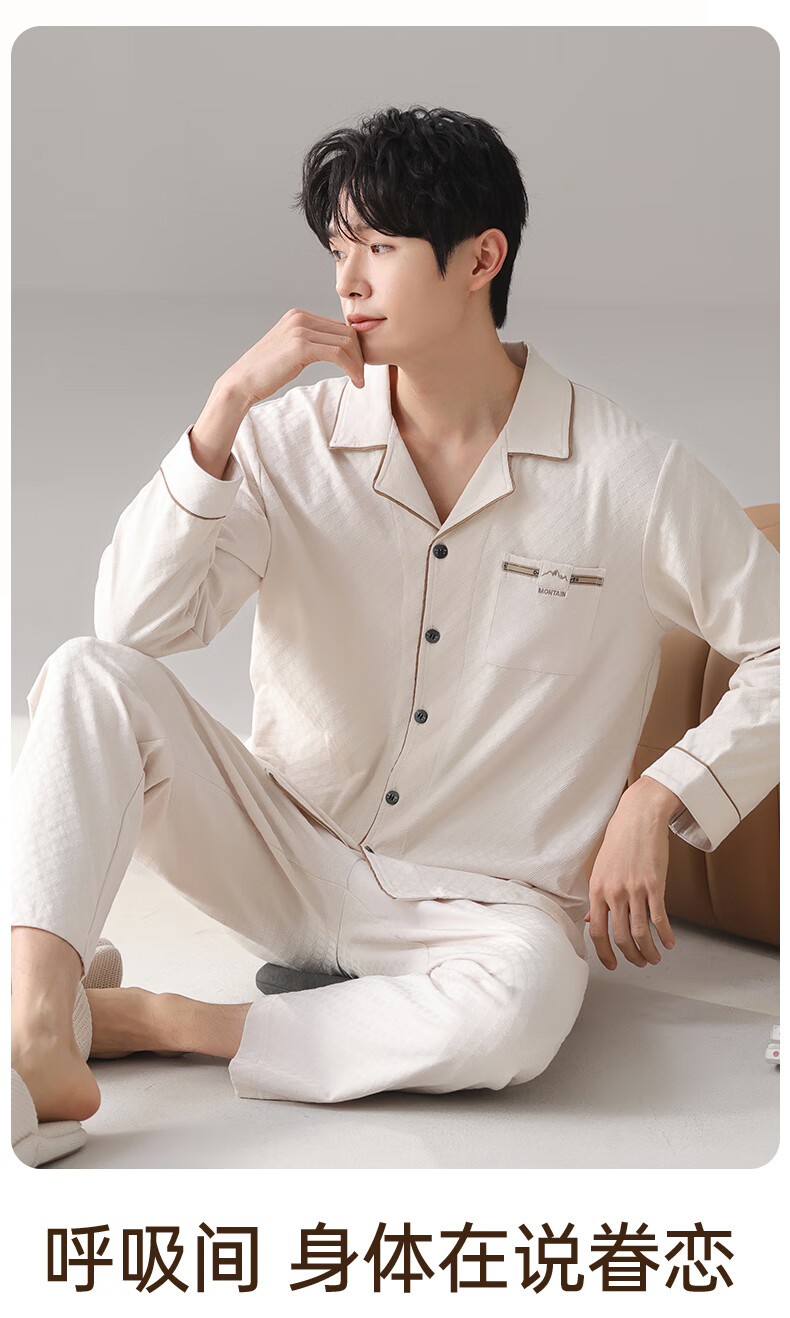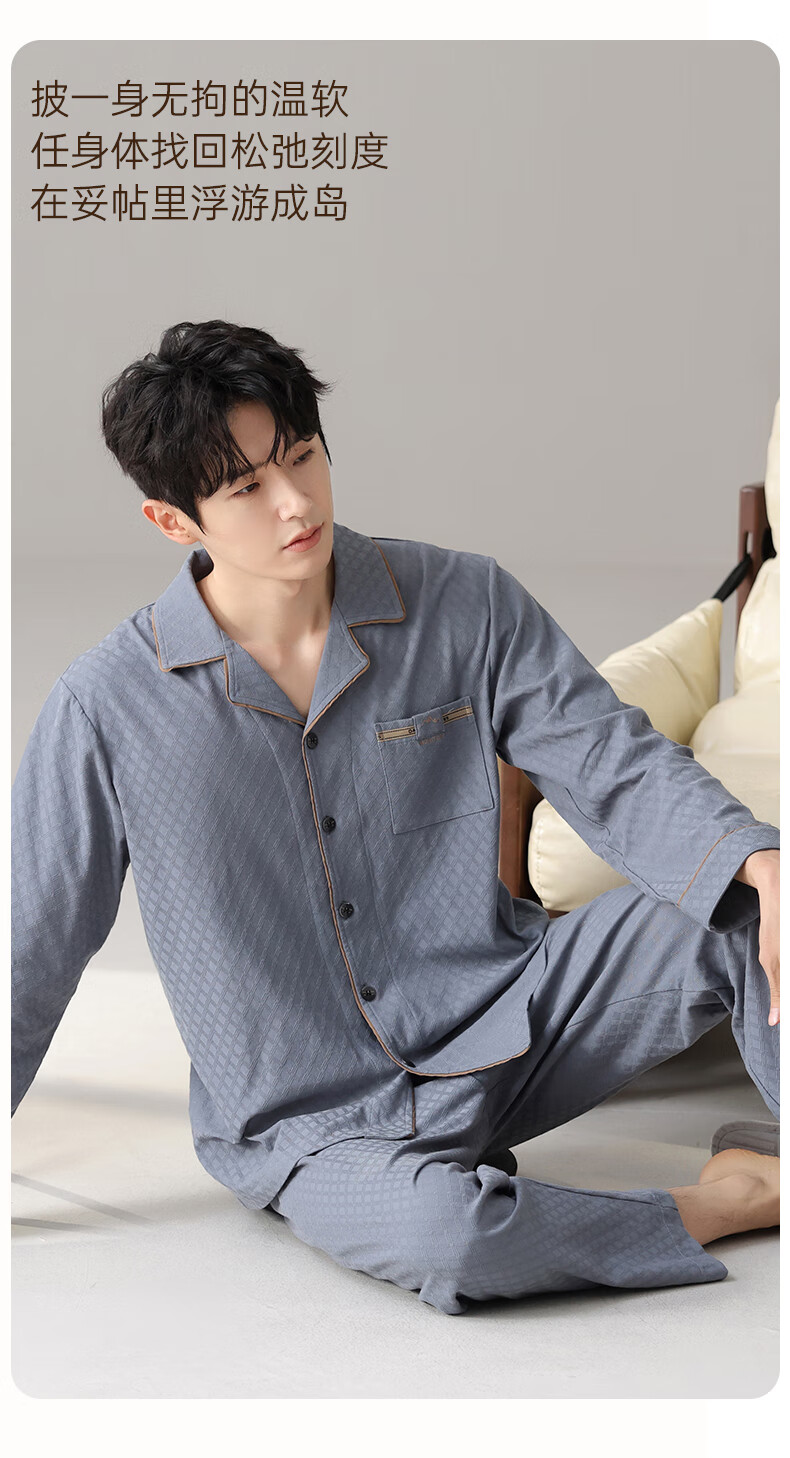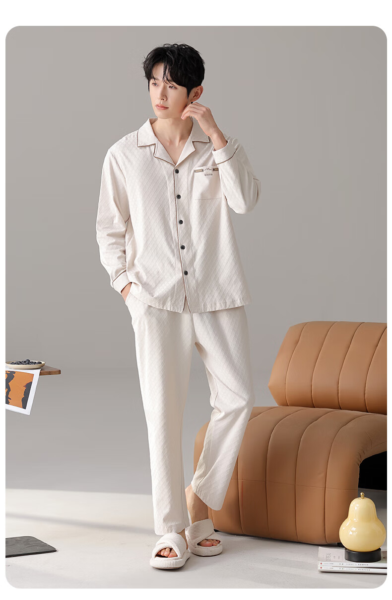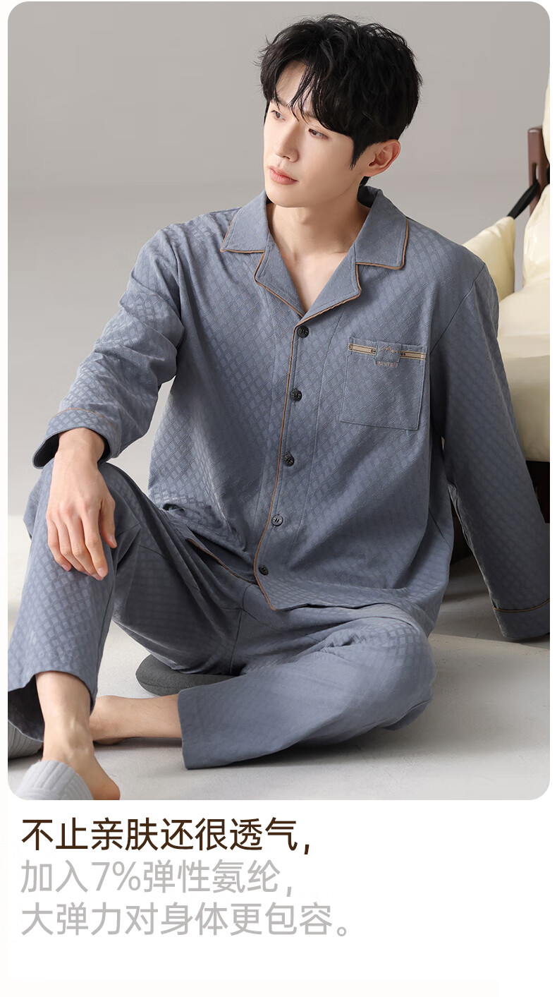 玛伦萨睡衣男春秋季2025新款可外穿长袖长裤翻领柔软透气大码男士家居服 杏灰 L