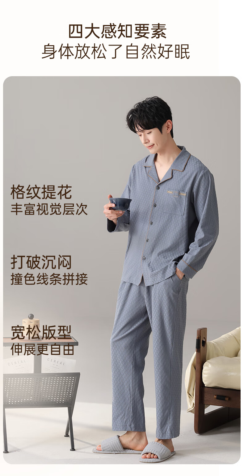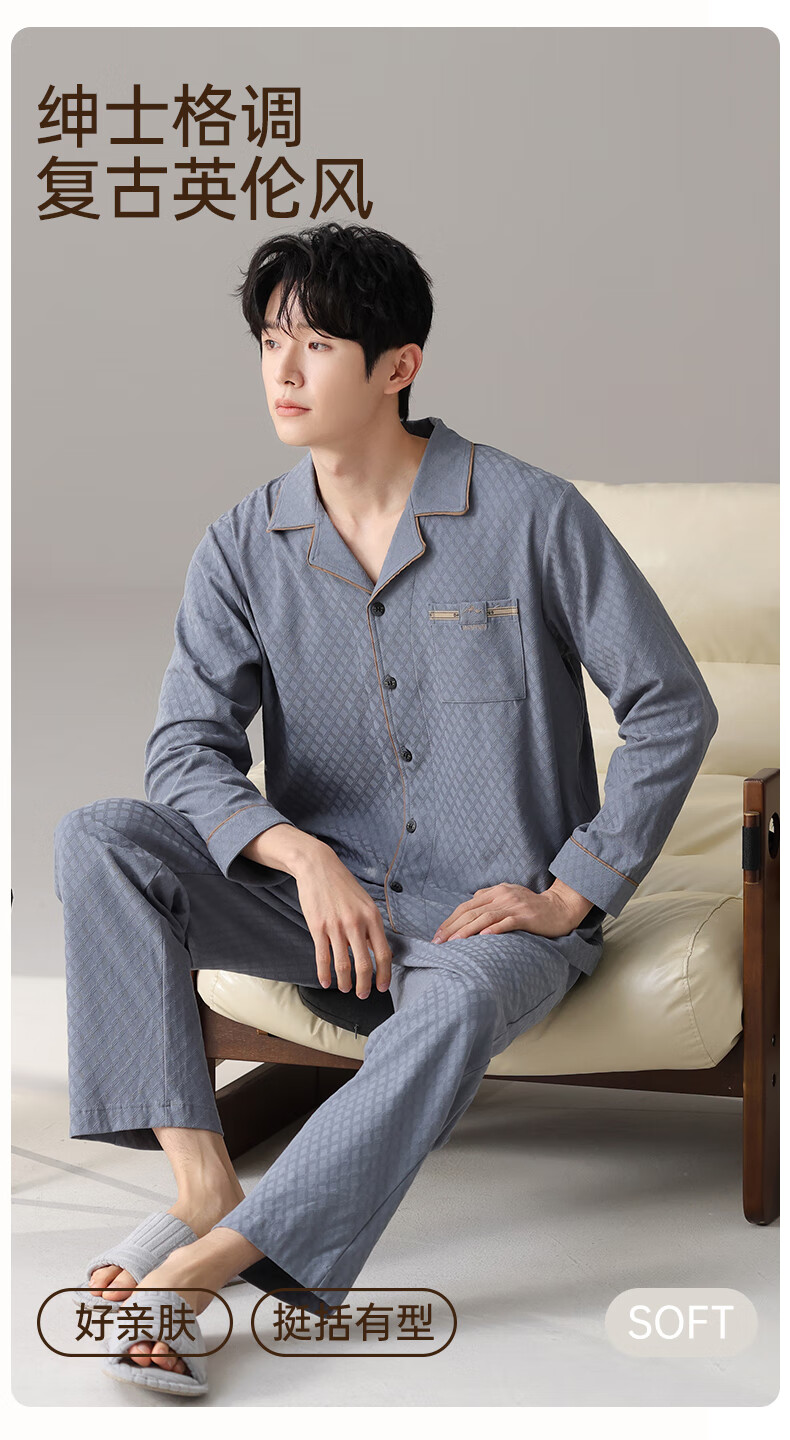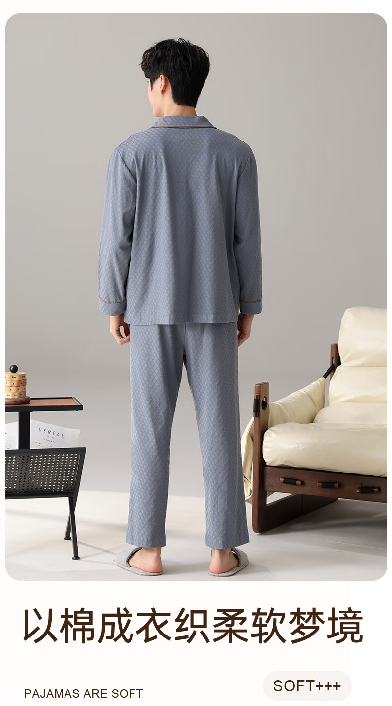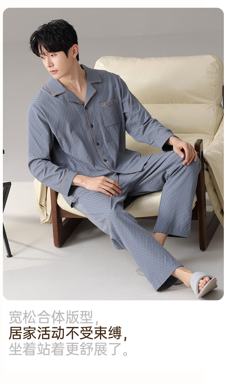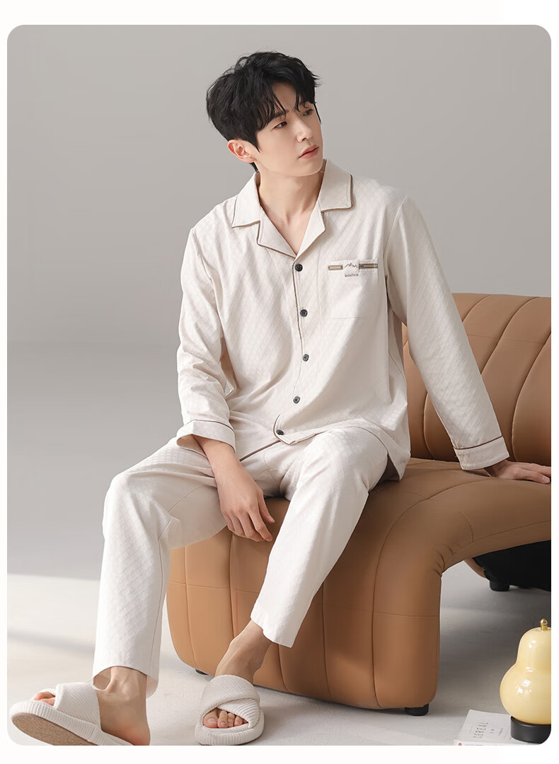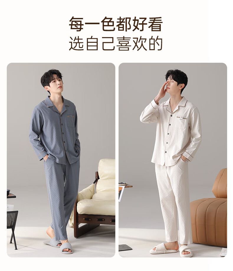玛伦萨睡衣男春秋季2025新款可外穿长袖长裤翻领柔软透气大码男士家居服 杏灰 L