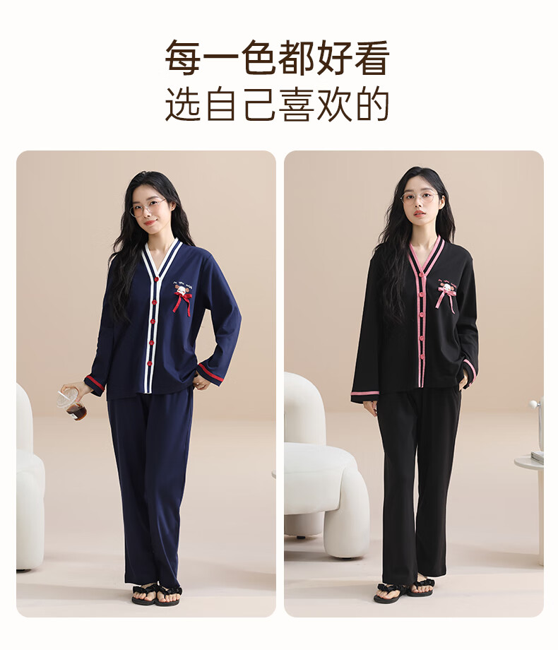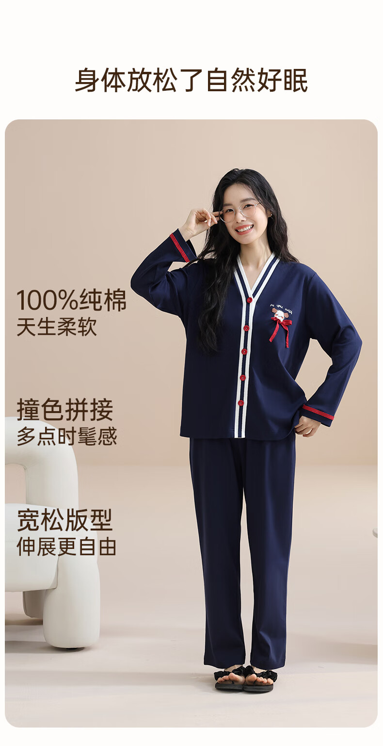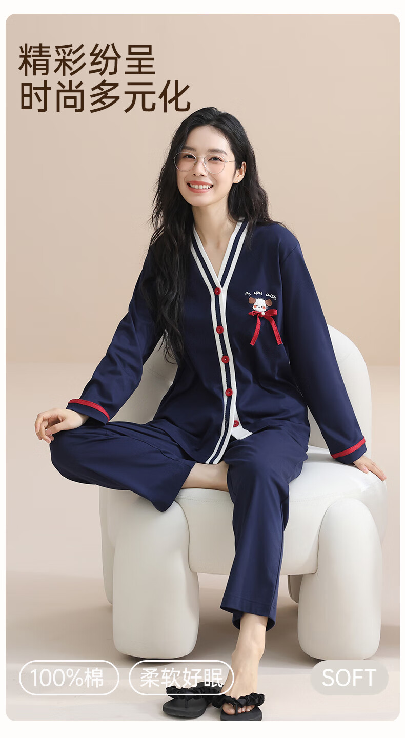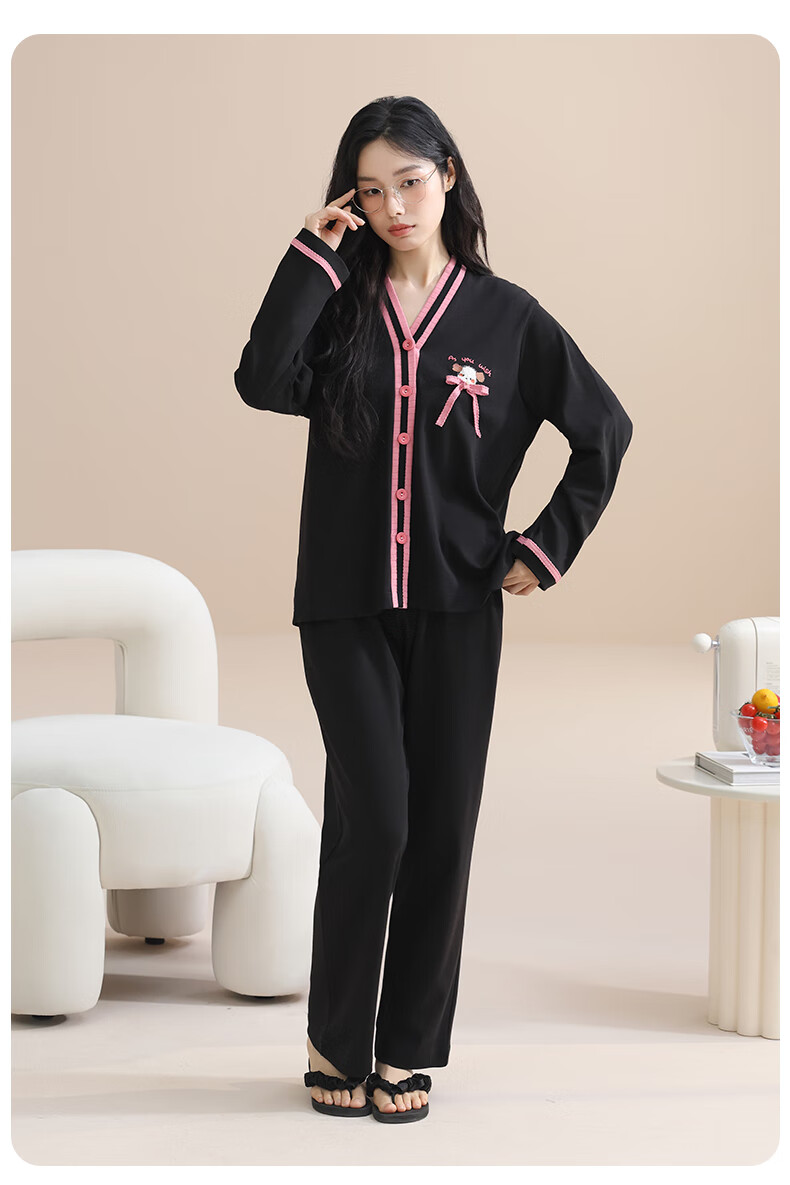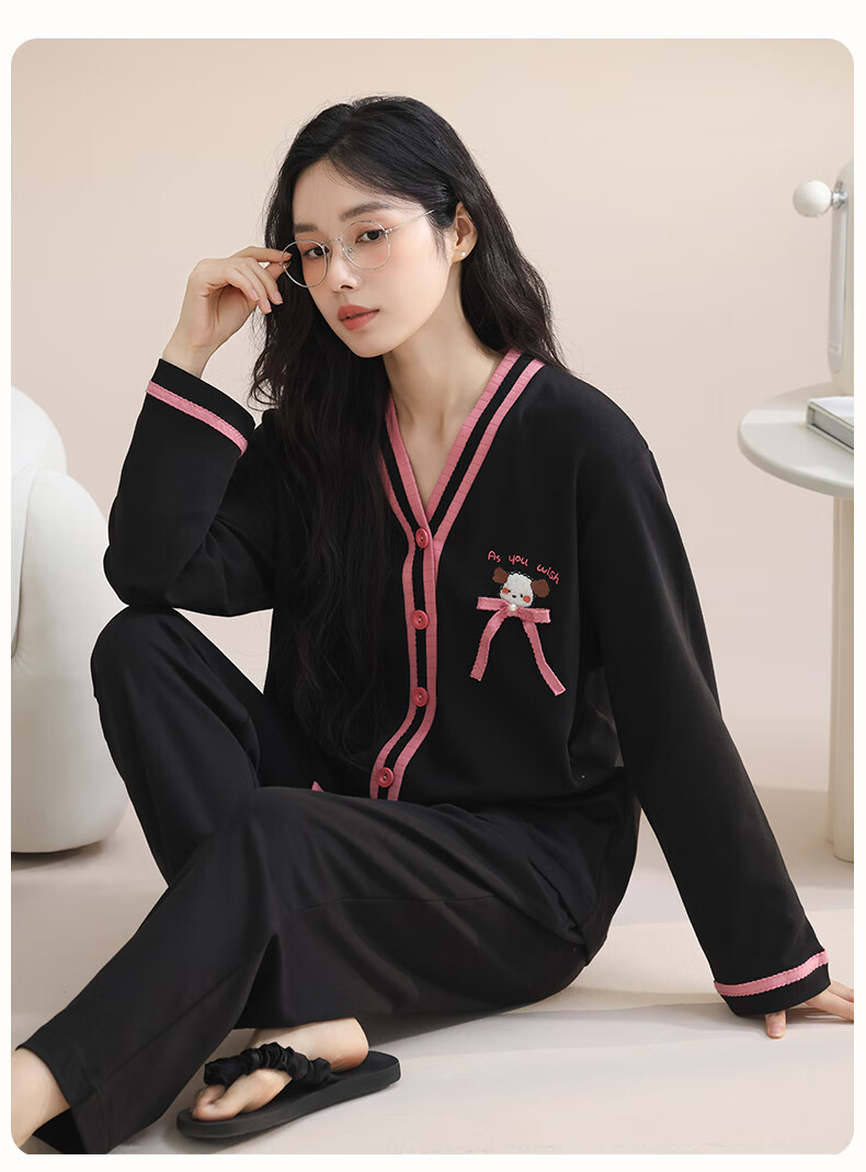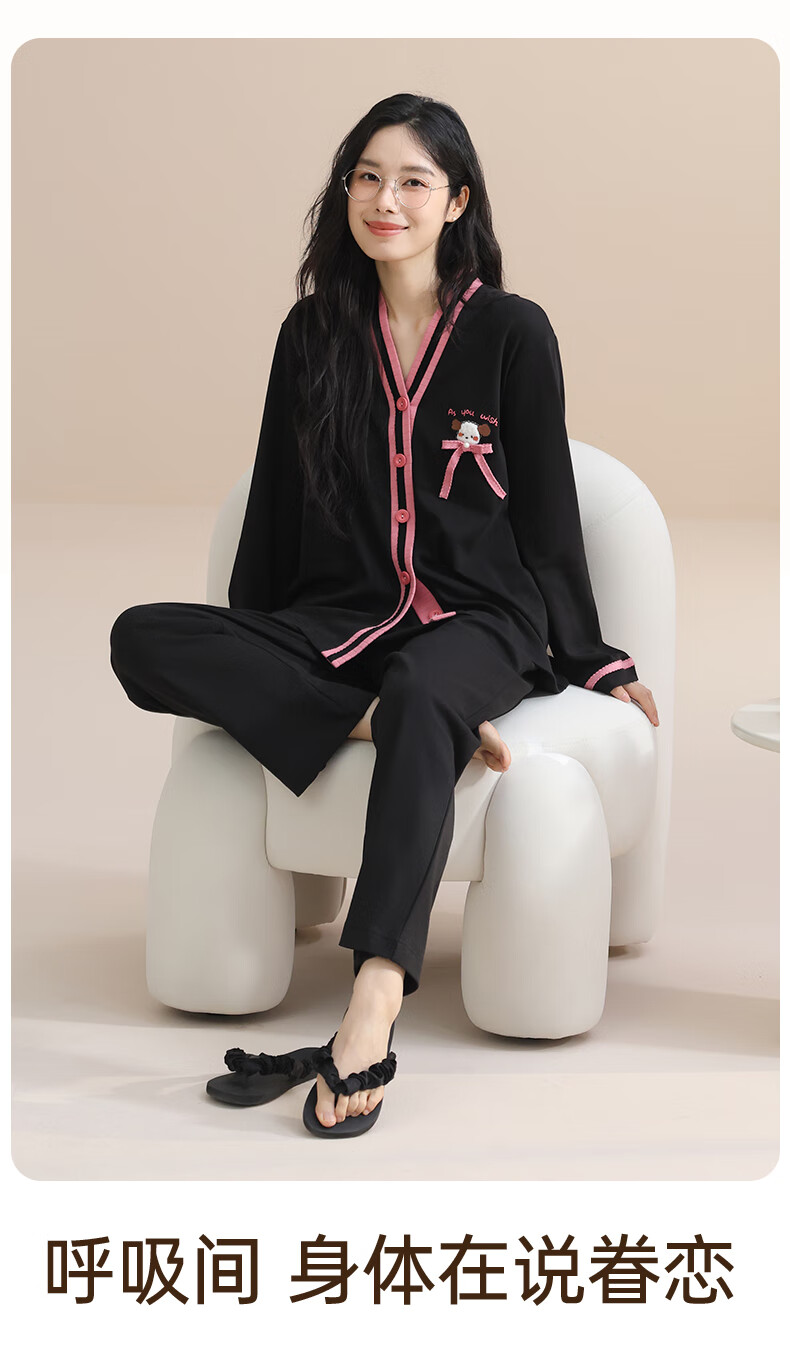 玛伦萨100%纯棉睡衣女春秋季可外穿2025新款柔软透气长袖长裤女士家居服 黑色 M
