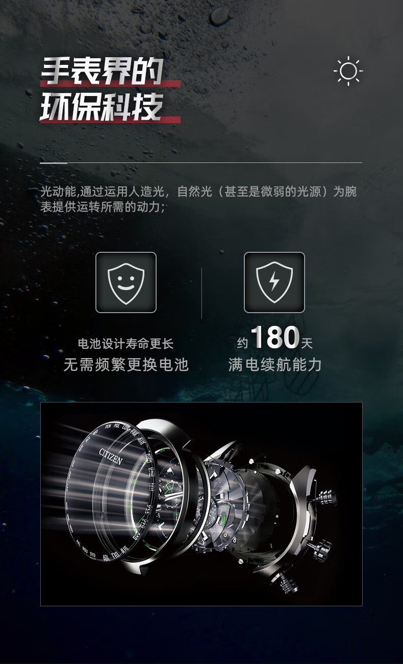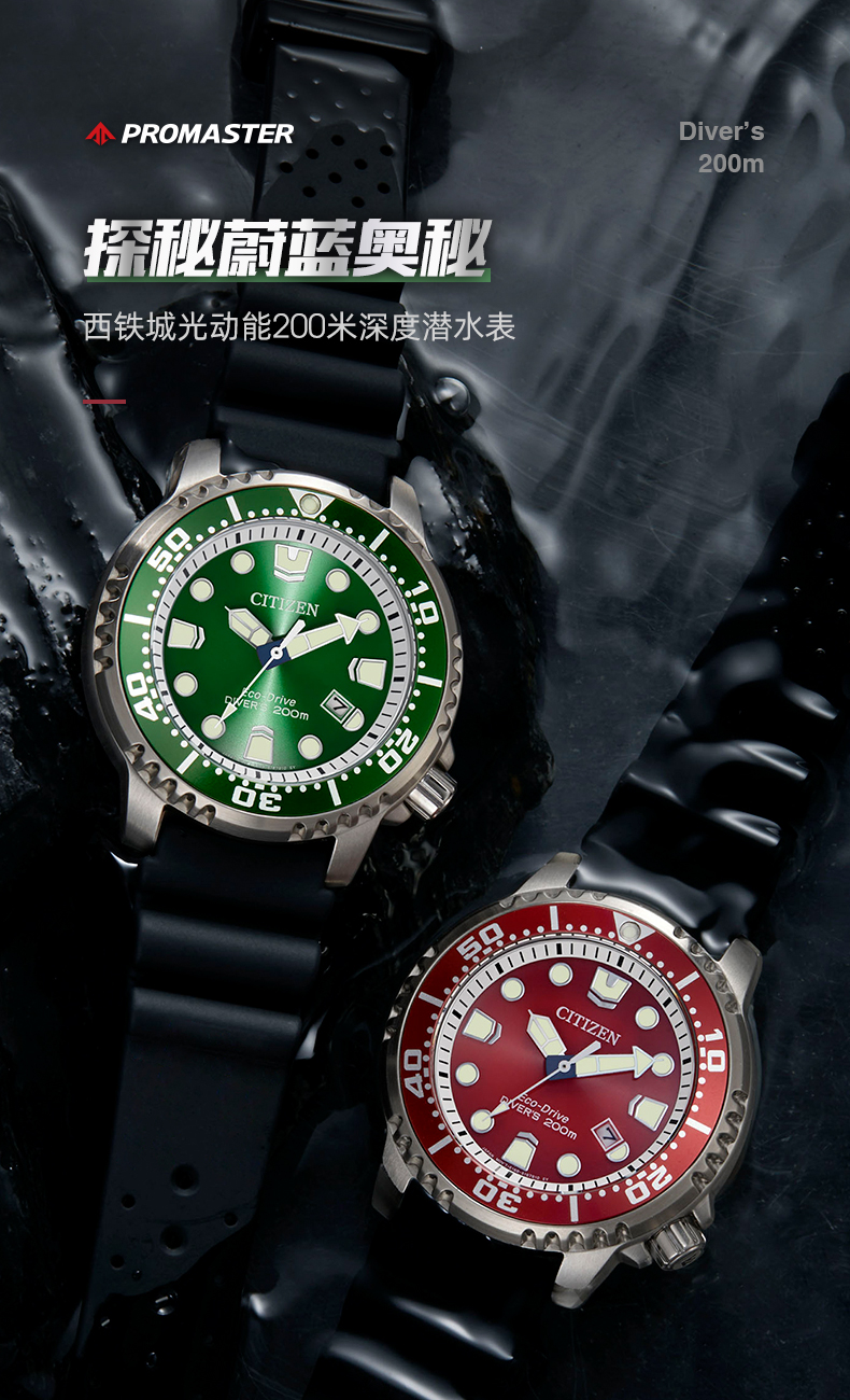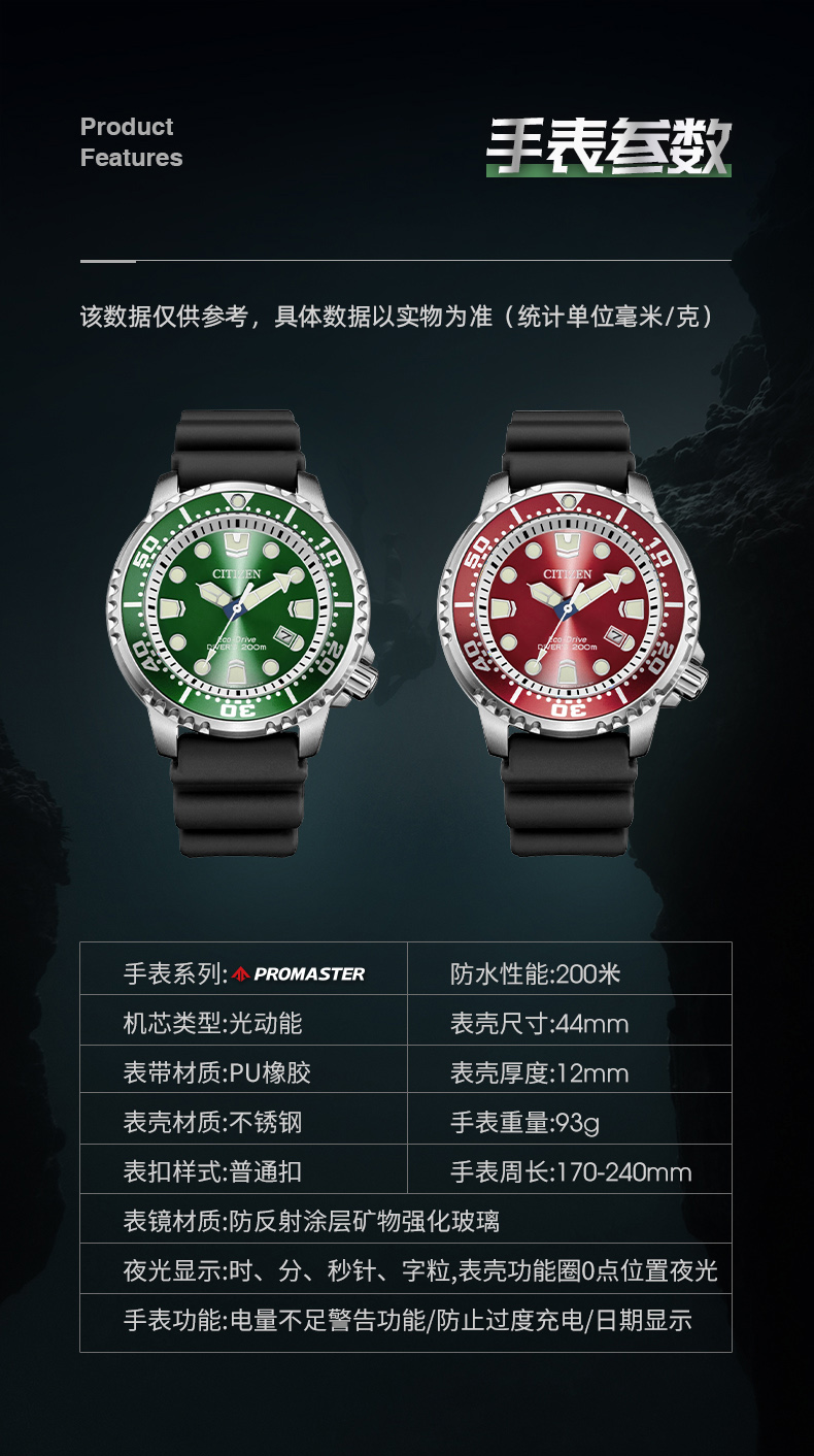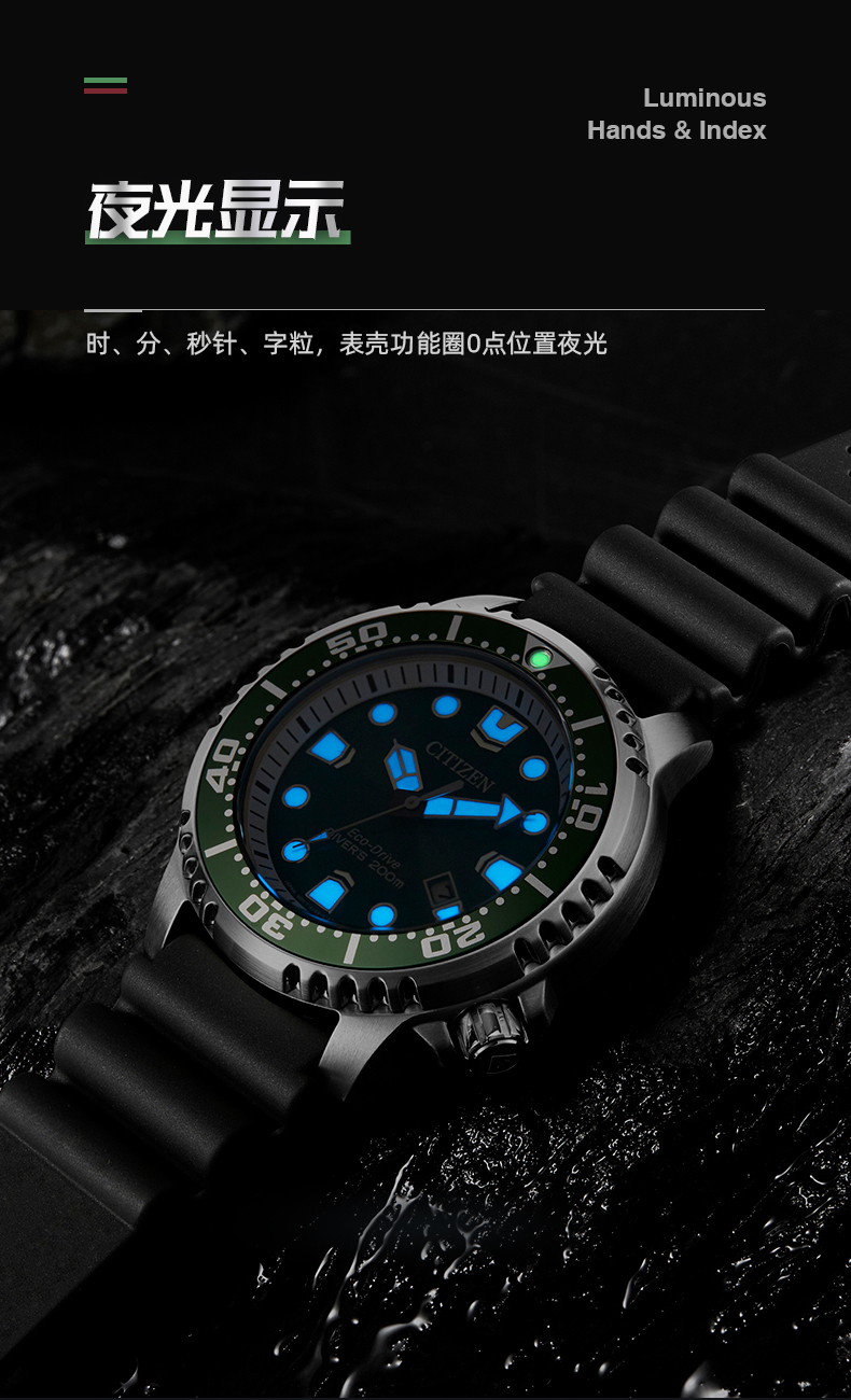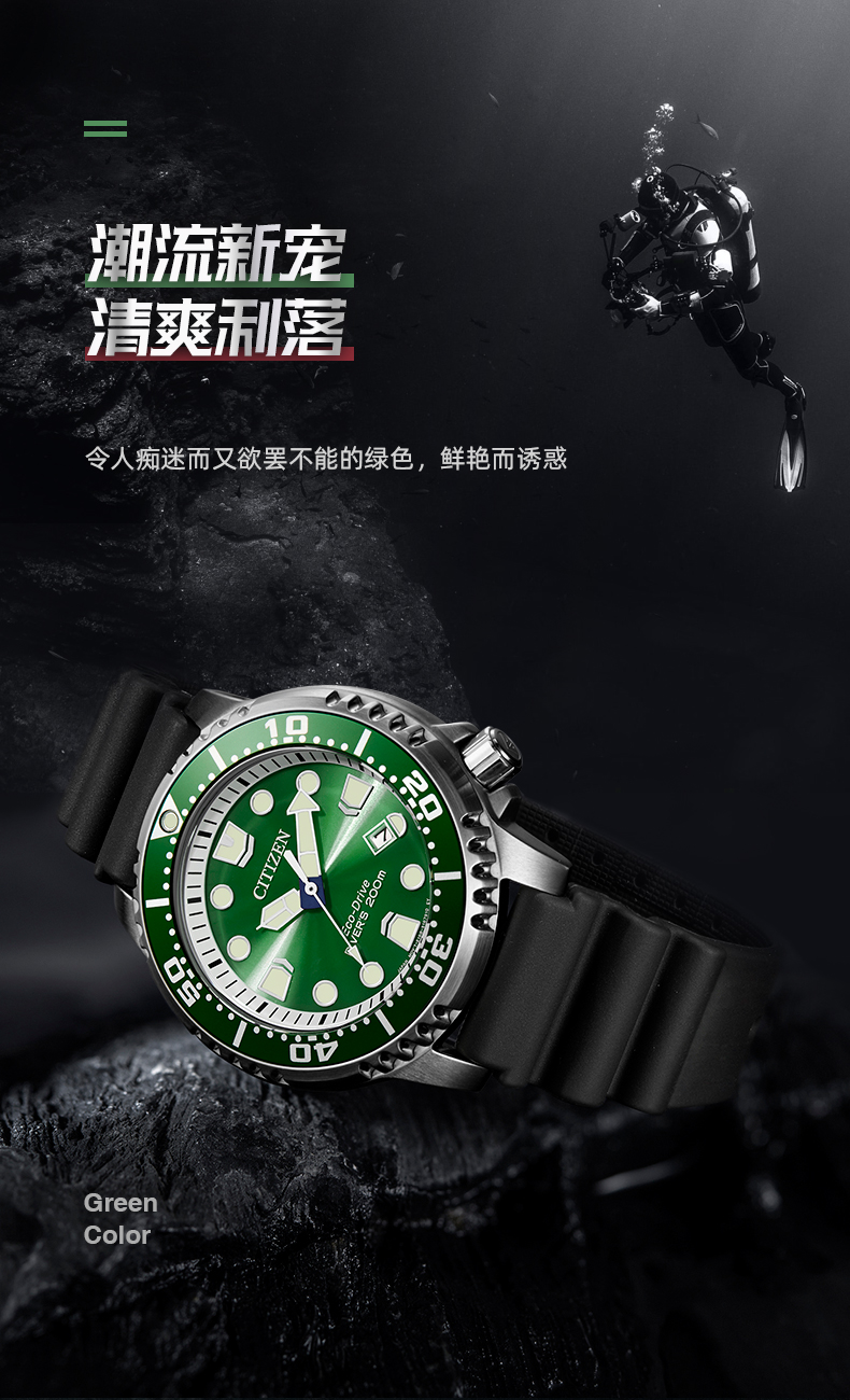西铁城(CITIZEN)手表男日韩表绿水鬼光动能日显PU带运动送礼物男友BN0158-18X