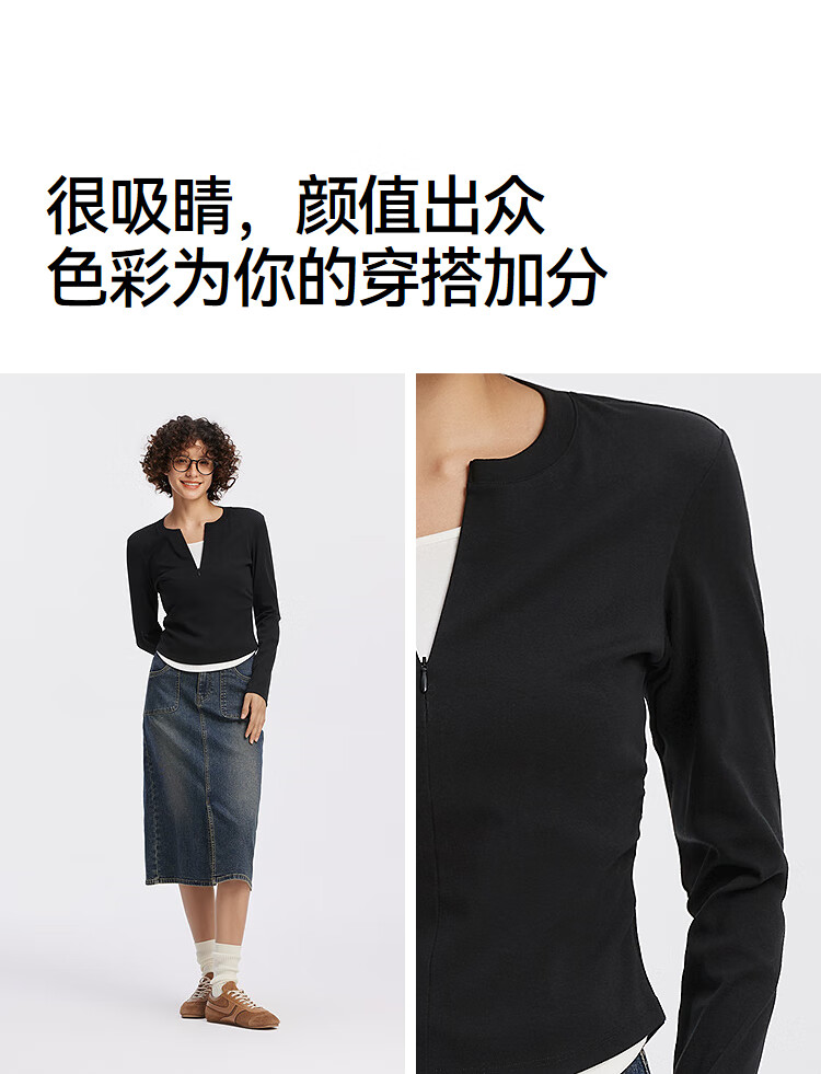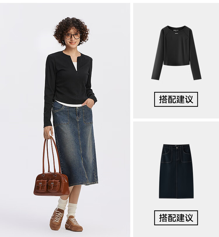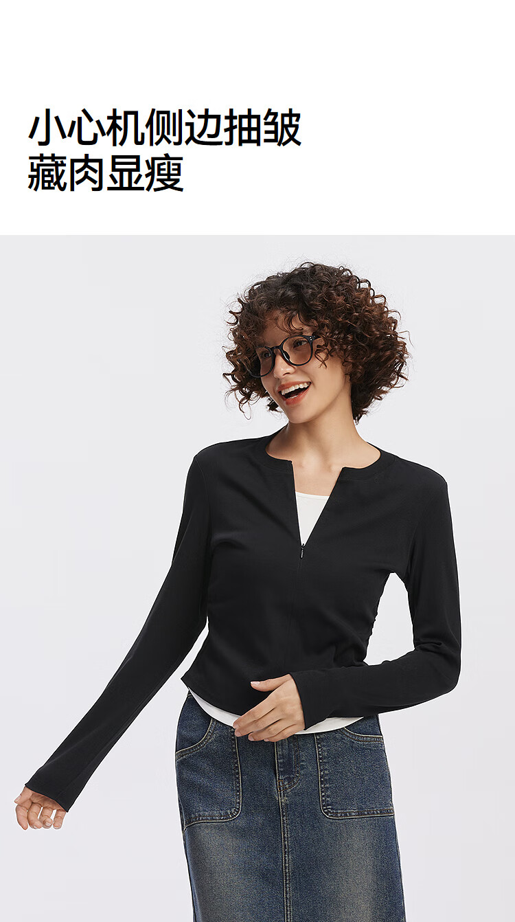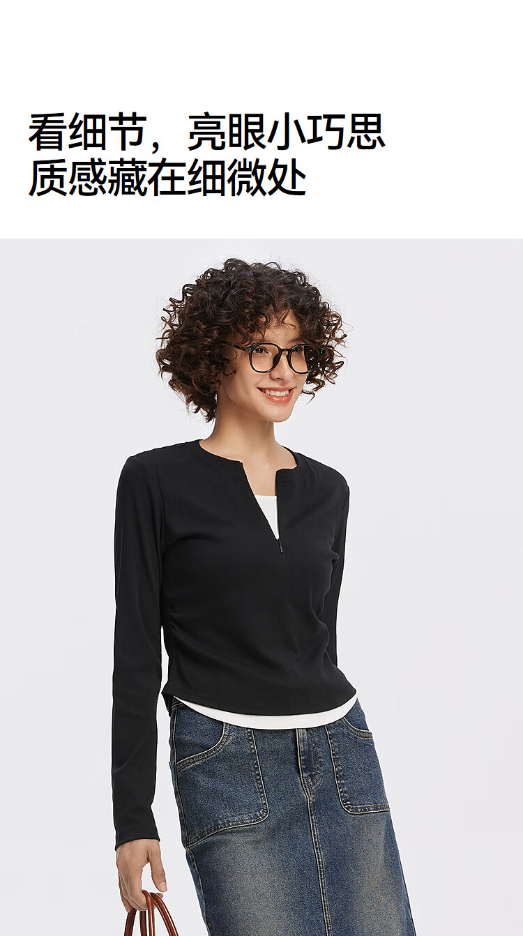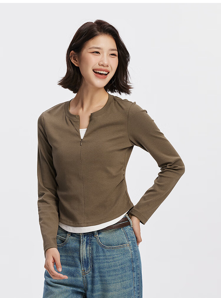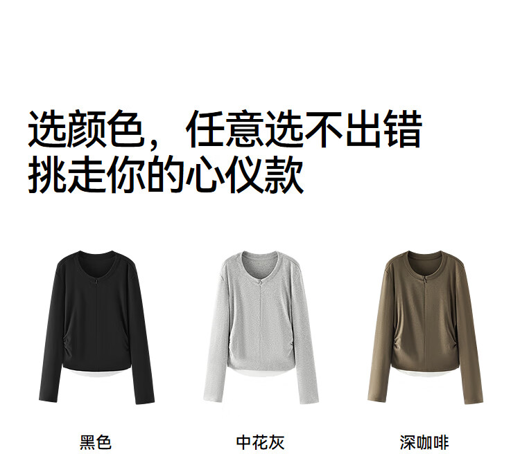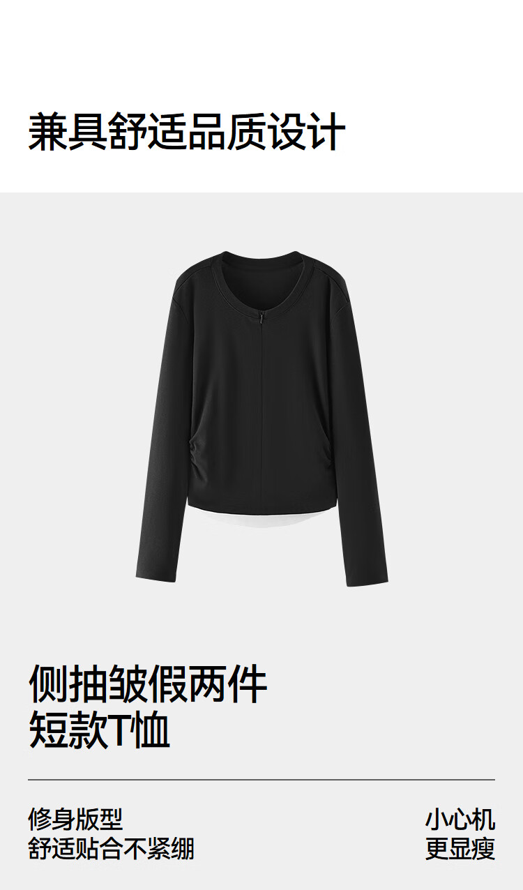 森马[商场同款]长袖T恤女短款显瘦设计感2025新款修身假两件秋装 深咖啡50976 M