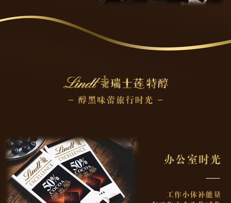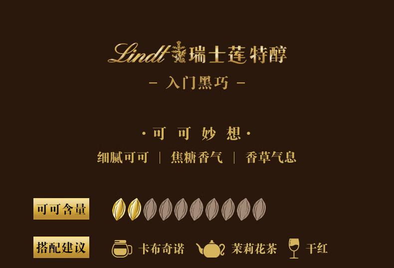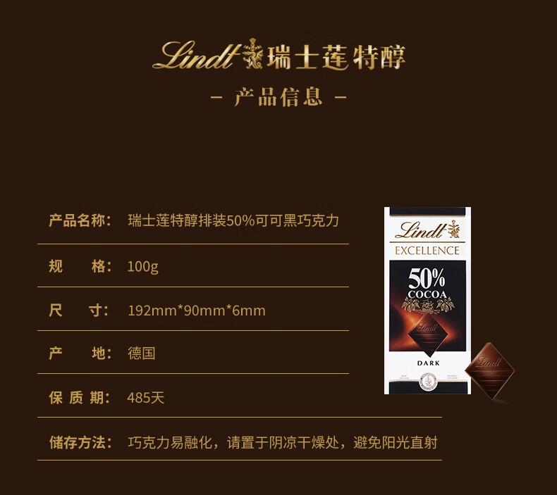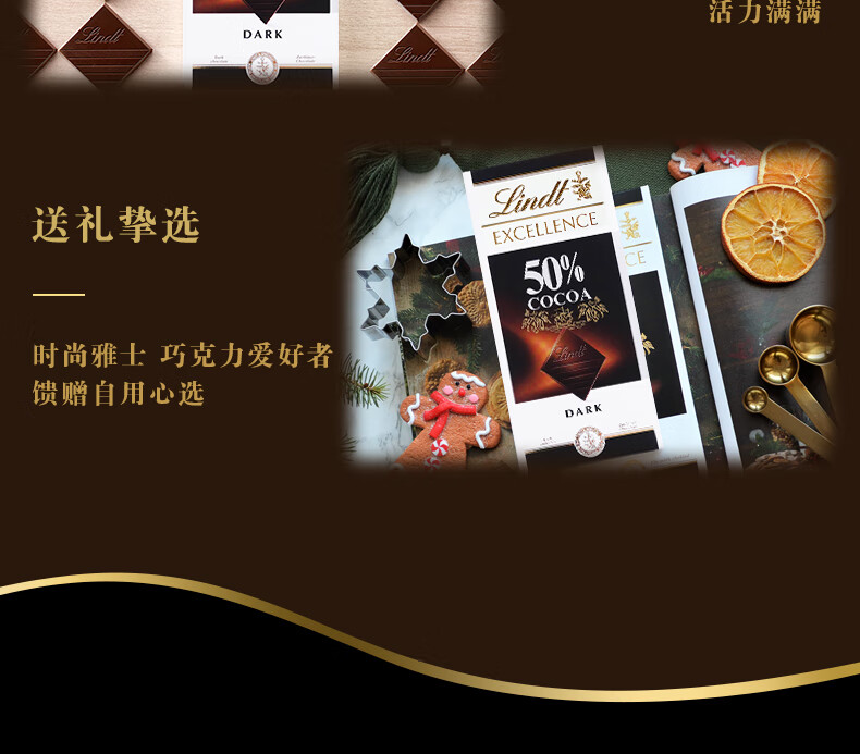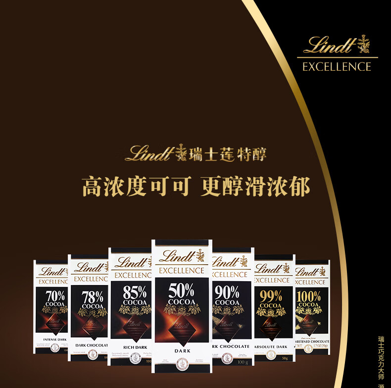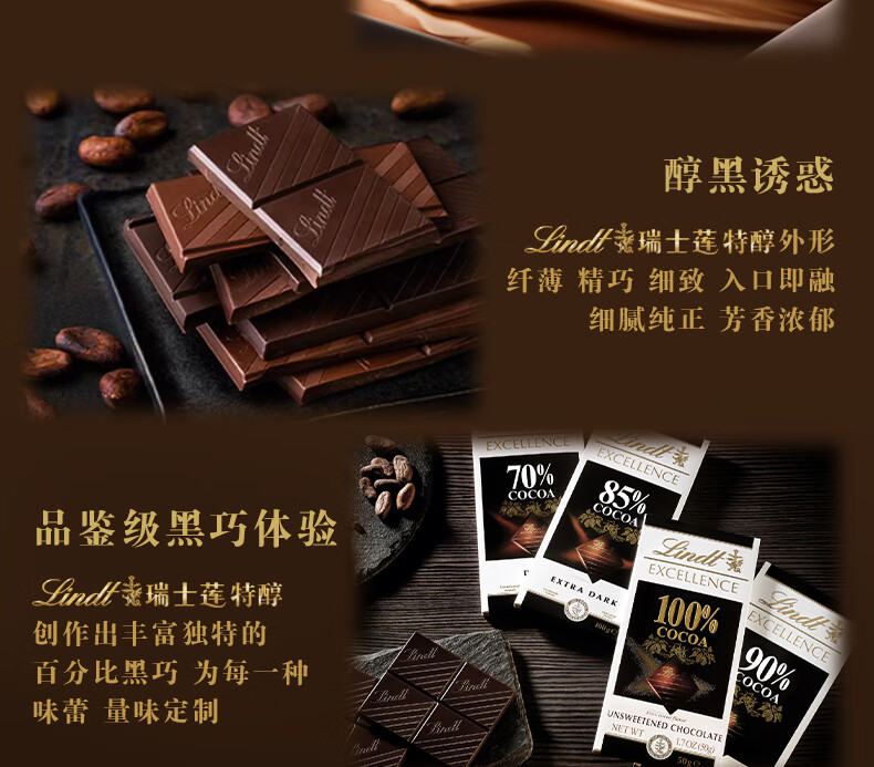 瑞士莲(Lindt)50%可可黑巧克力特醇排装100g进口零食生日伴手礼【临期清仓】