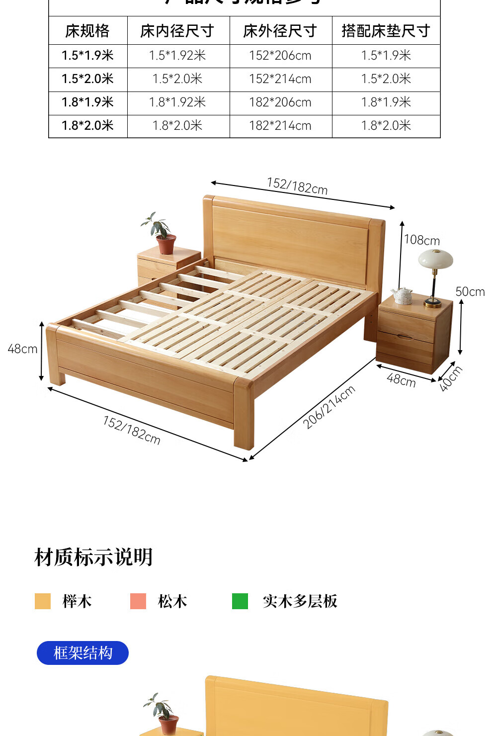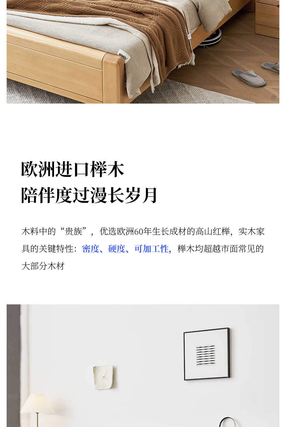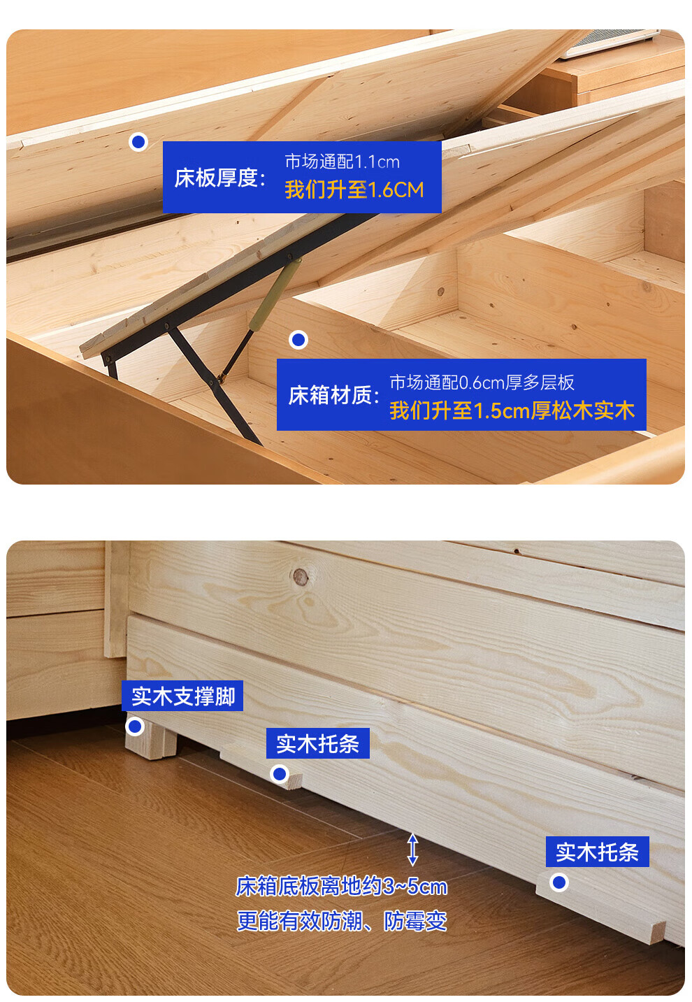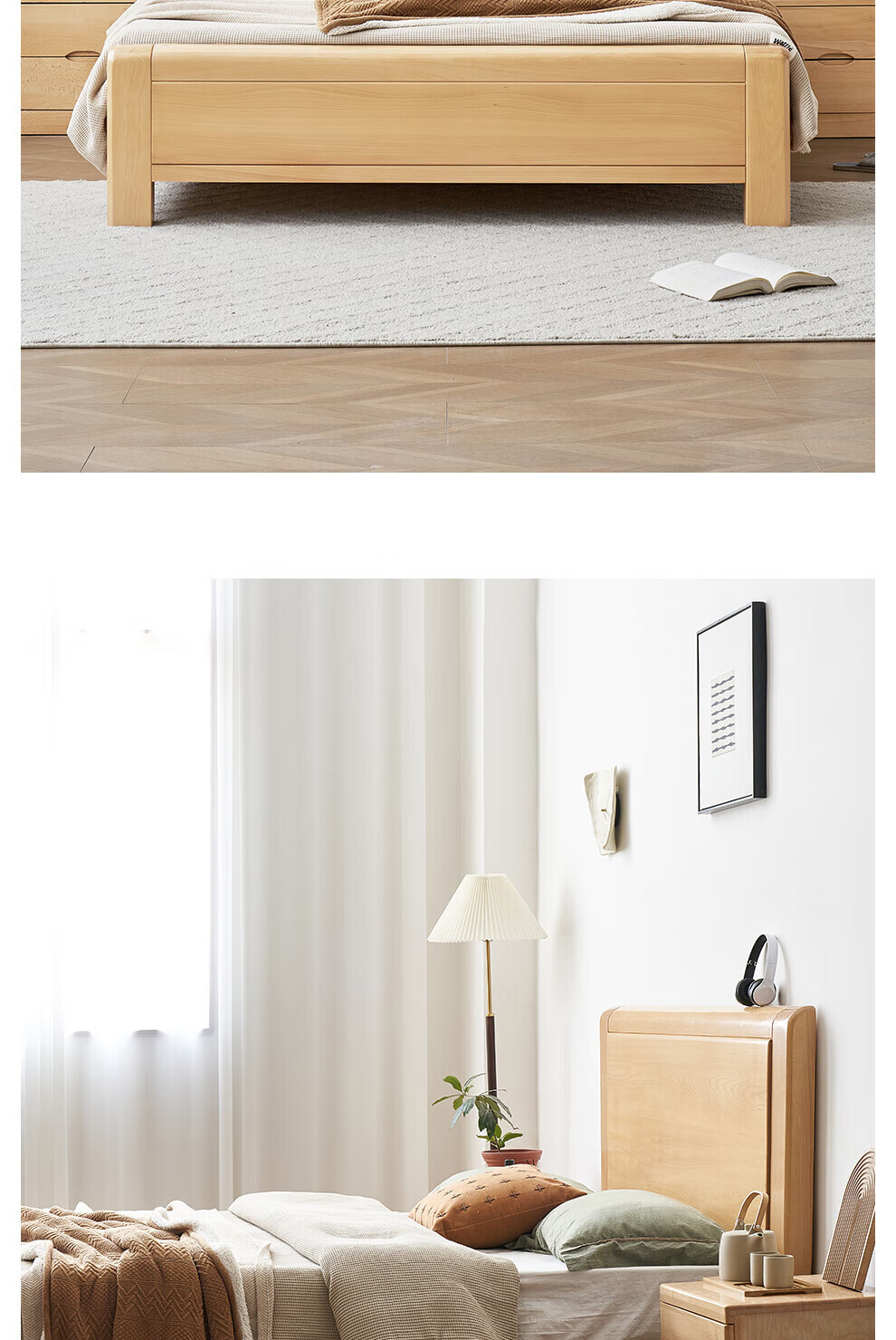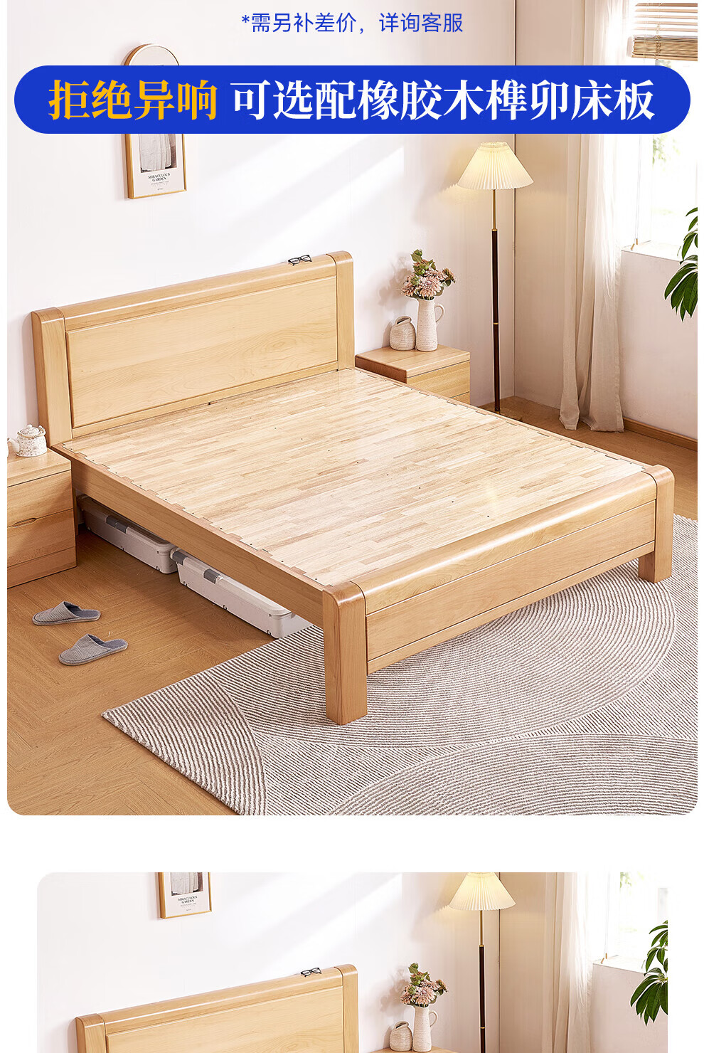 木创加厚款北欧简约风全实木床主卧室双人床榉木床婚床气压结构可储物 单床:包送货上楼和安装 1.5*2.0米 框架款+榉木床板