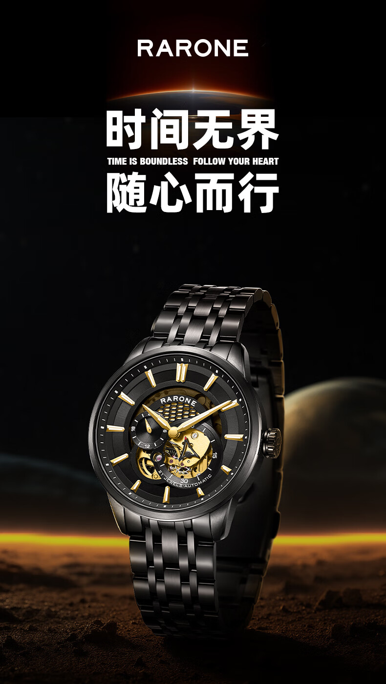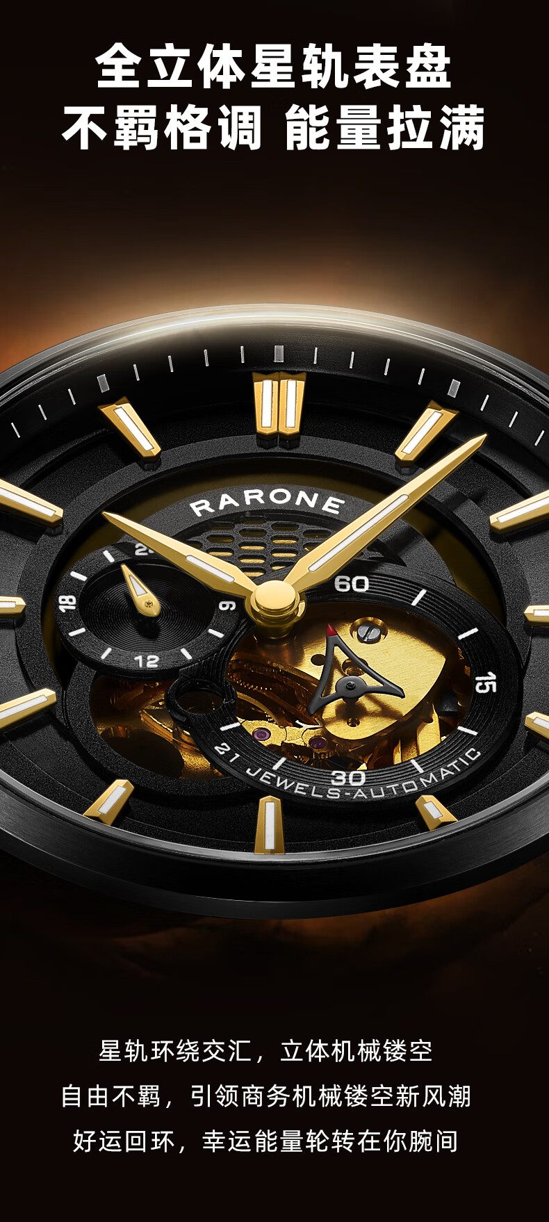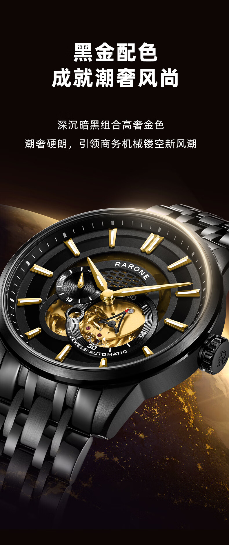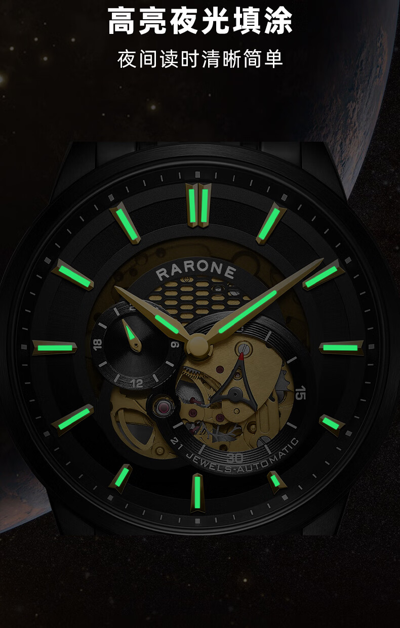 雷诺(RARONE)星际系列潮流镂空全自动男士机械表钢带腕表礼物