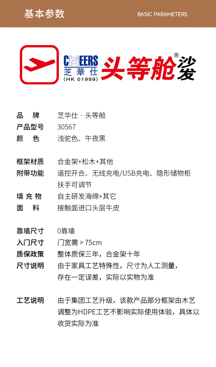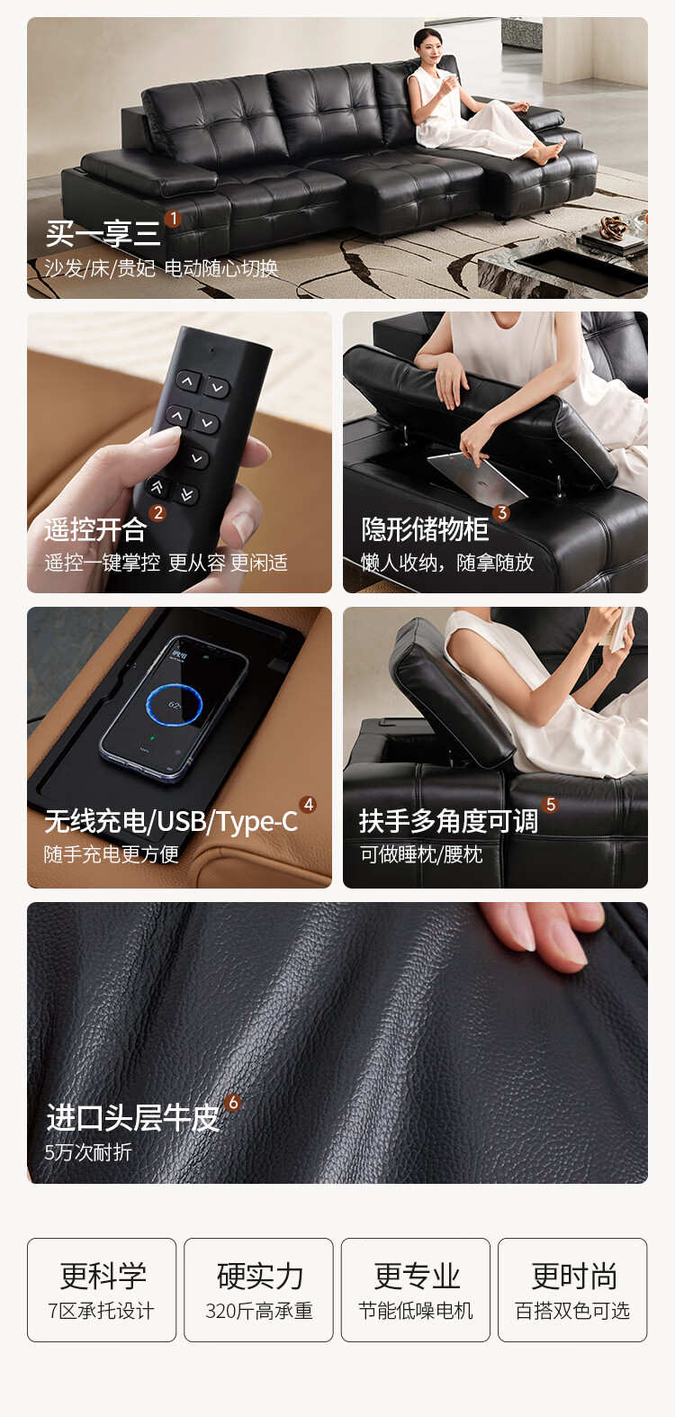 芝华仕(CHEERS)头等舱智能意式极简零靠墙真皮电动功能劳伦斯沙发床30567黑三