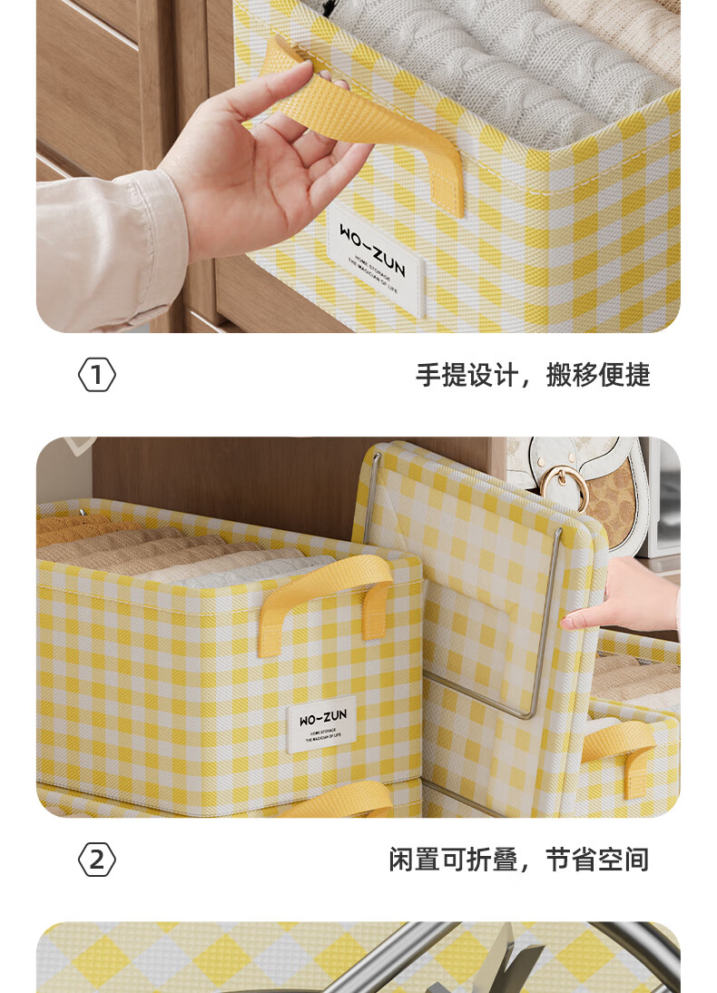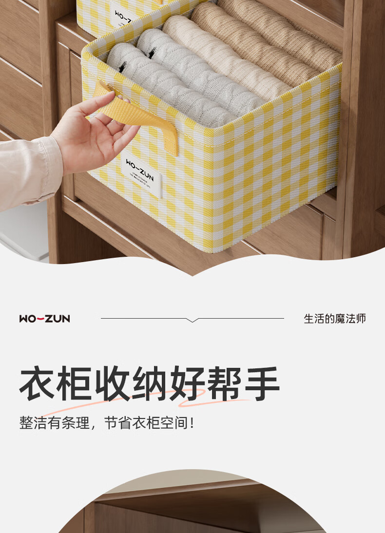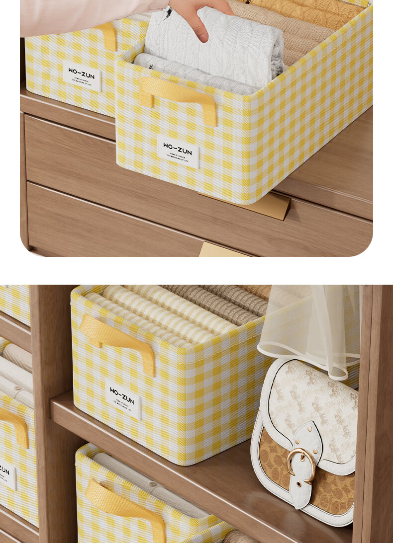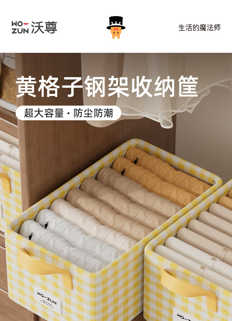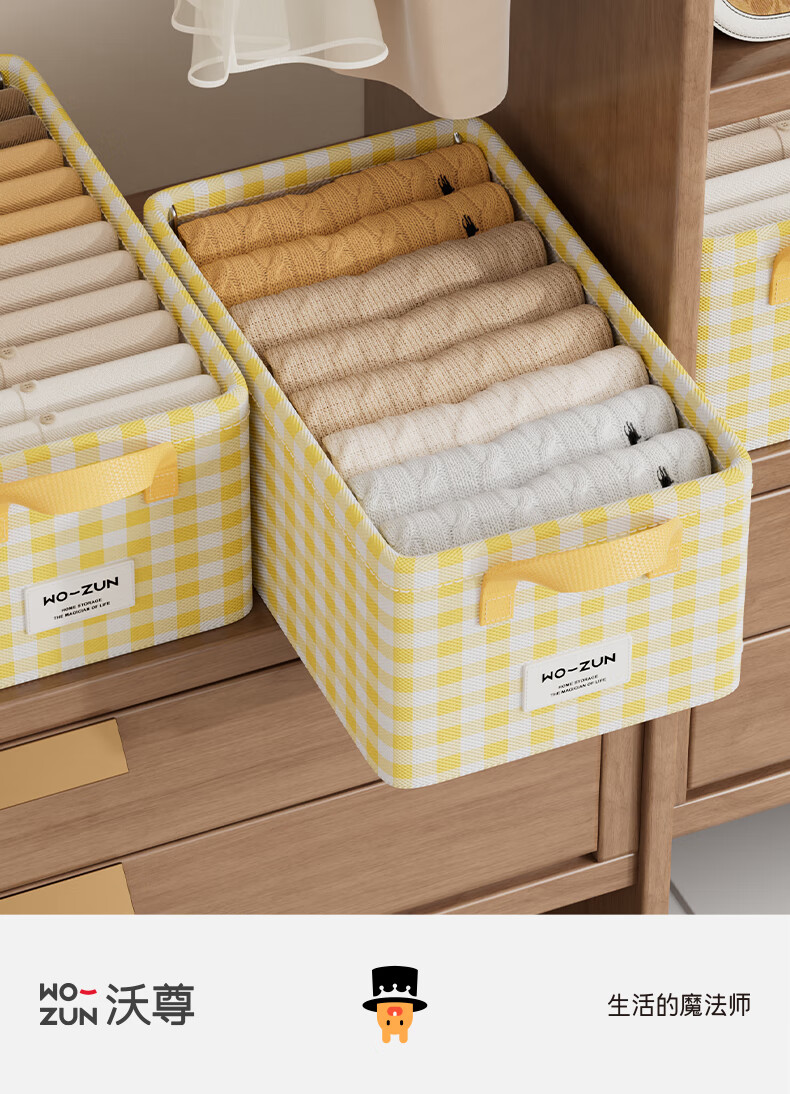 沃尊衣柜衣服收纳盒分层裤子收纳神器超大容量衣物收纳筐四件套整理盒 黄色格子-13L【实芯钢架】30*24*17cm