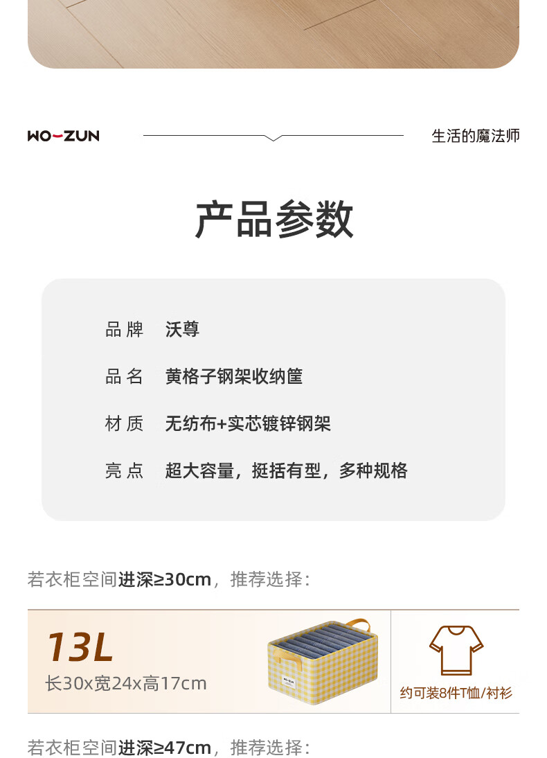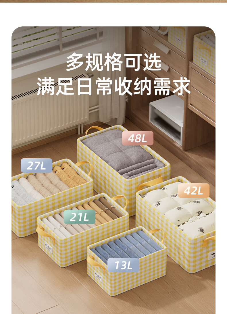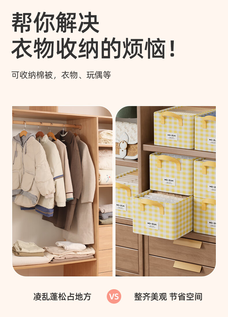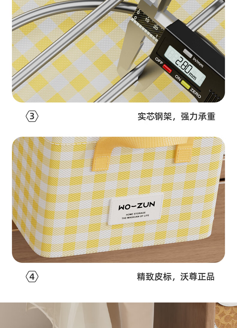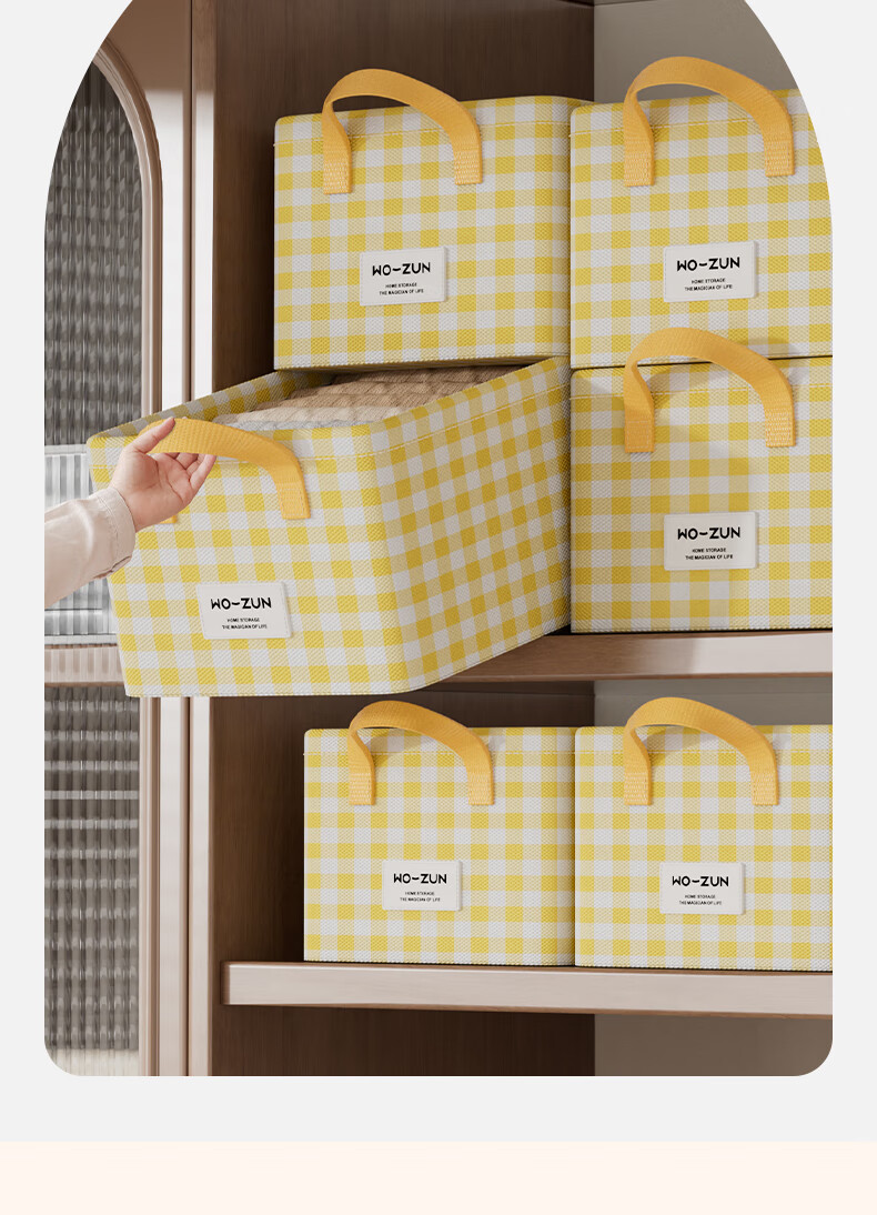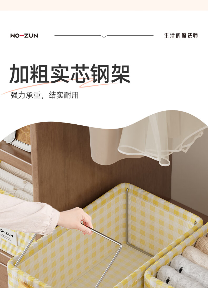 沃尊衣柜衣服收纳盒分层裤子收纳神器超大容量衣物收纳筐四件套整理盒 黄色格子-13L【实芯钢架】30*24*17cm