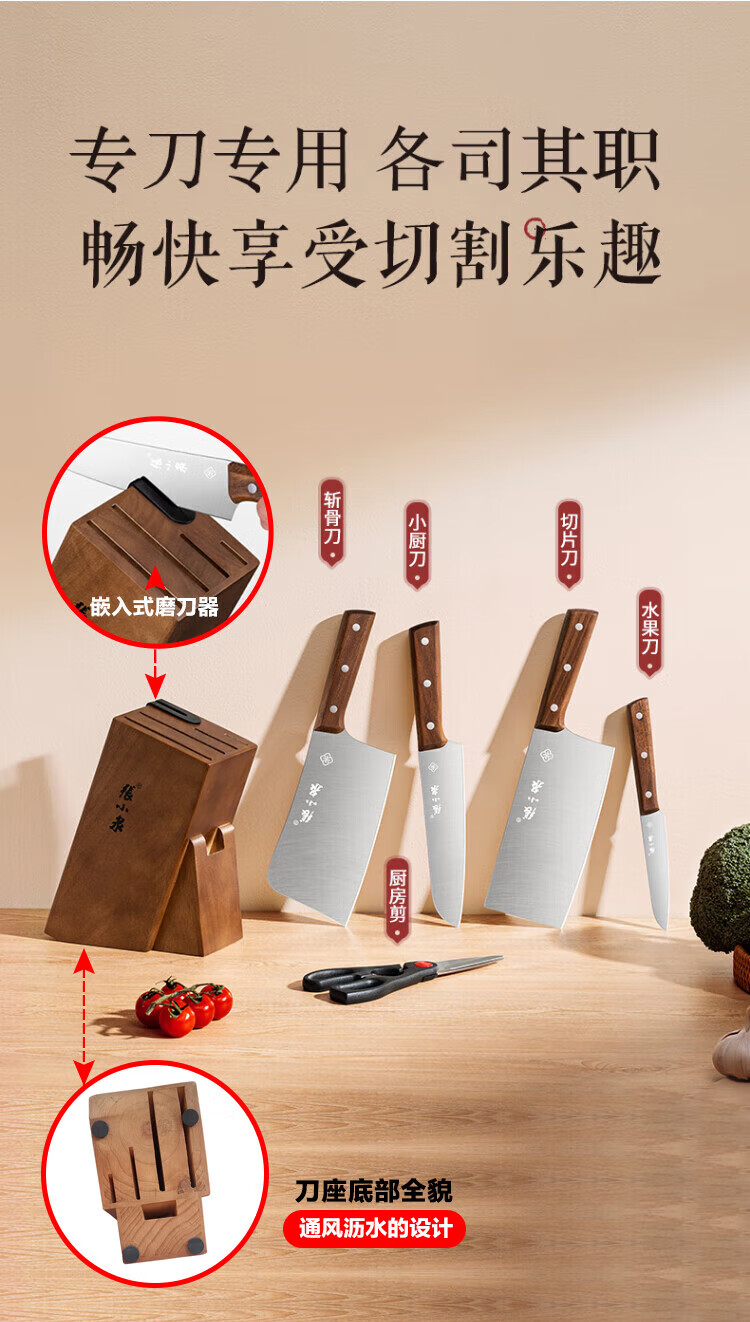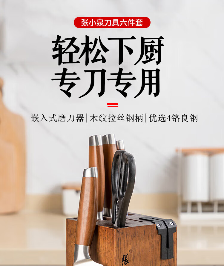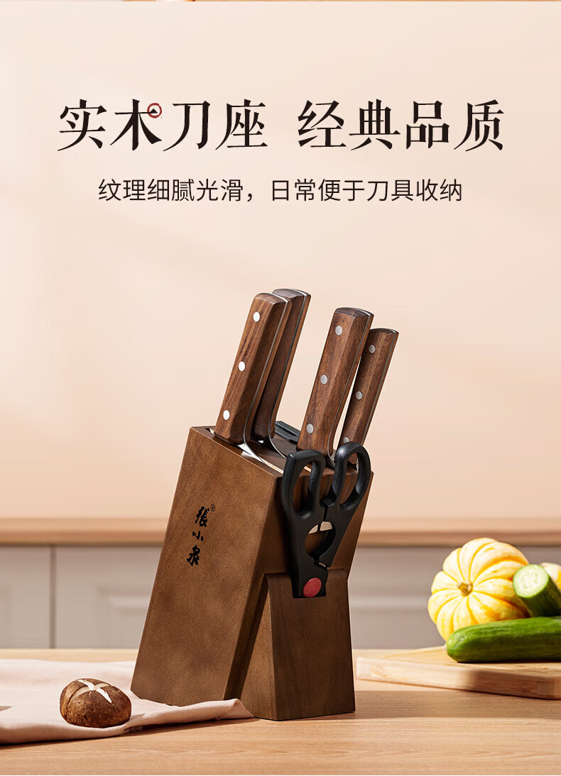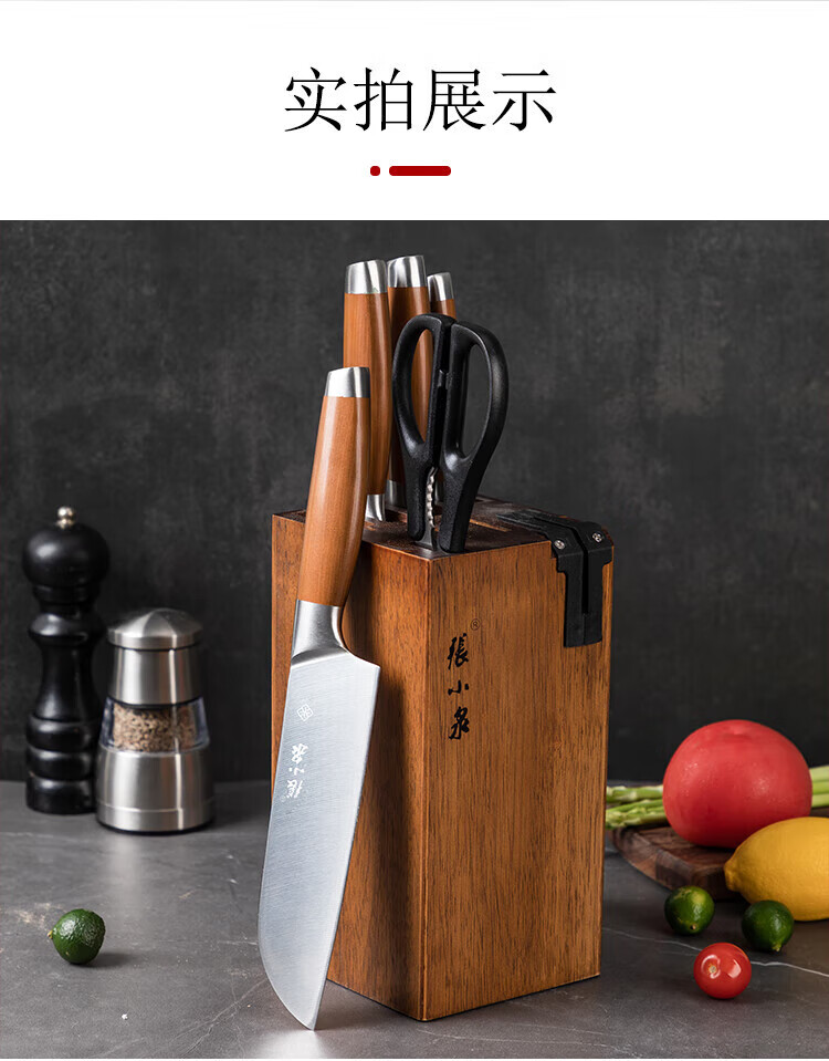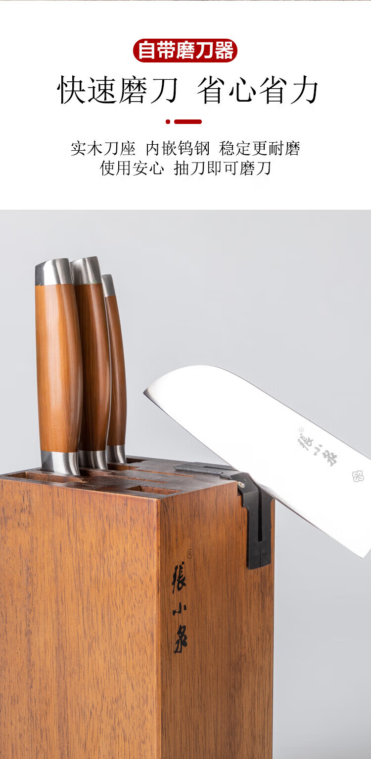张小泉刀具全套菜刀套装家用正宗厨房厨具一整套菜板一体二合一切菜砍骨 正品带磨刀器实木刀座刀架 名刃六件套