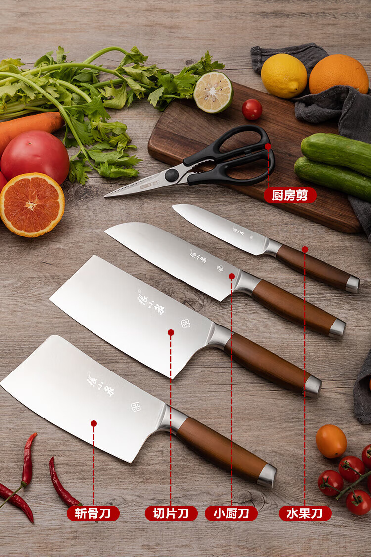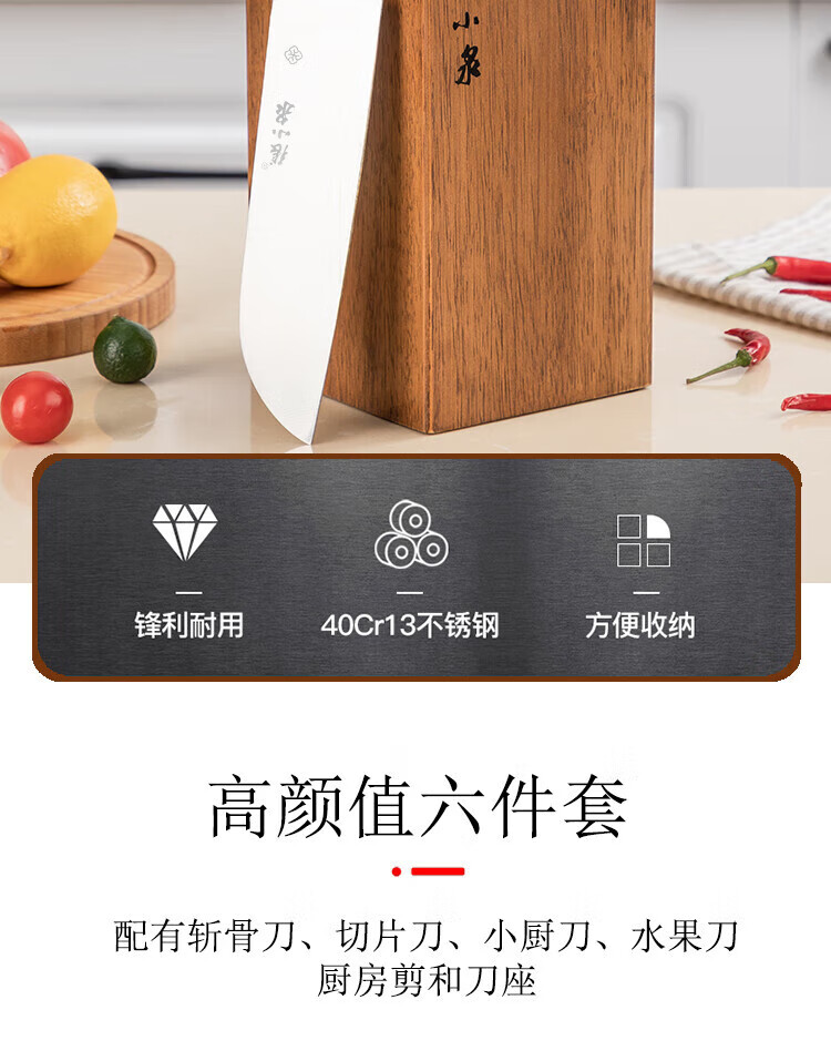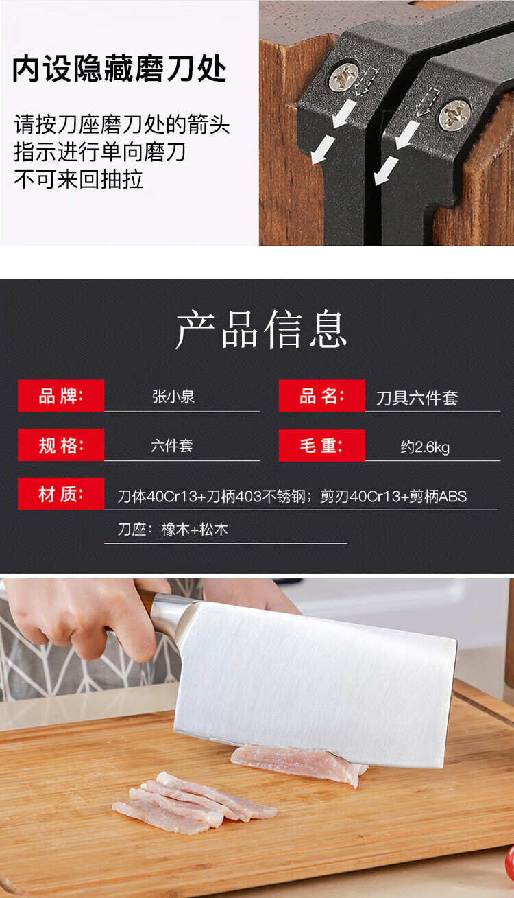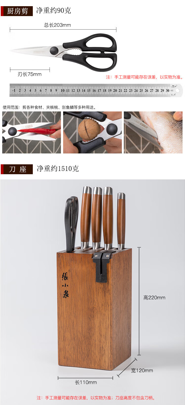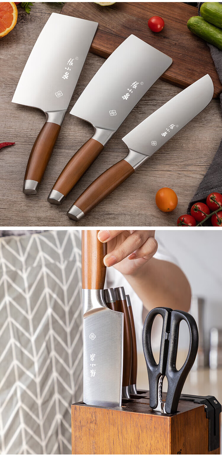 张小泉刀具全套菜刀套装家用正宗厨房厨具一整套菜板一体二合一切菜砍骨 正品带磨刀器实木刀座刀架 名刃六件套