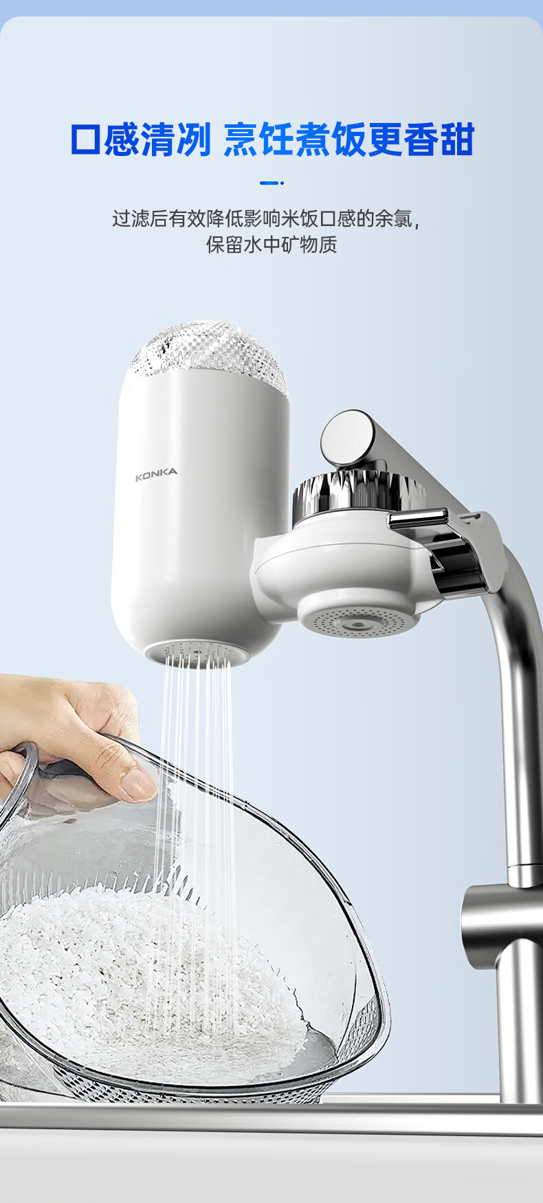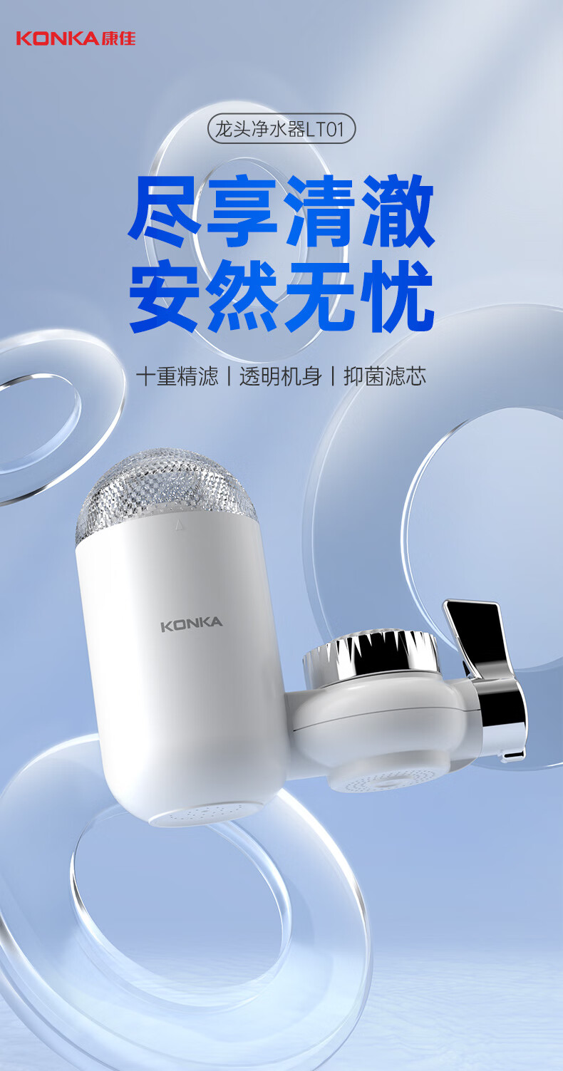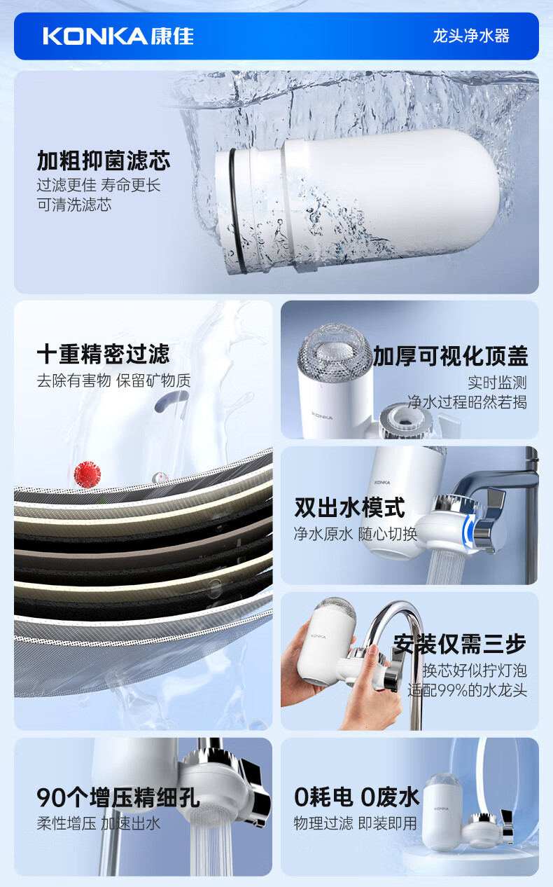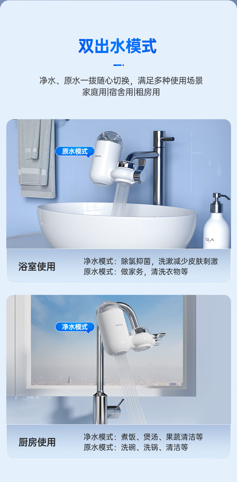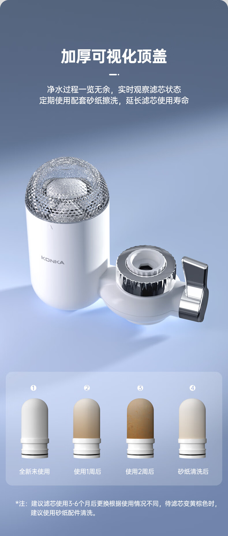 康佳(KONKA)净水器家用水龙头过滤器自来水滤水器台式净水机前置过滤厨房卫生间通用阻水垢除余氯双出水LT01 1机2芯【可清洗陶瓷滤芯】