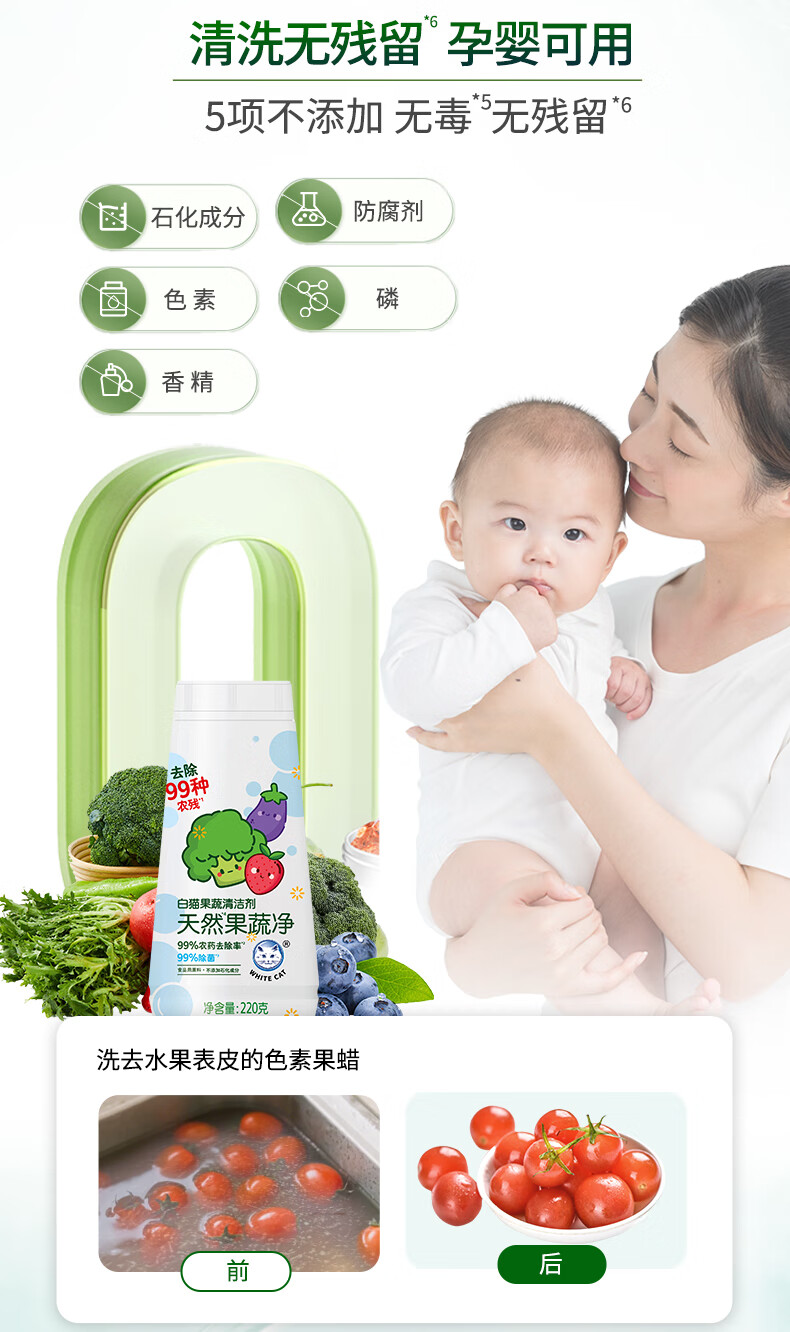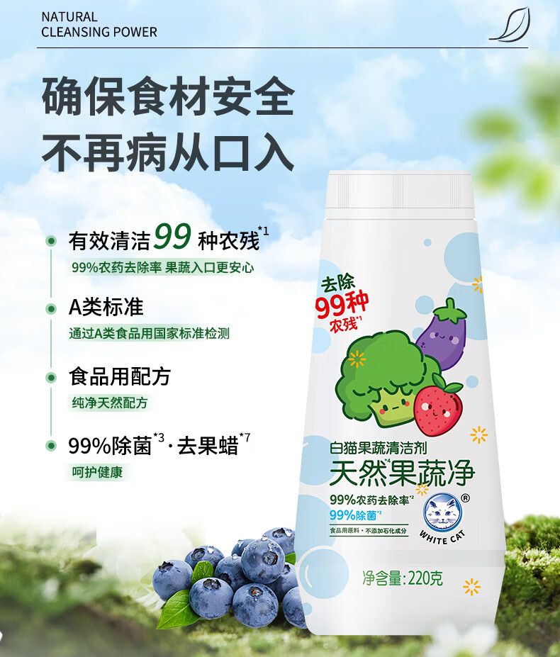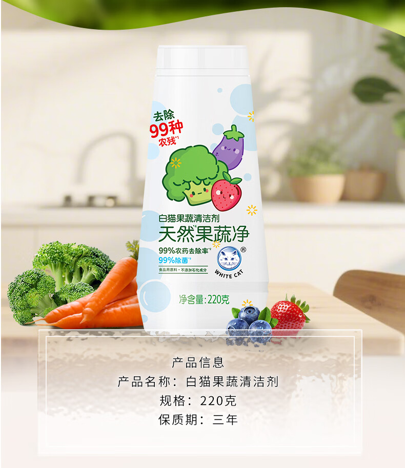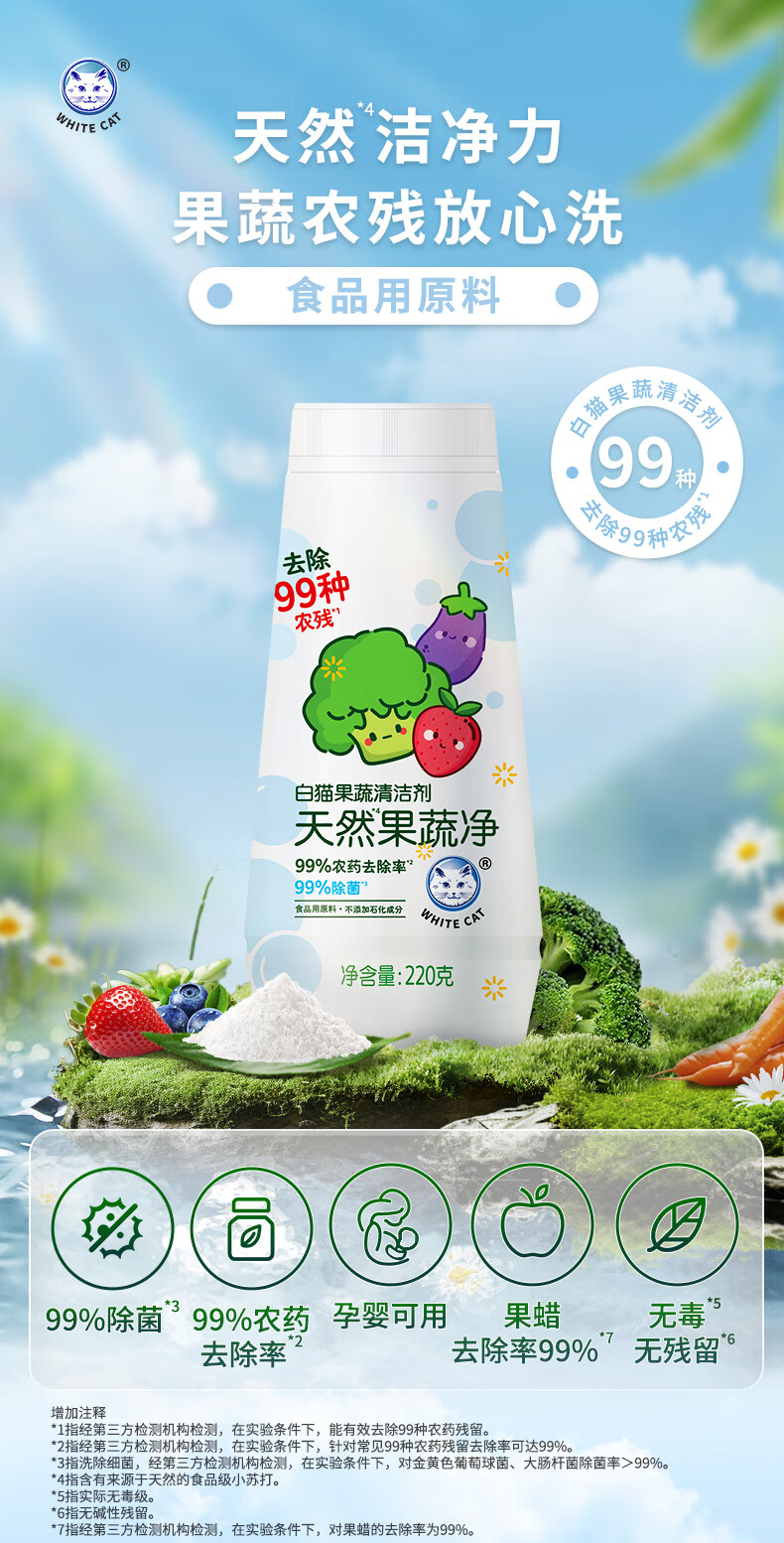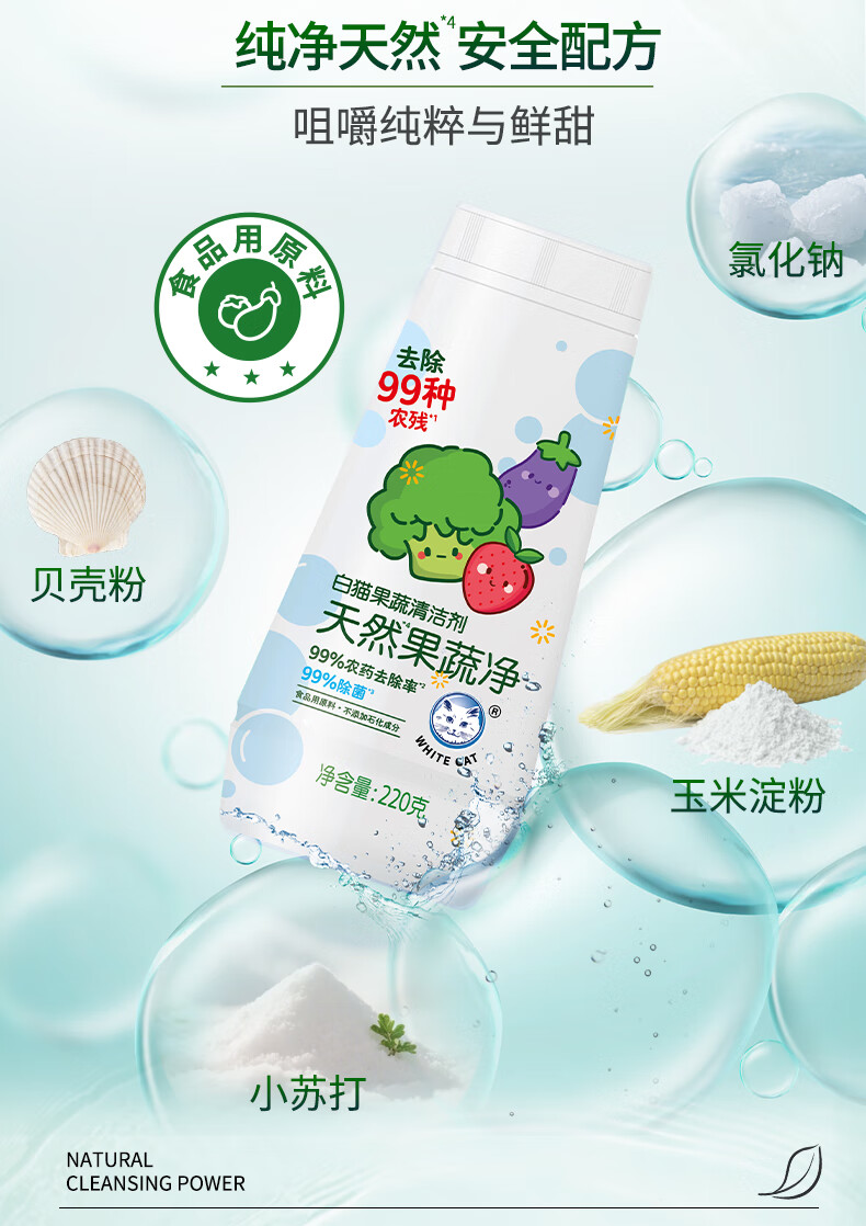 白猫果蔬清洁剂除菌A类标准无毒*食品用洗水果去农残果蜡除菌孕婴可用 3瓶-660g