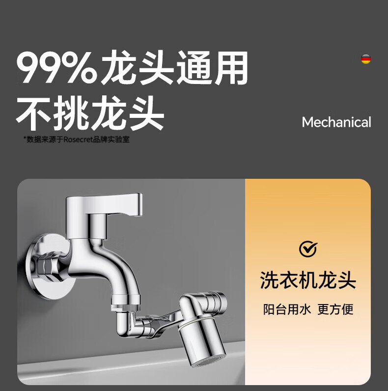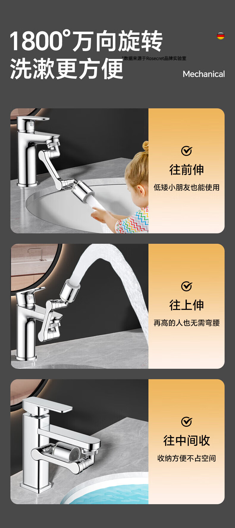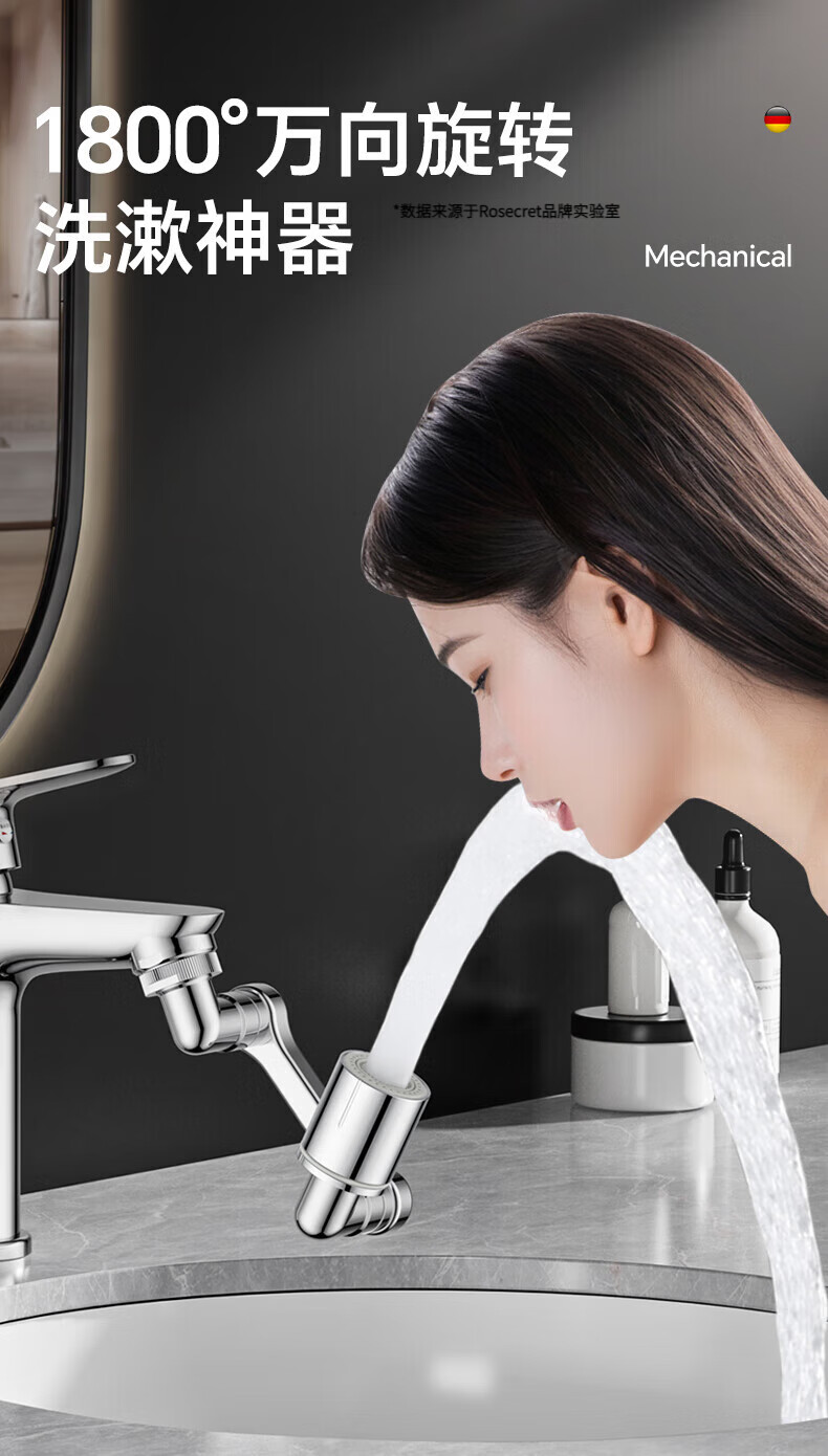 Rosecret【德国】面盆水龙头延伸器多功能万向旋转机械臂增压防溅水起泡器 两档水龙头转接头【亮银色】全铜水嘴 加厚加重丨防锈防漏丨通用安装
