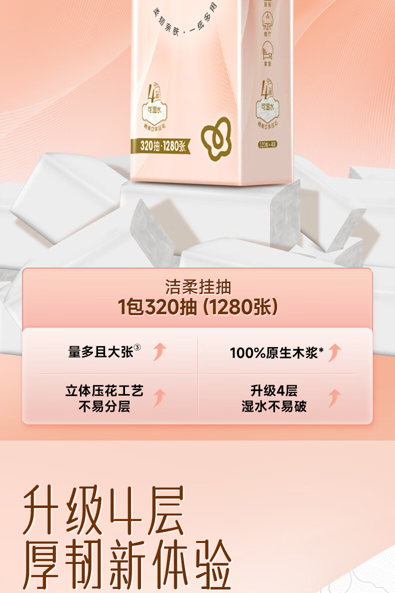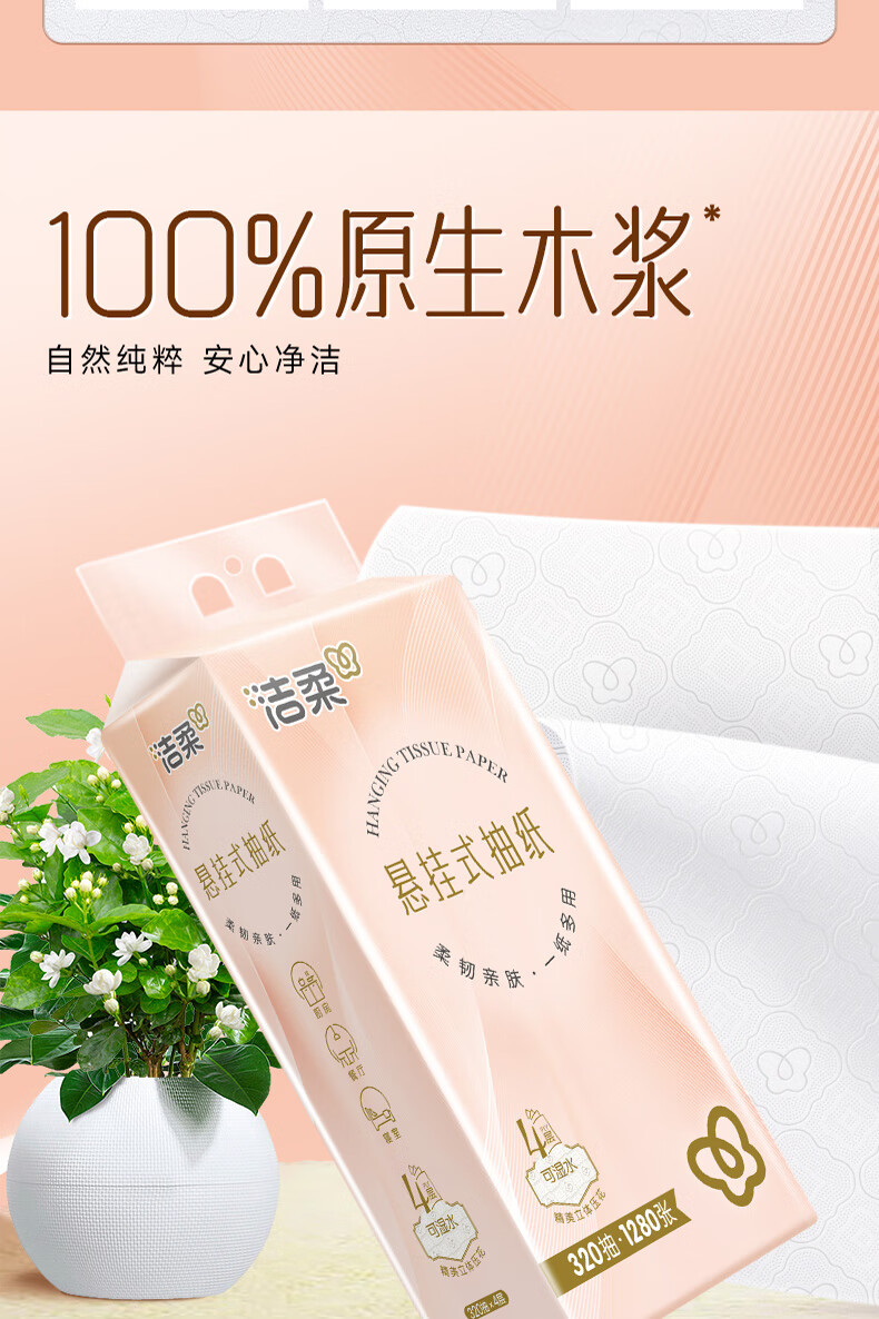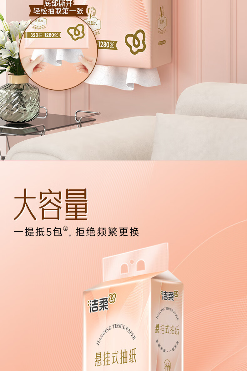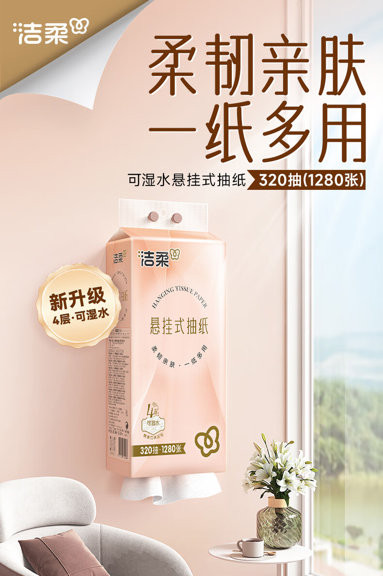 洁柔挂抽悬挂式抽纸320抽大包家用整箱实惠装卫生纸餐巾纸厕纸巾擦手 4层320抽*4提整箱