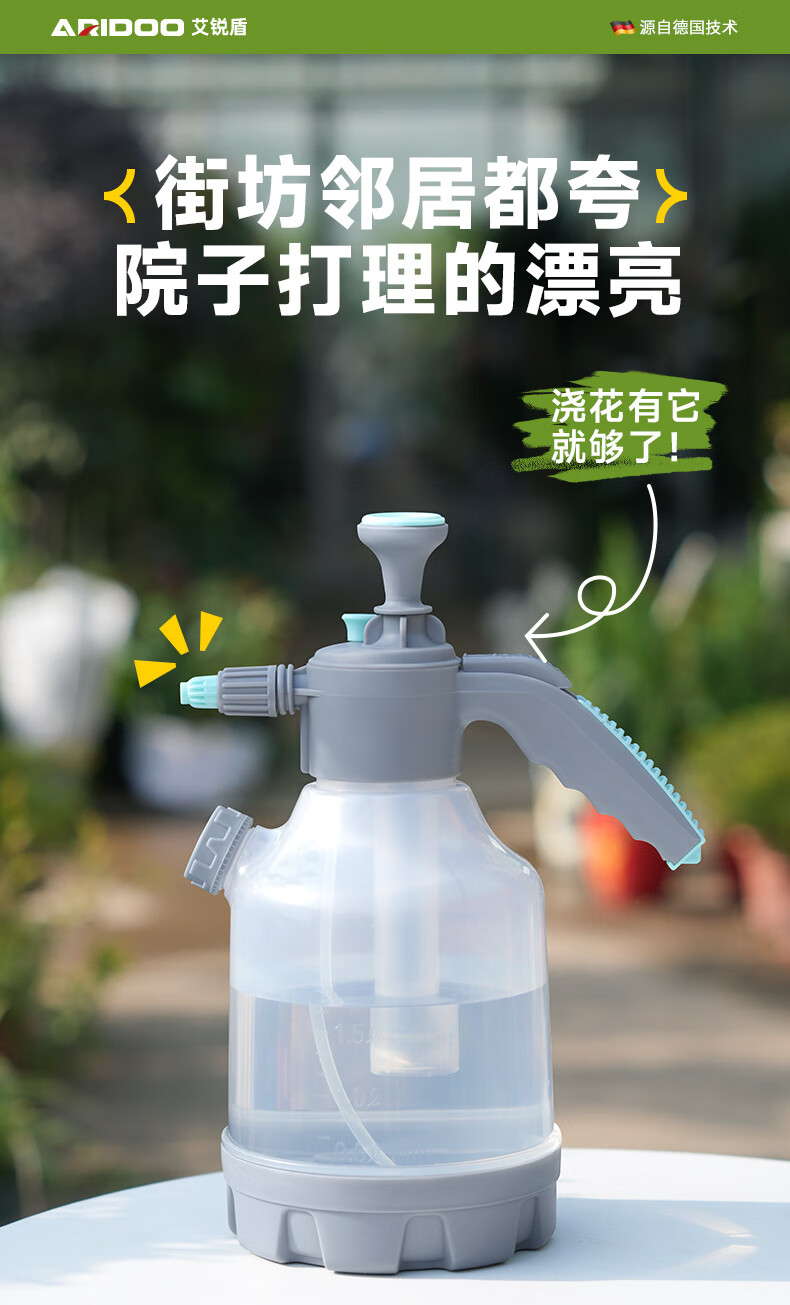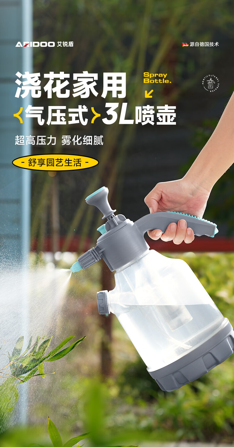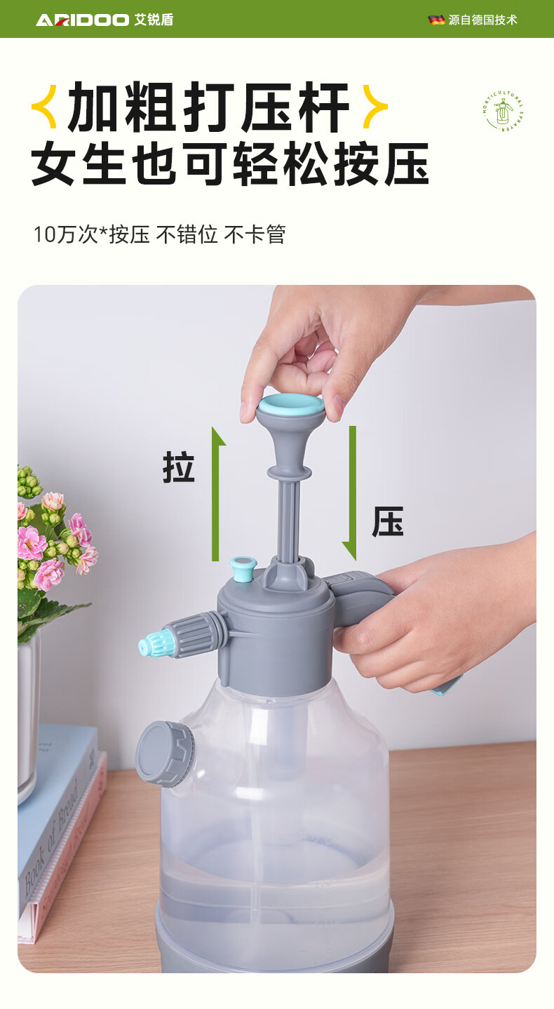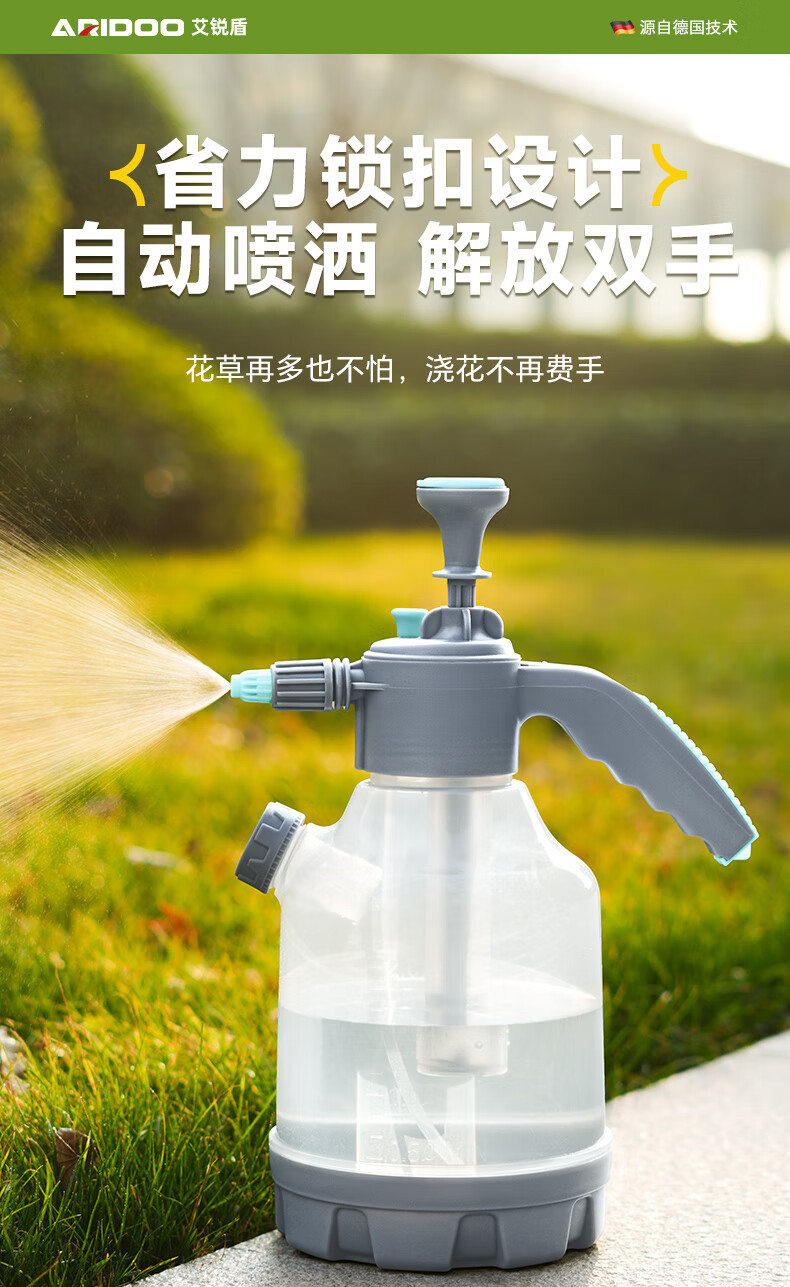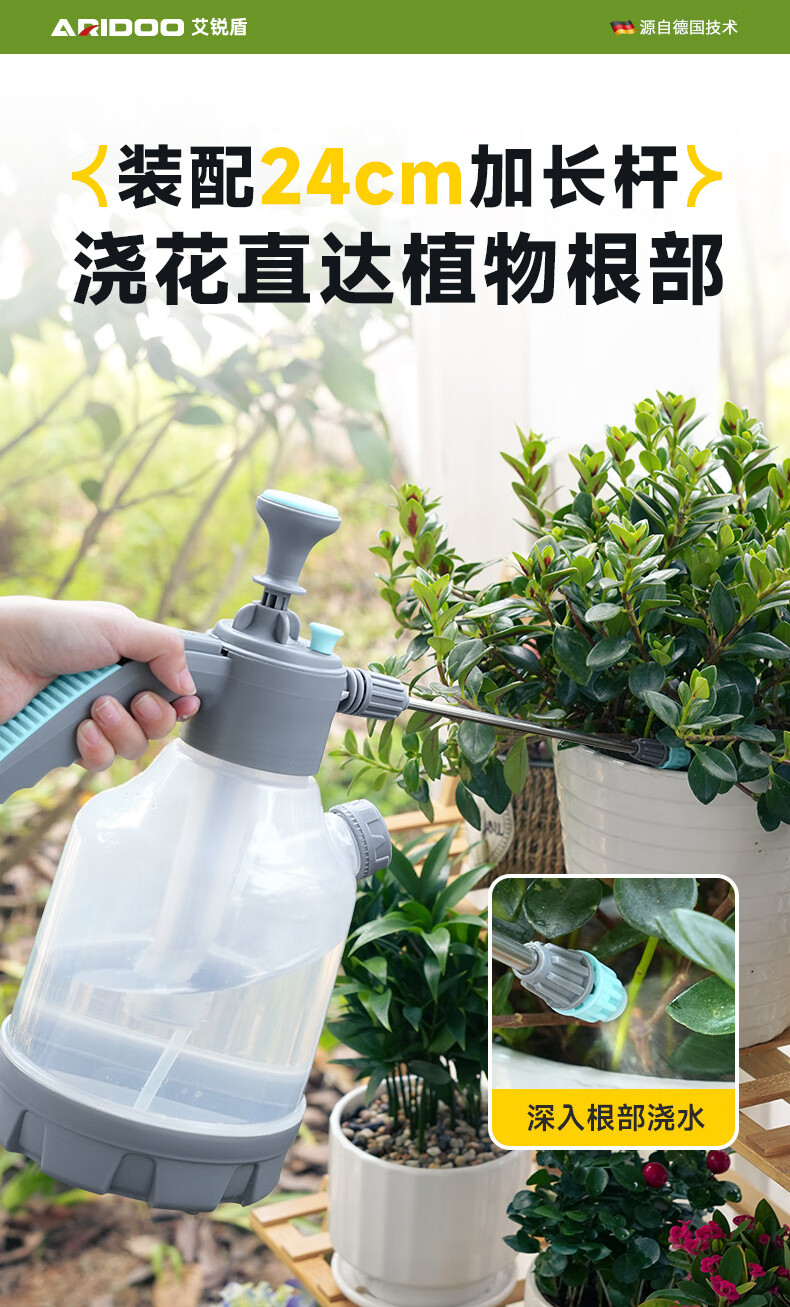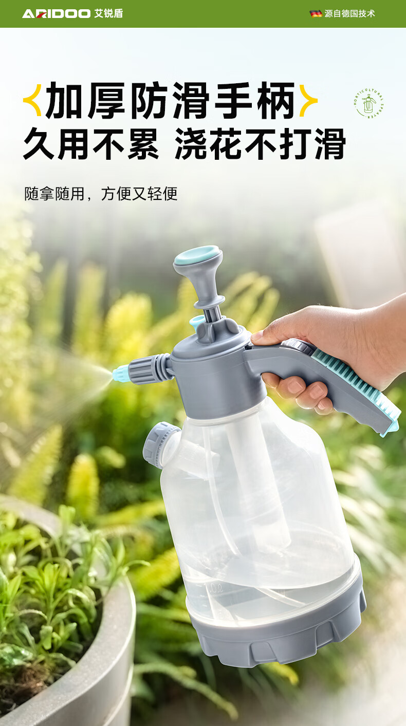 艾锐盾德国喷壶浇花气压式喷雾器养花洒水壶洗车消毒高压喷水壶 透明灰2L【加厚材质】
