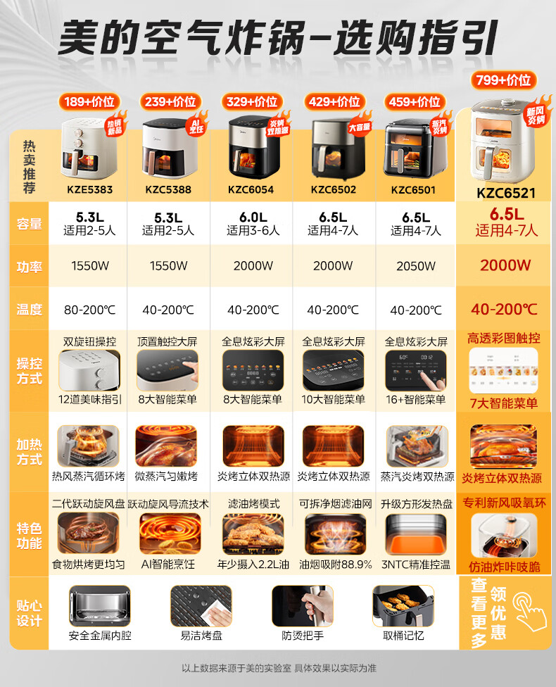 美的(Midea)免翻面空气炸锅炎烤双热源 可视大视窗 实用大容量6.5L 旋钮家用小家电 蒸烤一体金属内腔 KZE6559