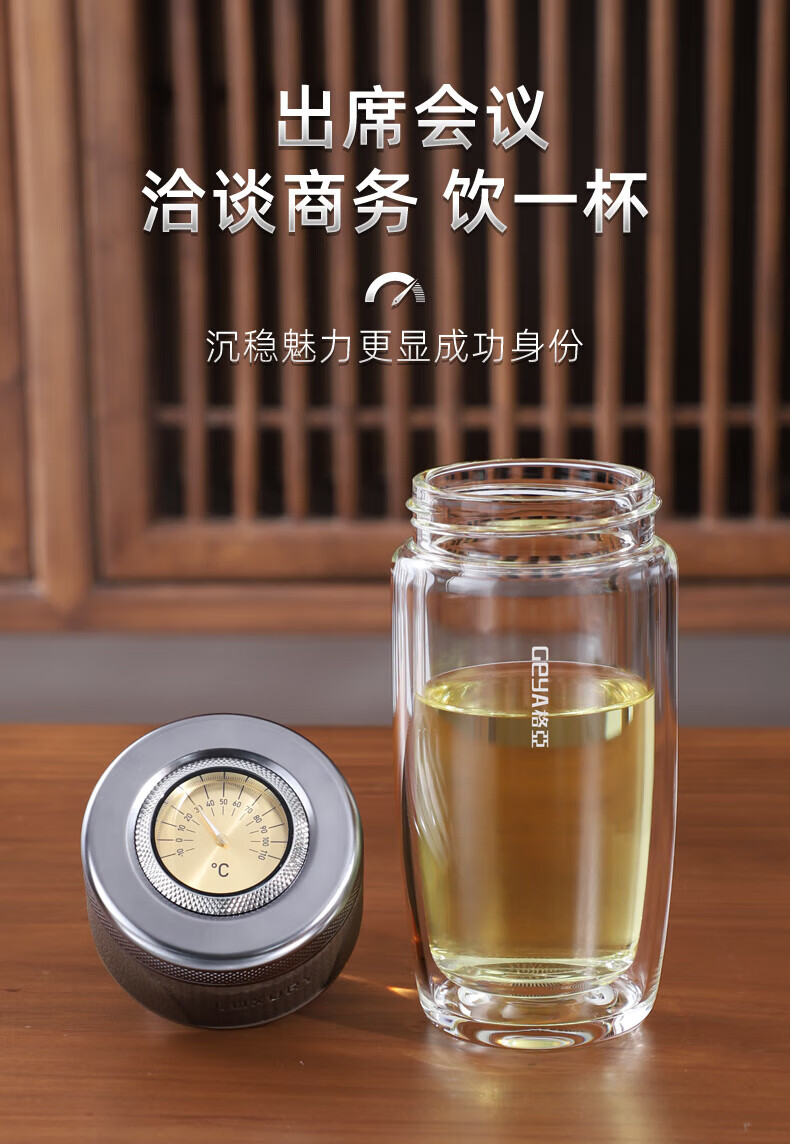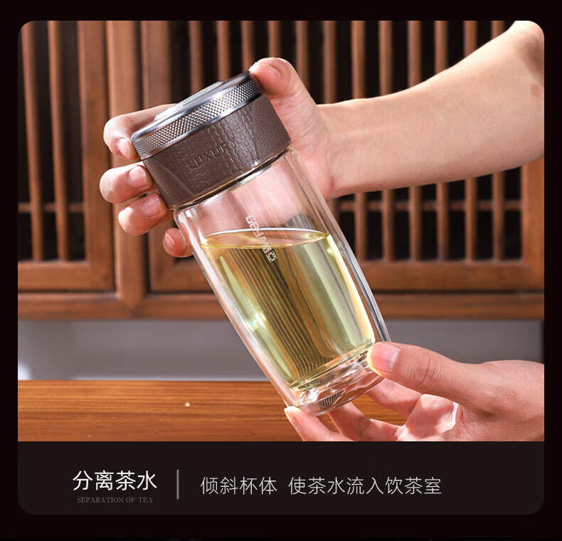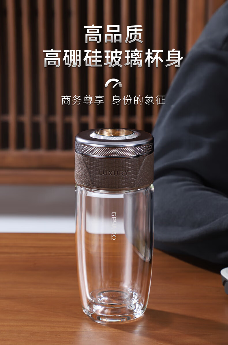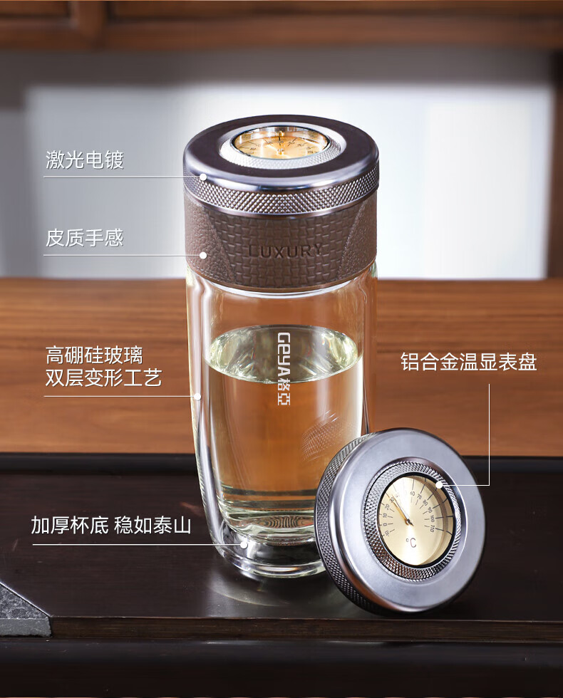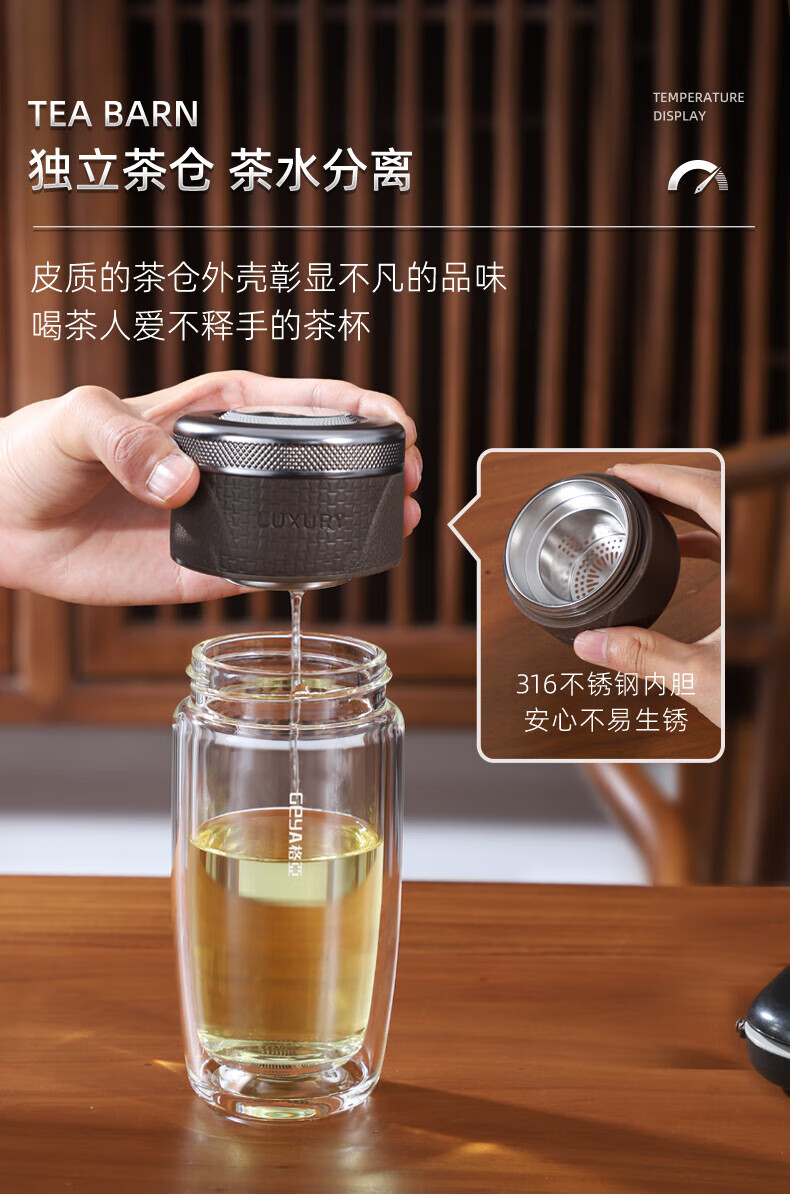 格亚(GEYA)茶水分离杯双层玻璃杯男士茶杯温显高档水杯分离茶水杯子泡茶杯 典雅咖350ml
