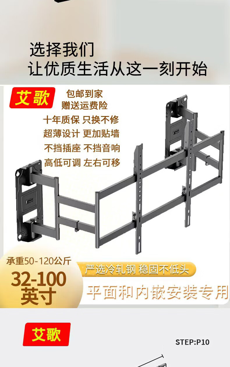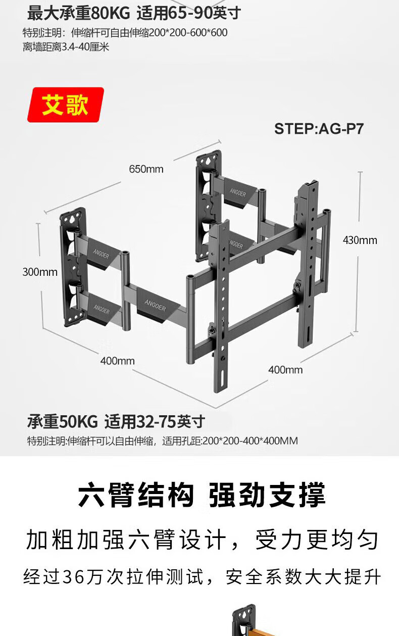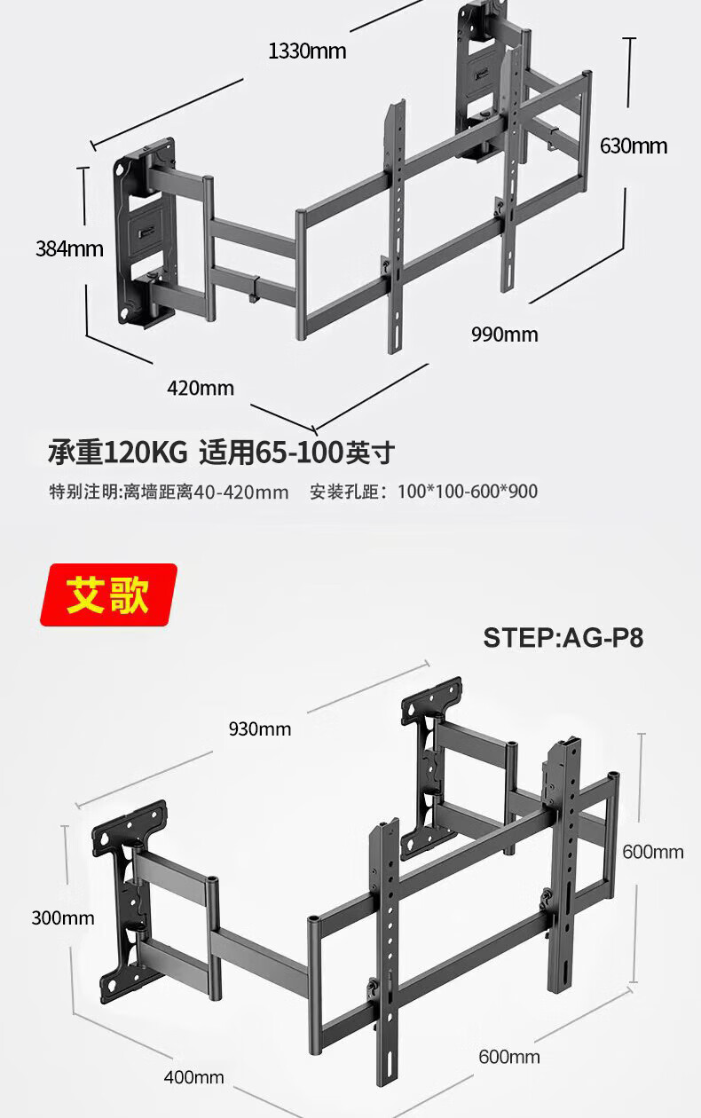 艾歌超薄大承重嵌入式电视伸缩挂架65-90英寸电视支架 适用小米海信TCL创维等 不挡插座 不挡音响AG-P8