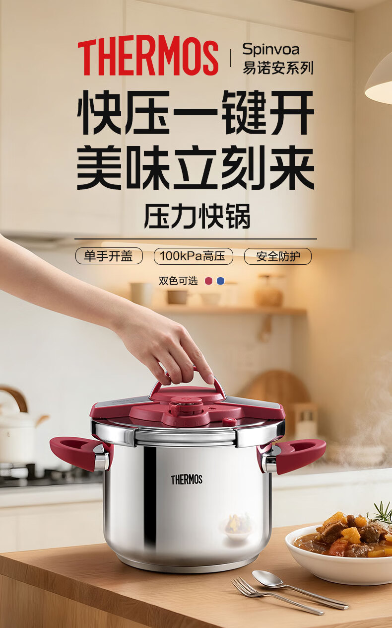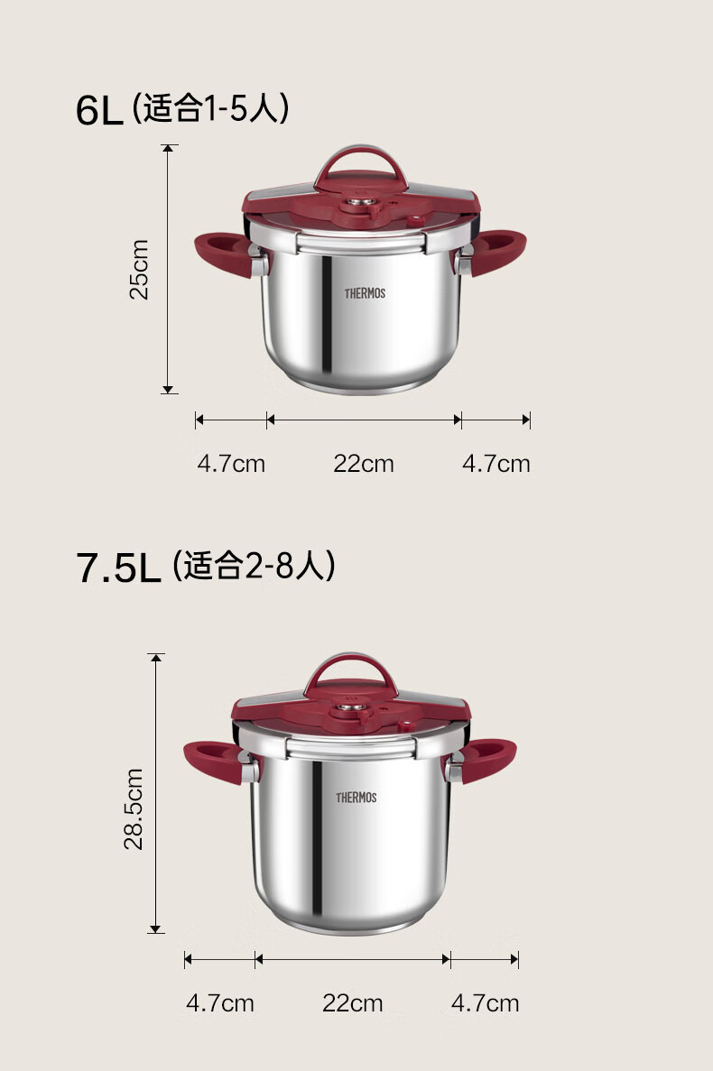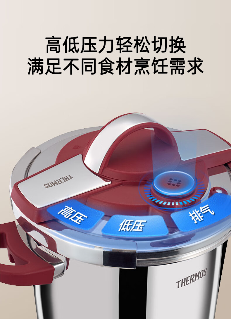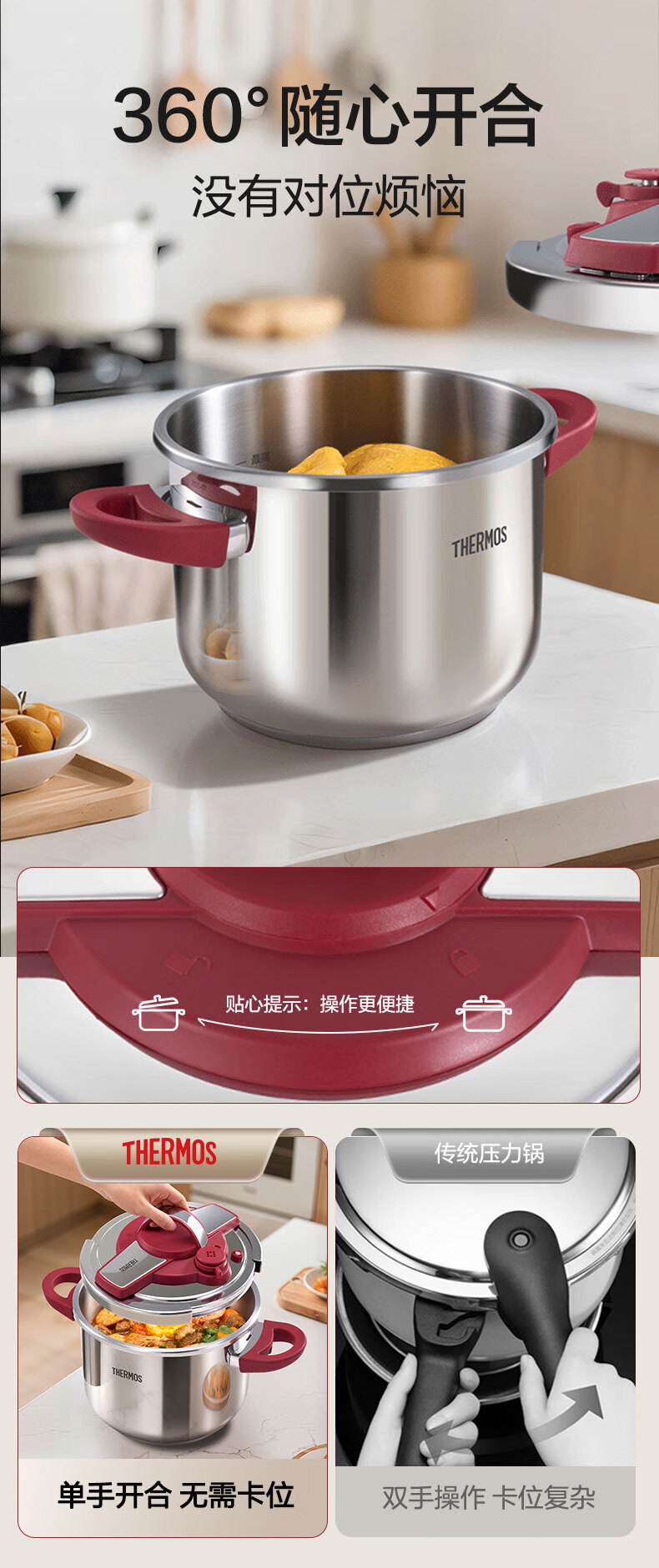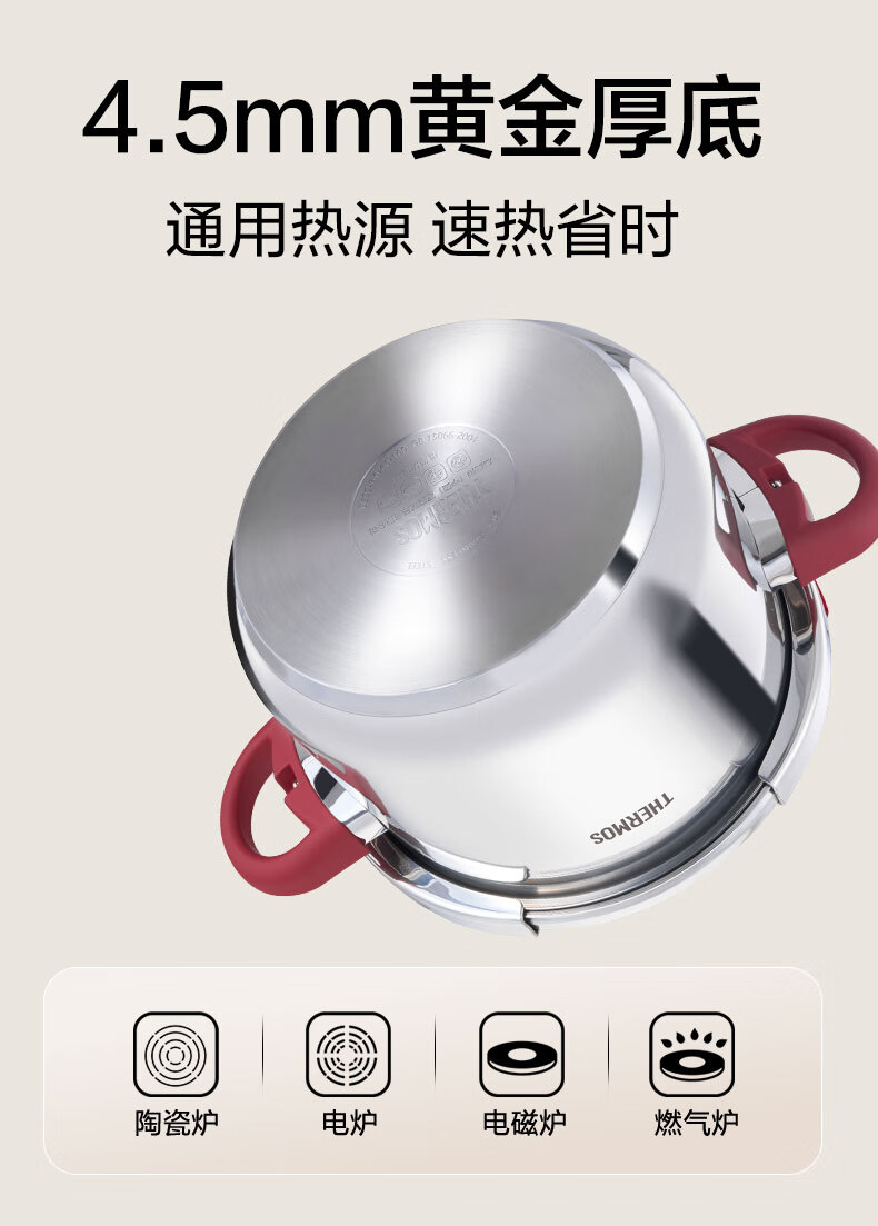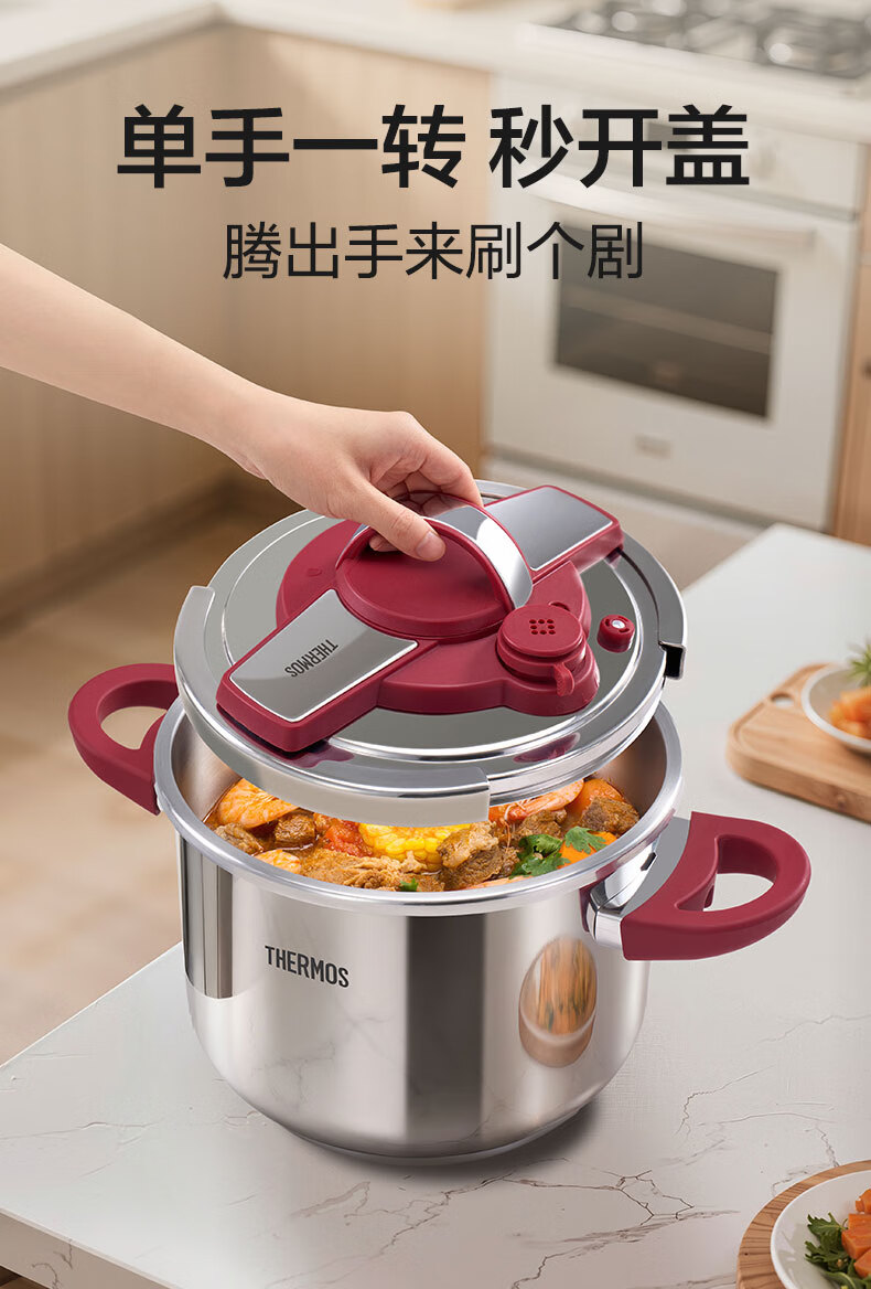 膳魔师高压锅100KPa不锈钢炖煮压力快锅单手开合大汤锅防爆电磁炉燃气灶 勃艮第红-1-5人 22cm 6L