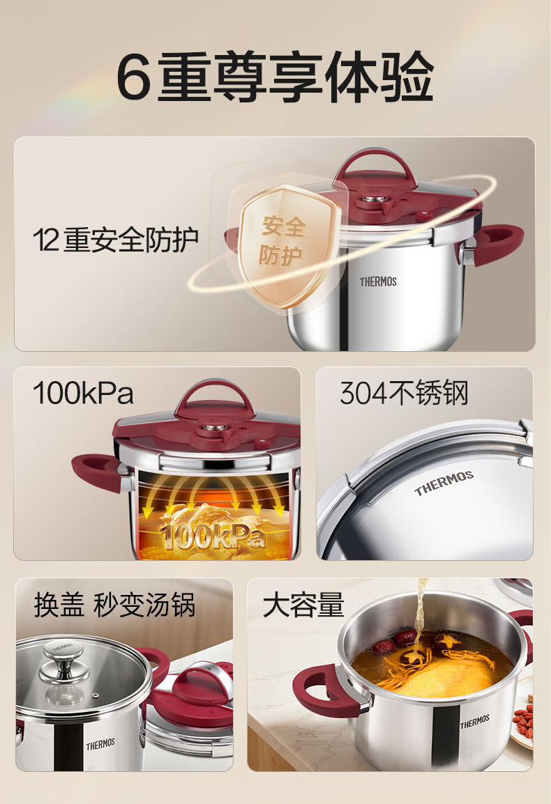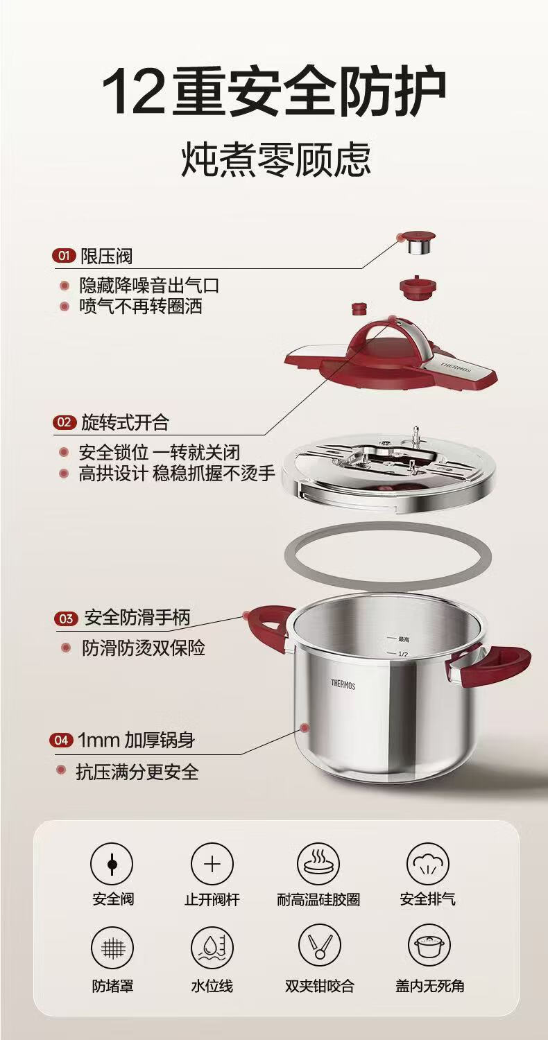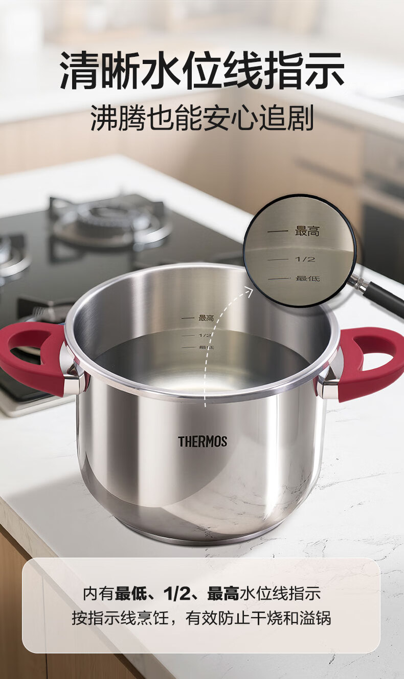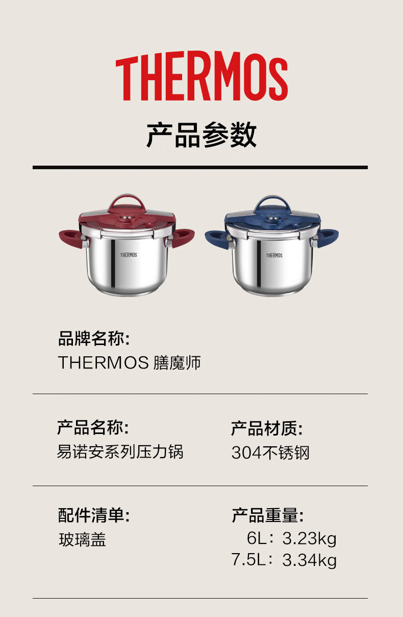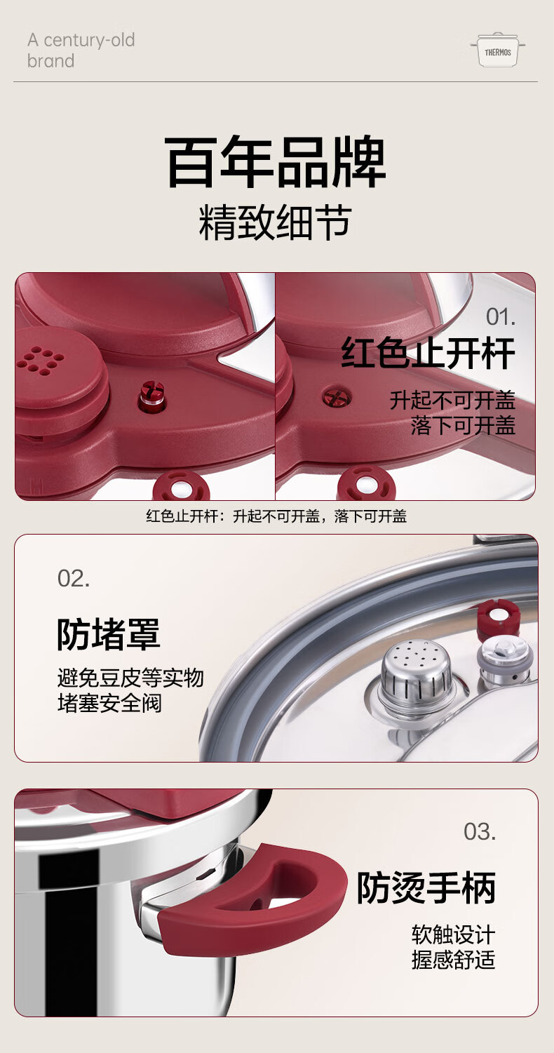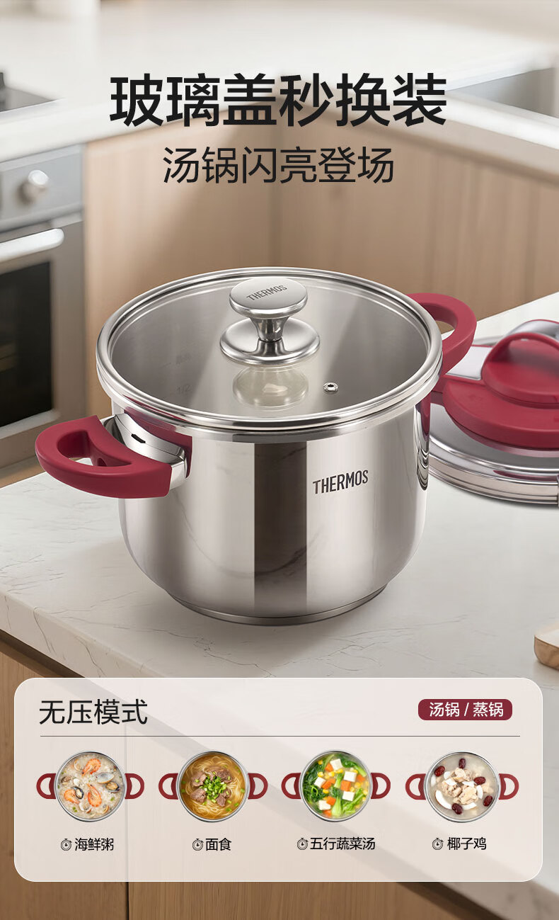 膳魔师高压锅100KPa不锈钢炖煮压力快锅单手开合大汤锅防爆电磁炉燃气灶 勃艮第红-1-5人 22cm 6L