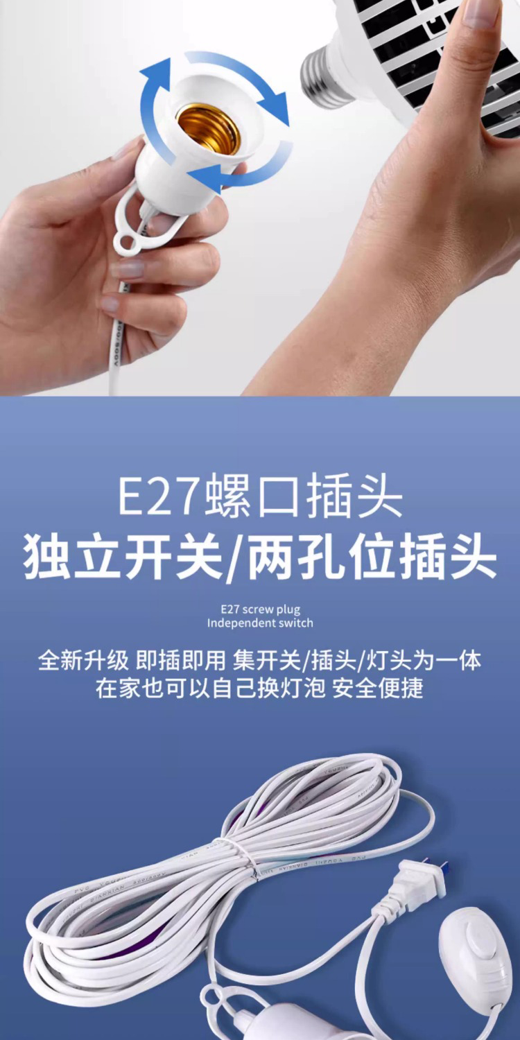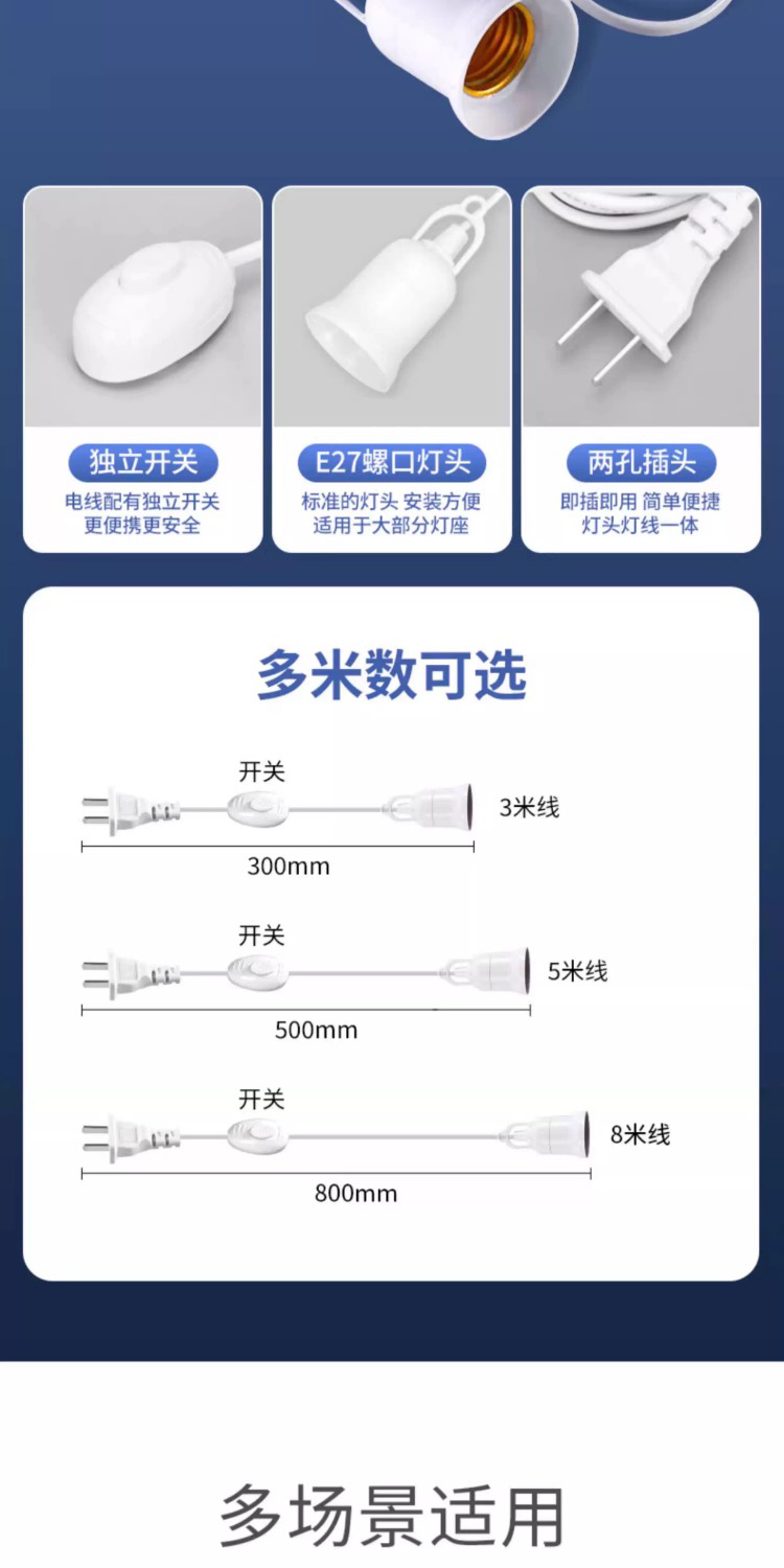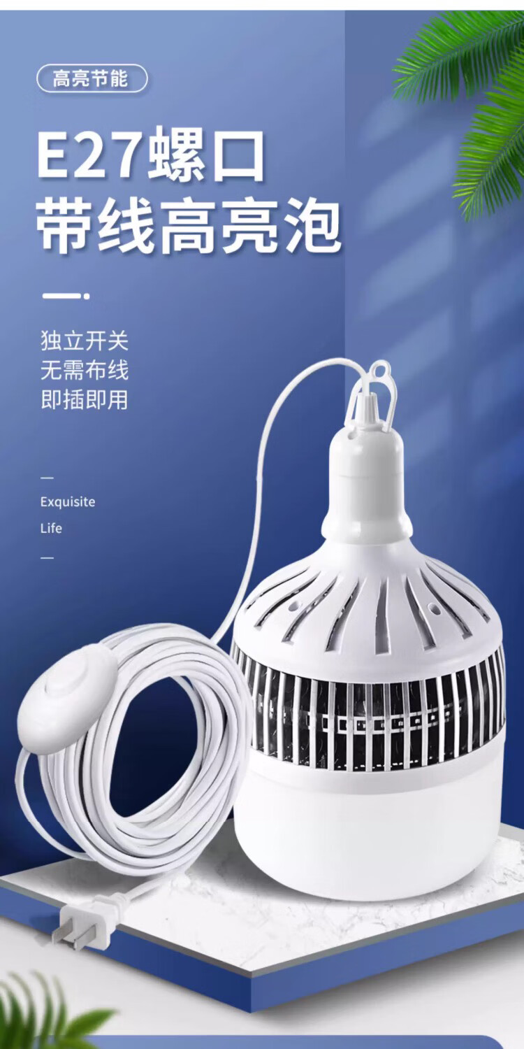 振牛家用led带线灯泡e27螺口插电式节能超亮户外照明灯插头插座带开关 200W大功率灯泡+8m线 E27螺口+送挂钩