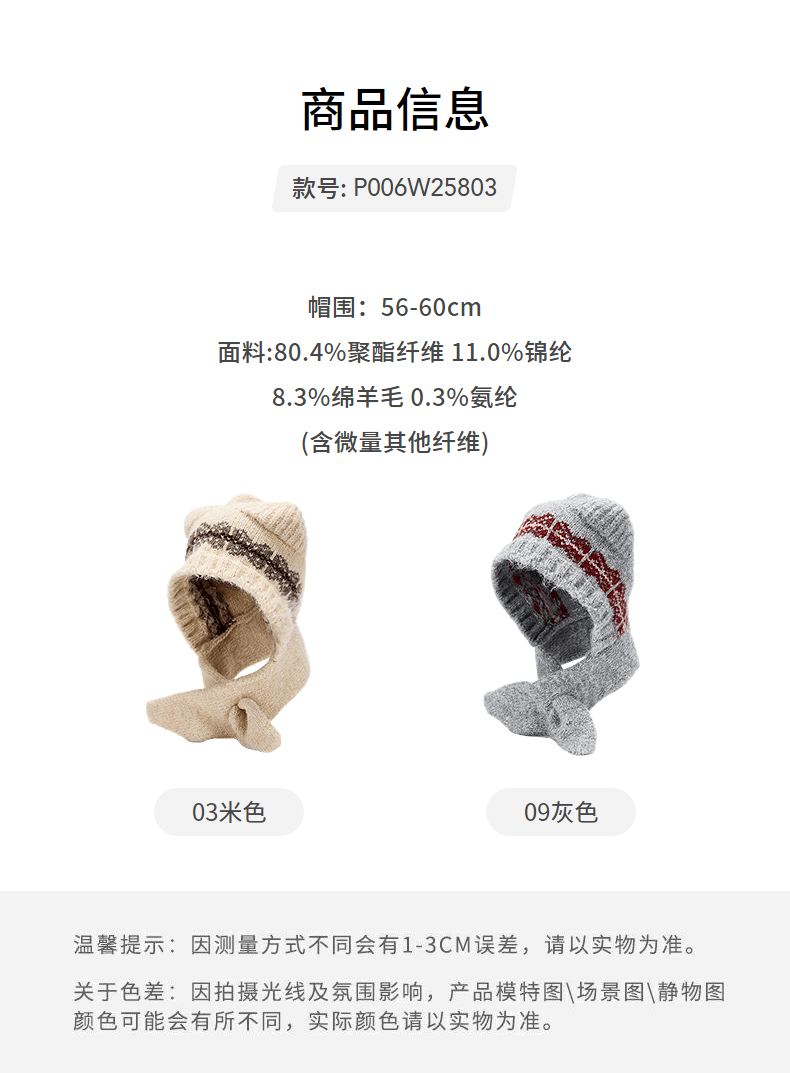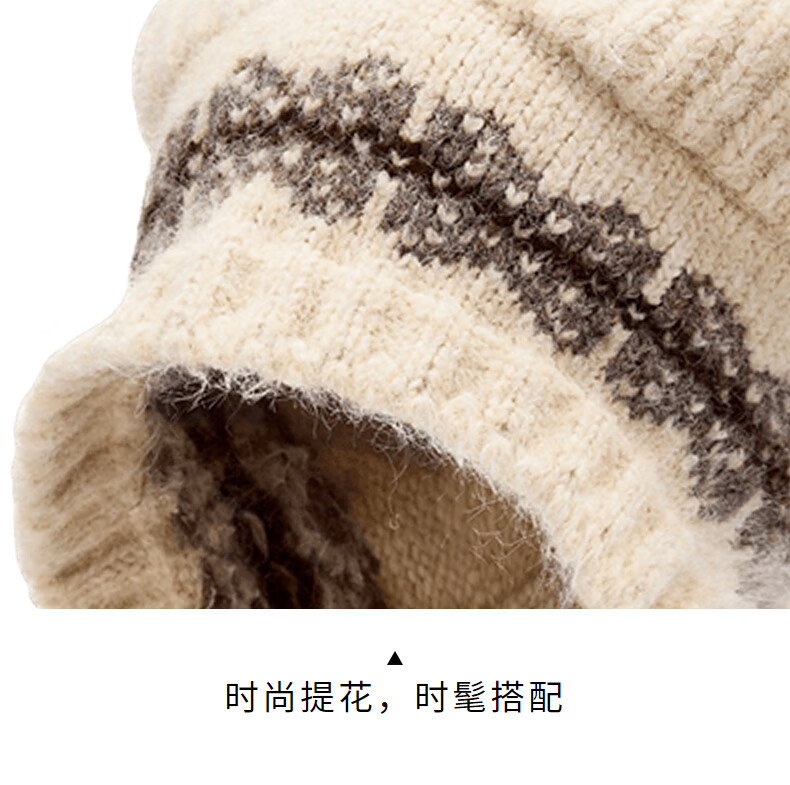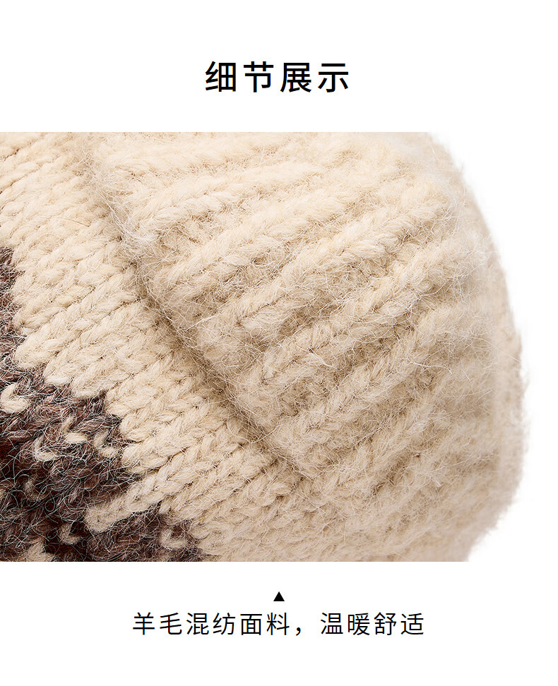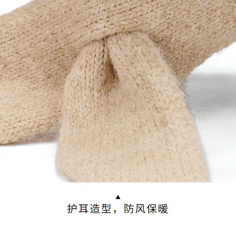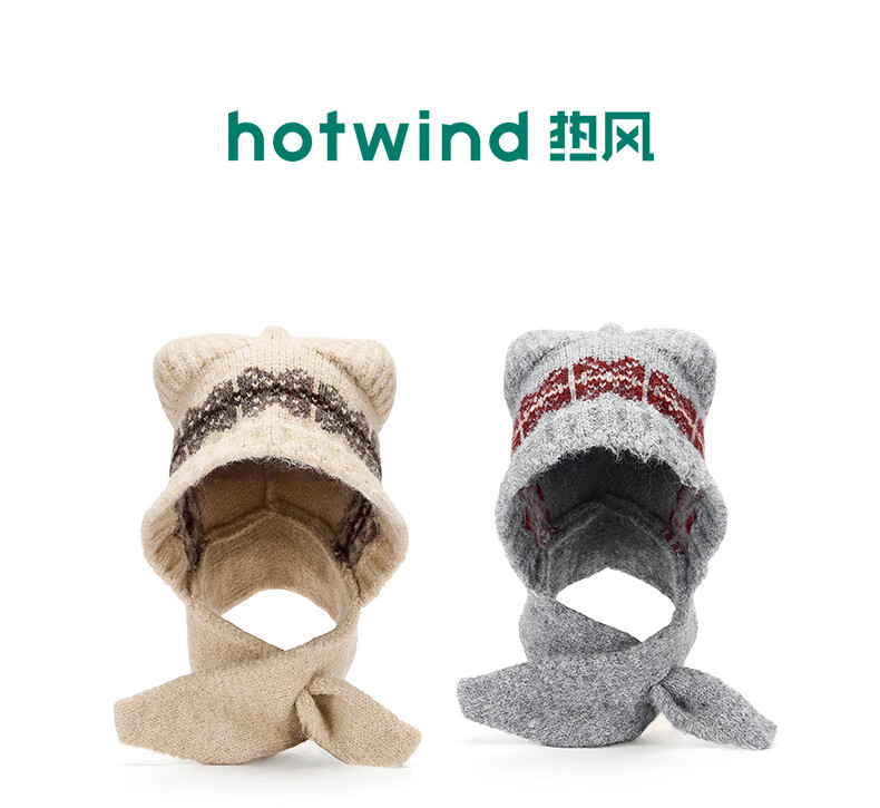 热风(Hotwind)女士帽子2025年冬季新款提花猫耳护耳毛线帽卡通二合一围巾 03米色 56-60cm
