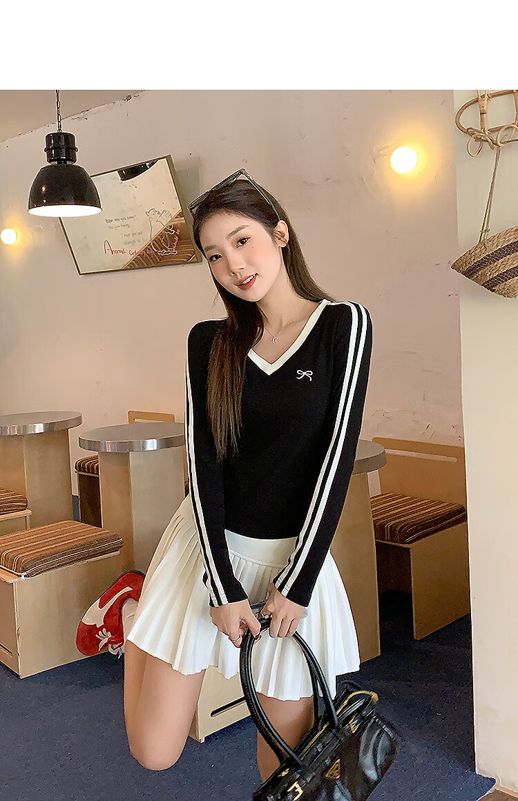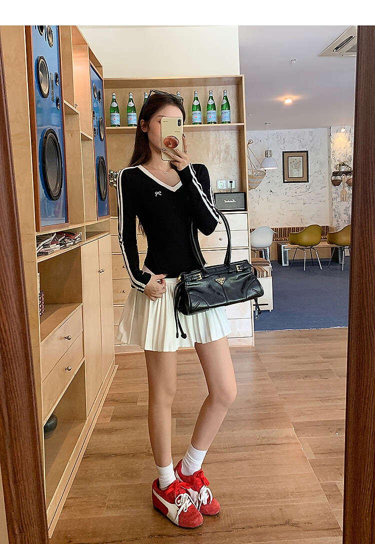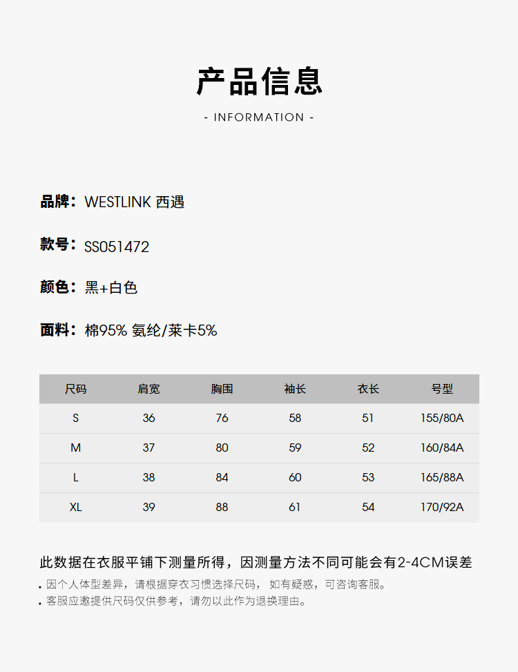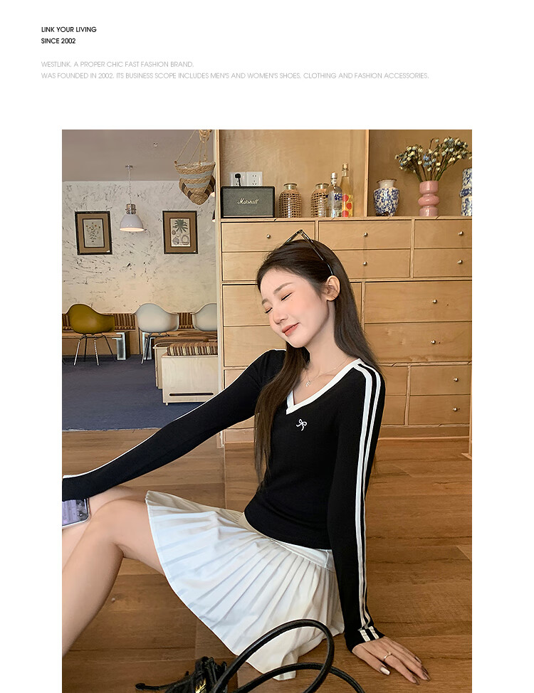 西遇(Westlink)西遇V领修身长袖T恤女2025年秋季新款撞色内搭打底衫正肩上衣 黑+白色 (预售15天) M (160)